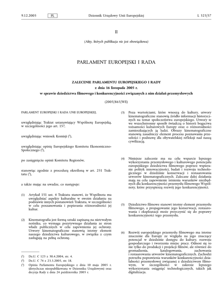 9.12.2005 Dziennik Urzędowy Unii Europejskiej PL L 323/57 II (Akty, których publikacja nie jest obowiązkowa) PARLAMENT EUROPEJSKI I RADA ZALECENIE PARLAMENTU EUROPEJSKIEGO I RADY z dnia 16 listopada 2005 r. w sprawie dziedzictwa filmowego i konkurencyjności związanych z nim działań przemysłowych (2005/865/WE) PARLAMENT EUROPEJSKI I RADA UNII EUROPEJSKIEJ, (3) Poza wartościami, które wnoszą do kultury, utwory kinematograficzne stanowią źródło informacji historycznych na temat społeczeństwa europejskiego. Utwory te we wszechstronny sposób świadczą o historii bogactwa tożsamości kulturowych Europy oraz o różnorodności zamieszkujących ją ludzi. Obrazy kinematograficzne stanowią zasadniczy element procesu poznawania przeszłości i podstawę dla obywatelskiej refleksji nad naszą cywilizacją. (4) Niniejsze zalecenie ma na celu wsparcie lepszego wykorzystania przemysłowego i kulturowego potencjału europejskiego dziedzictwa filmowego poprzez wspieranie polityk innowacyjności, badań i rozwoju technologicznego w dziedzinie konserwacji i restaurowania utworów kinematograficznych. Zalecane dalej działania mają na celu zapewnienie istnienia warunków niezbędnych dla konkurencyjności przemysłu filmowego Wspólnoty, które przyspieszą rozwój jego konkurencyjności. (5) Dziedzictwo filmowe stanowi istotny element przemysłu filmowego, a propagowanie jego konserwacji, restaurowania i eksploatacji może przyczynić się do poprawy konkurencyjności tego przemysłu. (6) Rozwój europejskiego przemysłu filmowego ma istotne znaczenie dla Europy ze względu na jego znaczący potencjał w dziedzinie dostępu do kultury, rozwoju gospodarczego i tworzenia miejsc pracy. Odnosi się to nie tylko do produkcji i projekcji filmów, ale również do gromadzenia, katalogowania, zachowania i restaurowania utworów kinematograficznych. Zachodzi potrzeba poprawienia warunków konkurencyjności działalności przemysłowej związanej z dziedzictwem filmowym, w szczególności w zakresie lepszego wykorzystania osiągnięć technologicznych, takich jak digitalizacja. uwzględniając Traktat ustanawiający Wspólnotę Europejską, w szczególności jego art. 157, uwzględniając wniosek Komisji (1), uwzględniając opinię Europejskiego Komitetu EkonomicznoSpołecznego (2), po zasięgnięciu opinii Komitetu Regionów, stanowiąc zgodnie z procedurą określoną w art. 251 Traktatu (3), a także mając na uwadze, co następuje: (1) (2) (1) (2) (3) Artykuł 151 ust. 4 Traktatu stanowi, że Wspólnota ma uwzględniać aspekty kulturalne w swoim działaniu na podstawie innych postanowień Traktatu, w szczególności w celu poszanowania i popierania różnorodności jej kultur. Kinematografia jest formą sztuki zapisaną na nietrwałym nośniku, co wymaga pozytywnego działania ze stron władz publicznych w celu zapewnienia jej ochrony. Utwory kinematograficzne stanowią istotny element naszego dziedzictwa kulturowego, w związku z czym zasługują na pełną ochronę. Dz.U. C 123 z 30.4.2004, str. 4. Dz.U. C 74 z 23.3.2005, str. 18. Opinia Parlamentu Europejskiego z dnia 10 maja 2005 r. (dotychczas nieopublikowana w Dzienniku Urzędowym) oraz decyzja Rady z dnia 24 października 2005 r. L 323/58 (7) (8) (9) PL Dziennik Urzędowy Unii Europejskiej Pełne osiągnięcie tego potencjału wymaga istnienia sprawnego i innowacyjnego przemysłu filmowego we Wspólnocie. Można to ułatwić poprzez poprawę warunków konserwacji, restaurowania i eksploatacji dziedzictwa filmowego, a także usunięcie przeszkód w rozwoju i pełnej konkurencyjności branży, w szczególności poprzez gromadzenie, katalogowanie, zachowanie i restaurowanie dziedzictwa filmowego oraz udostępnienie go do użytku oświatowego, kulturalnego, badawczego lub dla innych niekomercyjnych zastosowań o podobnym charakterze, zawsze z poszanowaniem praw autorskich i pokrewnych. Ogólna konkurencyjność przemysłu filmowego poprawi się dzięki tworzeniu warunków sprzyjających współpracy między wyznaczonymi organami, którymi mogą być europejskie, krajowe lub regionalne archiwa, instytuty filmowe lub podobne instytucje, w sprawach dotyczących konserwacji i ochrony dziedzictwa filmowego. Rezolucja Rady z dnia 26 czerwca 2000 r. w sprawie zachowania i podniesienia wartości dziedzictwa kina europejskiego (1) wzywa Państwa Członkowskie do współpracy w restaurowaniu i konserwacji dziedzictwa kinematograficznego, między innymi poprzez odwołanie się do technologii cyfrowych, do wymiany dobrych praktyk w tym sektorze, do propagowania stopniowego tworzenia europejskich sieci danych archiwalnych oraz do rozważenia możliwego wykorzystania tych zbiorów w celach edukacyjnych. (13) W swojej rezolucji z dnia 2 lipca 2002 r. (3) w sprawie komunikatu Komisji Parlament Europejski podkreślił znaczenie ochrony dziedzictwa kinematograficznego i poparł podejście wyrażone w Europejskiej konwencji o ochronie dziedzictwa audiowizualnego, która stanowi ważny punkt odniesienia w czasach nasilonych zmian technologicznych. Stopniowe przechodzenie na techniki cyfrowe umożliwi większą konkurencyjność europejskiego przemysłu filmowego i w dłuższym okresie przyczyni się do zmniejszenia kosztów katalogowania, deponowania, konserwacji i restaurowania utworów audiowizualnych. Jednocześnie stworzy nowe możliwości innowacji w dziedzinie ochrony dziedzictwa filmowego. (14) Rezolucja Rady z dnia 24 listopada 2003 r. w sprawie deponowania utworów kinematograficznych w Unii Europejskiej (4) zachęcała Państwa Członkowskie do wdrożenia skutecznego systemu deponowania i zachowania utworów kinematograficznych stanowiących część ich dziedzictwa audiowizualnego w swoich archiwach krajowych, instytutach filmowych lub podobnych instytucjach, jeżeli takie systemy jeszcze nie istnieją. (15) Wszystkie Państwa Członkowskie posiadają już systemy gromadzenia i zachowania utworów kinematograficznych stanowiących część ich