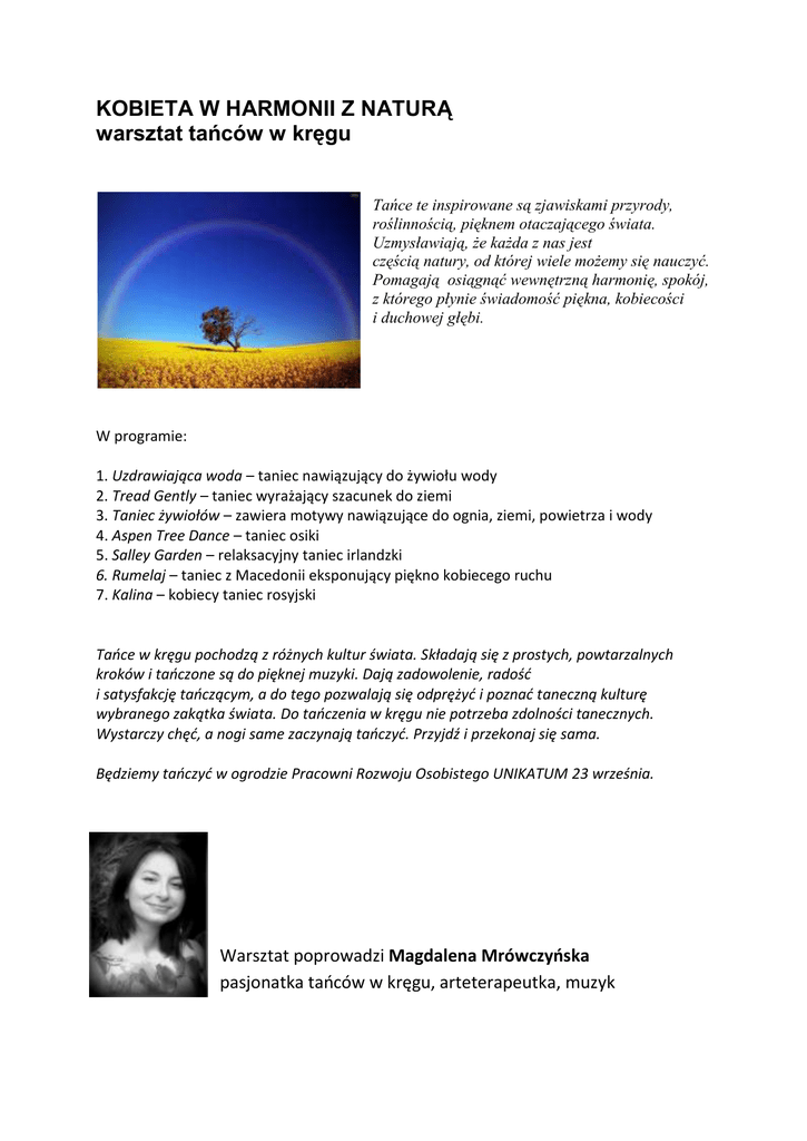 KOBIETA W HARMONII Z NATURĄ warsztat tańców w kręgu Tańce te inspirowane są zjawiskami przyrody, roślinnością, pięknem otaczającego świata. Uzmysławiają, że każda z nas jest częścią natury, od której wiele możemy się nauczyć. Pomagają osiągnąć wewnętrzną harmonię, spokój, z którego płynie świadomość piękna, kobiecości i duchowej głębi. W programie: 1. Uzdrawiająca woda – taniec nawiązujący do żywiołu wody 2. Tread Gently – taniec wyrażający szacunek do ziemi 3. Taniec żywiołów – zawiera motywy nawiązujące do ognia, ziemi, powietrza i wody 4. Aspen Tree Dance – taniec osiki 5. Salley Garden – relaksacyjny taniec irlandzki 6. Rumelaj – taniec z Macedonii eksponujący piękno kobiecego ruchu 7. Kalina – kobiecy taniec rosyjski Tańce w kręgu pochodzą z różnych kultur świata. Składają się z prostych, powtarzalnych kroków i tańczone są do pięknej muzyki. Dają zadowolenie, radość i satysfakcję tańczącym, a do tego pozwalają się odprężyć i poznać taneczną kulturę wybranego zakątka świata. Do tańczenia w kręgu nie potrzeba zdolności tanecznych. Wystarczy chęć, a nogi same zaczynają tańczyć. Przyjdź i przekonaj się sama. Będziemy tańczyć w ogrodzie Pracowni Rozwoju Osobistego UNIKATUM 23 września. Warsztat poprowadzi Magdalena Mrówczyńska pasjonatka tańców w kręgu, arteterapeutka, muzyk