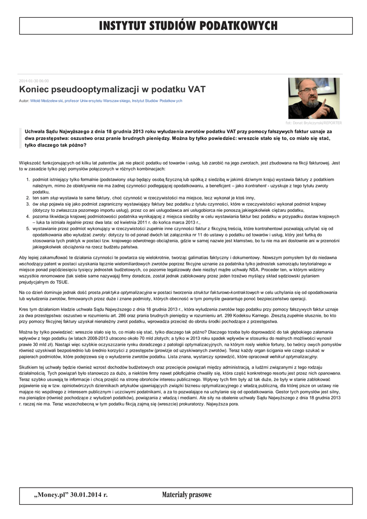 INSTYTUT STUDIÓW PODATKOWYCH 2014-01-30 06:00 Koniec pseudooptymalizacji w podatku VAT Autor: Witold Modzelew ski, profesor Uniw ersytetu Warszaw skiego, Instytut Studiów Podatkow ych fot: Donat Brykczynski/REPORTER Uchwała Sądu Najwyższego z dnia 18 grudnia 2013 roku wyłudzenia zwrotów podatku VAT przy pomocy fałszywych faktur uznaje za dwa przestępstwa: oszustwo oraz pranie brudnych pieniędzy. Można by tylko powiedzieć: wreszcie stało się to, co miało się stać, tylko dlaczego tak późno? Większość funkcjonujących od kilku lat patentów, jak nie płacić podatku od towarów i usług, lub zarobić na jego zwrotach, jest zbudowana na fikcji fakturowej. Jest to w zasadzie tylko pięć pomysłów połączonych w różnych kombinacjach: 1. podmiot istniejący tylko formalnie (podstawiony słup będący osobą fizyczną lub spółką z siedzibą w jakimś dziwnym kraju) wystawia faktury z podatkiem należnym, mimo że obiektywnie nie ma żadnej czynności podlegającej opodatkowaniu, a beneficjent – jako k ontrahent - uzyskuje z tego tytułu zwroty podatku, 2. ten sam słup wystawia te same faktury, choć czynność w rzeczywistości ma miejsce, lecz wykonał je ktoś inny, 3. ów słup pojawia się jako podmiot zagraniczny wystawiający faktury bez podatku z tytułu czynności, które w rzeczywistości wykonał podmiot krajowy (dotyczy to zwłaszcza pozornego importu usług), przez co ani usługodawca ani usługobiorca nie ponoszą jakiegokolwiek ciężaru podatku, 4. pozorna likwidacja krajowej podmiotowości podatnika wynikającej z miejsca siedziby w celu wystawiania faktur bez podatku w przypadku dostaw krajowych – luka ta istniała legalnie przez dwa lata: od kwietnia 2011 r. do końca marca 2013 r., 5. wystawianie przez podmiot wykonujący w rzeczywistości zupełnie inne czynności faktur z fikcyjną treścią, które kontrahentowi pozwalają uchylać się od opodatkowania albo wyłudzać zwroty: dotyczy to od ponad dwóch lat załącznika nr 11 do ustawy o podatku od towarów i usług, który jest furtką do stosowania tych praktyk w postaci tzw. krajowego odwrotnego obciążenia, gdzie w samej nazwie jest kłamstwo, bo tu nie ma ani dosłownie ani w przenośni jakiegokolwiek obciążenia na rzecz budżetu państwa. Aby lepiej zakamuflować te działania czynności te powtarza się wielokrotnie, tworząc galimatias faktyczny i dokumentowy. Nowszym pomysłem był do niedawna wschodzący patent w postaci uzyskania łącznie wielomiliardowych zwrotów poprzez fikcyjne uznanie za podatnika tylko jednostek samorządu terytorialnego w miejsce ponad pięćdziesięciu tysięcy jednostek budżetowych, co pozornie legalizowały dwie niezbyt mądre uchwały NSA. Proceder ten, w którym widzimy wszystkie renomowane (tak siebie same nazywają) firmy doradcze, został jednak zablokowany przez jeden trzeźwo myślący skład sędziowski pytaniem prejudycjalnym do TSUE. Na co dzień dominuje jednak dość prosta prak tyk a optymalizacyjna w postaci tworzenia struk tur fak turowo-k ontrak towych w celu uchylania się od opodatkowania lub wyłudzenia zwrotów, firmowanych przez duże i znane podmioty, których obecność w tym pomyśle gwarantuje ponoć bezpieczeństwo operacji. Kres tym działaniom kładzie uchwała Sądu Najwyższego z dnia 18 grudnia 2013 r., która wyłudzenia zwrotów tego podatku przy pomocy fałszywych faktur uznaje za dwa przestępstwa: oszustwo w rozumieniu art. 286 oraz prania brudnych pieniędzy w rozumieniu art. 299 Kodeksu Karnego. Zresztą zupełnie słusznie, bo kto przy pomocy fikcyjnej faktury uzyskał nienależny zwrot podatku, wprowadza przecież do obrotu środki pochodzące z przestępstwa. Można by tylko powiedzieć: wreszcie stało się to, co miało się stać, tylko dlaczego tak późno? Dlaczego trzeba było doprowadzić do tak głębokiego załamania wpływów z tego podatku (w latach 2008-2013 utracono około 70 mld złotych; a tylko w 2013 roku spadek wpływów w stosunku do realnych możliwości wynosił prawie 30 mld zł). Nastąpi więc szybkie oczyszczanie rynku doradczego z patologii optymalizacyjnych, na którym rosły wielkie fortuny, bo twórcy owych pomysłów również uzyskiwali bezpośrednio lub średnio korzyści z przestępstw (prowizje od uzyskiwanych zwrotów). Teraz każdy organ ścigania wie czego szukać w papierach podmiotów, które podejrzewa się o wyłudzenie zwrotów podatku. Lista znana, wystarczy sprawdzić, które opracował wehik uł optymalizacyjny. Skutkiem tej uchwały będzie również wzrost dochodów budżetowych oraz przecięcie powiązań między administracją, a ludźmi związanymi z tego rodzaju działalnością. Tych powiązań było stanowczo za dużo, a niektóre firmy nawet półoficjalnie chwaliły się, która część konkretnego resortu jest przez nich opanowana. Teraz szybko usuwają te informacje i chcą przejść na stronę obrońców interesu publicznego. Wpływy tych firm były aż tak duże, że były w stanie zablokować pojawienie się w tzw. opiniotwórczych dziennikach artykułów ujawniających związki biznesu optymalizacyjnego z władzą publiczną, dla której pisze on ustawy nie mające nic wspólnego z interesem publicznym i uczciwymi podatnikami, a za to pozwalające na uchylanie się od opodatkowania. Gestor tych pomysłów jest silny, ma pieniądze (również pochodzące z wyłudzeń podatków), powiązania z władzą i mediami. Ale siły na obalenie uchwały Sądu Najwyższego z dnia 18 grudnia 2013 r. raczej nie ma. Teraz wszechobecną w tym podatku fikcją zajmą się (wreszcie) prokuratorzy. Najwyższa pora. „Money.pl” 30.01.2014 r. Materia³y prasowe