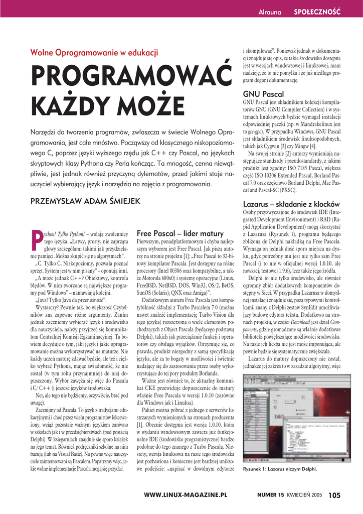 Alrauna Wolne Oprogramowanie w edukacji PROGRAMOWAĆ KAŻDY MOŻE Narzędzi do tworzenia programów, zwłaszcza w świecie Wolnego Oprogramowania, jest całe mnóstwo. Począwszy od klasycznego niskopoziomowego C, poprzez języki wyższego rzędu jak C++ czy Pascal, na językach skryptowych klasy Pythona czy Perla kończąc. Ta mnogość, cenna niewątpliwie, jest jednak również przyczyną dylematów, przed jakimi staje nauczyciel wybierający język i narzędzia na zajęcia z programowania. PRZEMYSŁAW ADAM ŚMIEJEK P ython! Tylko Python! – wołają zwolennicy tego języka. „Łatwy, prosty, nie zaprząta głowy szczegółami takimi jak przydzielanie pamięci. Można skupić się na algorytmach”. „C. Tylko C. Niskopoziomy, pozwala poznać sprzęt. System jest w nim pisany” – oponują inni. „A może jednak C++? Obiektowy, kontrola błędów. W nim tworzone są największe programy pod Windows” – namawiają kolejni. „Java! Tylko Java da przenośność”. Wystarczy? Pewnie tak, bo większość Czytelników zna zapewne różne argumenty. Zanim jednak zaczniemy wybierać język i środowisko dla nauczyciela, należy przyjrzeć się komunikatom Centralnej Komisji Egzaminacyjnej. Ta bowiem decyduje o tym, jaki język i jakie oprogramowanie można wykorzystywać na maturze. Nie każdy uczeń maturę zdawać będzie, ale też i ciężko wybrać Pythona, mając świadomość, że nie został (w tym roku przynajmniej) do niej dopuszczony. Wybór zawęża się więc do Pascala i C/ C++ (i jeszcze języków środowiska. Net, ale tego nie będziemy, oczywiście, brać pod uwagę). Zacznijmy od Pascala. To język z tradycjami edukacyjnymi i choć przez wielu programistów lekceważony, wciąż pozostaje ważnym językiem zarówno w szkołach jak i w przedsiębiorstwach (pod postacią Delphi). W księgarniach znajduje się sporo książek na jego temat. Również podręczniki szkolne na nim bazują (lub na Visual Basic). Na pewno więc nauczyciele zainteresowani są Pascalem. Popatrzmy więc, jakie wolne implementacje Pascala mogą się przydać. SPOŁECZNOŚĆ i skompilować”. Ponieważ jednak w dokumentacji znajduje się opis, że takie środowisko dostępne jest w wersjach windowsowej i linuksowej, mam nadzieję, że to nie pomyłka i że już niedługo program dogoni dokumentację. GNU Pascal GNU Pascal jest składnikiem kolekcji kompilatorów GNU (GNU Compiler Collection) i w systemach linuksowych będzie wymagał instalacji odpowiedniej paczki (np. w Mandrakelinux jest to gcc-gpc). W przypadku Windows, GNU Pascal jest składnikiem środowisk linuksopodobnych, takich jak Cygwin [3] czy Mingw [4]. Na swojej stronie [2] autorzy wymieniają następujące standardy i pseudostandardy, z jakimi produkt jest zgodny: ISO 7185 Pascal, większa część ISO 10206 Extended Pascal, Borland Pascal 7.0 oraz częściowo Borland Delphi, Mac Pascal and Pascal-SC (PXSC). Lazarus – składanie z klocków Free Pascal – lider matury Pierwszym, ponadplatformowym i chyba najlepszym wyborem jest Free Pascal. Jak piszą autorzy na stronie projektu [1]: „Free Pascal to 32-bitowy kompilator Pascala. Jest dostępny na różne procesory (Intel 80386 oraz kompatybilne, a także Motorola 680x0) i systemy operacyjne (Linux, FreeBSD, NetBSD, DOS, Win32, OS/2, BeOS, SunOS (Solaris), QNX oraz Amiga)”. Dodatkowym atutem Free Pascala jest kompatybilność składni z Turbo Pascalem 7.0 (można nawet znaleźć implementację Turbo Vision dla tego języka) rozszerzona o wiele elementów pochodzących z Object Pascala (będącego podstawą Delphi), takich jak przeciążanie funkcji i operatorów czy obsługa wyjątków. Otrzymuje się, co prawda, produkt niezgodny z samą specyfikacją języka, ale za to bogaty w możliwości i świetnie nadający się do zastosowania przez osoby wykorzystujące do tej pory produkty Borlanda. Ważne jest również to, że aktualny komunikat CKE przewiduje dopuszczenie do matury właśnie Free Pascala w wersji 1.0.10 (zarówno dla Windows jak i Linuksa). Pakiet można pobrać z jednego z serwerów lustrzanych wymienionych na stronach producenta [1]. Obecnie dostępna jest wersja 1.0.10, która w wydaniu windowsowym zawiera już funkcjonalne IDE (środowisko programistyczne) bardzo podobne do tego znanego z Turbo Pascala. Niestety, wersja linuksowa na razie tego środowiska jest pozbawiona i konieczne jest bardziej uniksowe podejście: „napisać w dowolnym edytorze WWW.LINUX-MAGAZINE.PL Osoby przyzwyczajone do środowisk IDE (Integrated Development Environiment) i RAD (Rapid Application Development) mogą skorzystać z Lazarusa (Rysunek 1), programu będącego zbliżoną do Delphi nakładką na Free Pascala. Wymaga on jednak dość sporo miejsca na dysku, gdyż potrzebny mu jest nie tylko sam Free Pascal (i to nie w oficjalnej wersji 1.0.10, ale nowszej, testowej 1.9.6), lecz także jego źródła. Delphi to nie tylko środowisko, ale również ogromny zbiór dodatkowych komponentów dostępny w Sieci. W przypadku Lazarusa w domyślnej instalacji znajduje się, poza typowymi kontrolkami, znany z Delphi zestaw SynEdit umożliwiający budowę edytora tekstu. Dodatkowo na stronach projektu, w części Download jest dział Components, gdzie gromadzone są właśnie dodatkowe biblioteki powiększające możliwości środowiska. Na razie ich liczba nie jest może imponująca, ale pewnie będzie się systematycznie zwiększała. Lazarus do matury dopuszczony nie został, jednakże jej zakres to w zasadzie algorytmy, więc Rysunek 1: Lazarus niczym Delphi. NUMER 15 KWIECIEŃ 2005 105 SPOŁECZNOŚĆ Alrauna użycie Lazarusa na zajęciach, jako nakładki na Free Pascala, wymaga jedynie późniejszego przećwiczenia z przyszłymi maturzystami sposobu korzystania z „gołego” kompilatora. Dev-Pascal Kolejnym IDE, tym razem działającym pod Windows, jest Dev-Pascal (Rysunek 2). To narzędzie bazuje na Free Pascalu lub na GNU Pascalu. Wydaje się być świetnym wyborem ze świata Wol