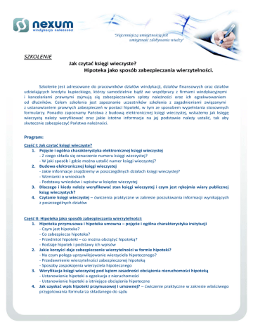 "Najcenniejszą umiejętnością jest umiejętność zdobywania wiedzy" SZKOLENIE Jak czytać księgi wieczyste? Hipoteka jako sposób zabezpieczania wierzytelności. Szkolenie jest adresowane do pracowników działów windykacji, działów finansowych oraz działów udzielających kredytu kupieckiego, którzy samodzielnie bądź we współpracy z firmami windykacyjnymi i kancelariami prawnymi zajmują się zabezpieczaniem spłaty należności oraz ich egzekwowaniem od dłużników. Celem szkolenia jest zapoznanie uczestników szkolenia z zagadnieniami związanymi z ustanawianiem prawnych zabezpieczeń w postaci hipoteki, w tym ze sposobem wypełniania stosownych formularzy. Ponadto zapoznamy Państwa z budową elektronicznej księgi wieczystej, wskażemy jak księgę wieczystą należy weryfikować oraz jakie istotne informacje na jej podstawie należy ustalić, tak aby skutecznie zabezpieczyć Państwa należności. Program: Część I: Jak czytać księgi wieczyste? 1. Pojęcie i ogólna charakterystyka elektronicznej księgi wieczystej ‐ Z czego składa się oznaczenie numeru księgi wieczystej? ‐ W jaki sposób i gdzie można ustalić numer księgi wieczystej? 2. Budowa elektronicznej księgi wieczystej ‐ Jakie informacje znajdziemy w poszczególnych działach księgi wieczystej? ‐ Wzmianki o wnioskach ‐ Podstawy wniosków i wpisów w księdze wieczystej 3. Dlaczego i kiedy należy weryfikować stan księgi wieczystej i czym jest rękojmia wiary publicznej ksiąg wieczystych? 4. Czytanie księgi wieczystej – ćwiczenia praktyczne w zakresie poszukiwania informacji wynikających z poszczególnych działów Część II: Hipoteka jako sposób zabezpieczania wierzytelności: 1. Hipoteka przymusowa i hipoteka umowna – pojęcie i ogólna charakterystyka instytucji ‐ Czym jest hipoteka? ‐ Co zabezpiecza hipoteka? ‐ Przedmiot hipoteki – co można obciążyć hipoteką? ‐ Rodzaje hipotek i podstawy ich wpisów 2. Jakie korzyści daje zabezpieczenie wierzytelności w formie hipoteki? ‐ Na czym polega uprzywilejowanie wierzyciela hipotecznego? ‐ Przedawnienie wierzytelności zabezpieczonej hipoteką ‐ Sposoby zaspokojenia wierzyciela hipotecznego 3. Weryfikacja księgi wieczystej pod kątem zasadności obciążenia nieruchomości hipoteką ‐ Ustanowienie hipoteki a egzekucja z nieruchomości ‐ Ustanowienie hipoteki a istniejące obciążenia hipoteczne 4. Jak uzyskać wpis hipoteki przymusowej i umownej? – ćwiczenie praktyczne w zakresie właściwego przygotowania formularza składanego do sądu