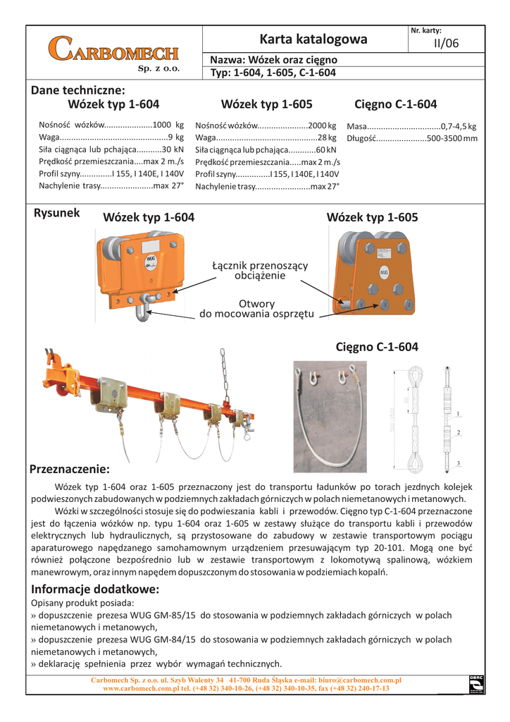 Karta katalogowa Nr. karty: Nazwa: Wózek oraz cięgno Typ: 1-604, 1-605, C-1-604 Dane techniczne: Wózek typ 1-604 Nośność wózków.....................1000 kg Waga...............................................9 kg Siła ciągnąca lub pchająca...........30 kN Prędkość przemieszczania....max 2 m./s Profil szyny..............I 155, I 140E, I 140V Nachylenie trasy.......................max 27° Rysunek Wózek typ 1-605 II/06 Cięgno C-1-604 Nośność wózków......................2000 kg Masa................................0,7-4,5 kg Waga............................................28 kg Długość......................500-3500 mm Siła ciągnąca lub pchająca............60 kN Prędkość przemieszczania.....max 2 m./s Profil szyny...............I 155, I 140E, I 140V Nachylenie trasy........................max 27° Wózek typ 1-604 Wózek typ 1-605 Łącznik przenoszący obciążenie Otwory do mocowania osprzętu Cięgno C-1-604 Przeznaczenie: Wózek typ 1-604 oraz 1-605 przeznaczony jest do transportu ładunków po torach jezdnych kolejek podwieszonych zabudowanych w podziemnych zakładach górniczych w polach niemetanowych i metanowych. Wózki w szczególności stosuje się do podwieszania kabli i przewodów. Cięgno typ C-1-604 przeznaczone jest do łączenia wózków np. typu 1-604 oraz 1-605 w zestawy służące do transportu kabli i przewodów elektrycznych lub hydraulicznych, są przystosowane do zabudowy w zestawie transportowym pociągu aparaturowego napędzanego samohamownym urządzeniem przesuwającym typ 20-101. Mogą one być również połączone bezpośrednio lub w zestawie transportowym z lokomotywą spalinową, wózkiem manewrowym, oraz innym napędem dopuszczonym do stosowania w podziemiach kopalń. Informacje dodatkowe: Opisany produkt posiada: » dopuszczenie prezesa WUG GM-85/15 do stosowania w podziemnych zakładach górniczych w polach niemetanowych i metanowych, » dopuszczenie prezesa WUG GM-84/15 do stosowania w podziemnych zakładach górniczych w polach niemetanowych i metanowych, » deklarację spełnienia przez wybór wymagań technicznych. Carbomech Sp. z o.o. ul. Szyb Walenty 34 41-700 Ruda Śląska e-mail: [email protected] www.carbomech.com.pl tel. (+48 32) 340-10-26, (+48 32) 340-10-35, fax (+48 32) 240-17-13