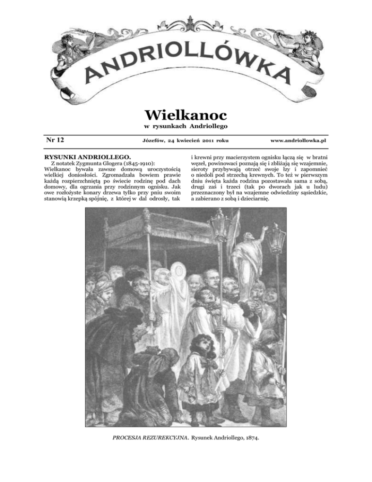 Wielkanoc w rysunkach Andriollego Nr 12 Józefów, 24 kwiecień 2011 roku RYSUNKI ANDRIOLLEGO. Z notatek Zygmunta Glogera (1845-1910): Wielkanoc bywała zawsze domową uroczystością wielkiej doniosłości. Zgromadzała bowiem prawie każdą rozpierzchniętą po świecie rodzinę pod dach domowy, dla ogrzania przy rodzinnym ognisku. Jak owe rozłożyste konary drzewa tylko przy pniu swoim stanowią krzepką spójnię, z której w dal odrosły, tak www.andriollowka.pl i krewni przy macierzystem ognisku łączą się w bratni węzeł, powinowaci poznają się i zbliżają się wzajemnie, sieroty przybywają otrzeć swoje łzy i zapomnieć o niedoli pod strzechą krewnych. To też w pierwszym dniu święta każda rodzina pozostawała sama z sobą, drugi zaś i trzeci (tak po dworach jak u ludu) przeznaczony był na wzajemne odwiedziny sąsiedzkie, a zabierano z sobą i dzieciarnię. PROCESJA REZUREKCYJNA. Rysunek Andriollego, 1874. „Zwykle w pośrodku wielkiego stołu – powiada Kraszewski – stał baranek z chorągiewką z cukru lub z masła... w końcu stołu głowa dzika z chrzanem w pysku... półmiski jaj otoczonych wędzonemi kiełbasami itp. Spotykając się w święta i ściskając mężczyźni witali się słowami: Resurexit sicut dixit, Alleluja! Dzieląc się jajkiem święconem, starym obyczajem, brano je nie widelcem, ale palcami.” ŚWIĘCONE. Rysunek Andriollego, 1873 W dniu drugim śmigus, czyli dyngus rozweselał młodzież, zarówno po dworach, jak zaściankach i chatach wiejskich, z tą tylko różnicą, że gdy w pierwszych opryskiwano znienacka lub za kołnierz pachnącemi wódkami, to u ludu zwykłą miarą był garnczek, lub wiadro wody, a często pod kubłem przy studni, doszczętna kąpiel, przytrzymanej przez parobczaków dziewki, lub odwrotnie. Wszystkim zainteresowanym tematem życia i twórczości Andriollego polecamy - wydany z okazji 175. rocznicy urodzin artysty oraz w 130. rocznicę powstania ilustracji do Pana Tadeusza – album pt. Andriolli w sztuce i życiu społecznym, który zawiera ponad 300 rysunków, w tym 28 utworów dotąd nie reprodukowanych. Szczegóły oraz adresy miejsc, w których album można obejrzeć i ewentualnie zakupić zawiera biuletyn Nr 11 na www.andriollowka.pl ŚMIGUS. Rysunek Andriollego, 1882. www.andriolli.pl www.swidermajer.pl _________________________________________________________________________________________________________________ © Copyright by Robert Lewandowski, Józefów 2011, ISSN 2081-0830, Tel. 605 035 774 2