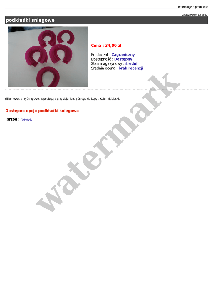 Informacje o produkcie Utworzono 04-03-2017 podkładki śniegowe Cena : 34,00 zł er m ar k Producent : Zagraniczny Dostępność : Dostępny Stan magazynowy : średni Średnia ocena : brak recenzji silikonowe , antyśniegowe, zapobiegają przyklejaniu się śniegu do kopyt. Kolor niebieski. Dostępne opcje podkładki śniegowe w at przód: różowe.