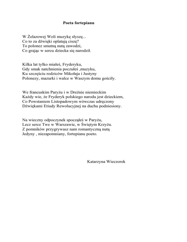 Poeta fortepianu W Żelazowej Woli muzykę słyszę... Co to za dźwięki oplatają ciszę? To polonez smutną nutą zawodzi, Co grając w sercu dziecka się narodził. Kilka lat tylko miałeś, Fryderyku, Gdy smak natchnienia poczułeś ,muzyku, Ku szczęściu rodziców Mikołaja i Justyny Polonezy, mazurki i walce w Waszym domu gościły. We francuskim Paryżu i w Dreźnie niemieckim Każdy wie, że Fryderyk polskiego narodu jest dzieckiem, Co Powstaniem Listopadowym wówczas udręczony Dźwiękami Etiudy Rewolucyjnej na duchu podniesiony. Na wieczny odpoczynek spocząłeś w Paryżu, Lecz serce Twe w Warszawie, w Świętym Krzyżu. Z pomników przygrywasz nam romantyczną nutą Jedyny , niezapomniany, fortepianu poeto. Katarzyna Wieczorek