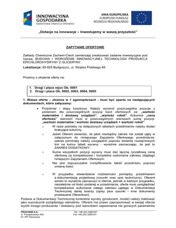 ,,Dotacje na innowacje – Inwestujemy w waszą przyszłość” ZAPYTANIE OFERTOWE Zakłady Chemiczne Zachem-Ciech zamierzają zrealizować zadanie inwestycyjne pod nazwą: BUDOWA I WDROŻENIE INNOWACYJNEJ TECHNOLOGII PRODUKCJI EPICHLOROHYDRYNY Z GLICERYNY. Lokalizacja: 85-825 Bydgoszcz, ul. Wojska Polskiego 65 Prosimy o złożenie oferty na: 1. Drogi i place rejon Ob. 0001 2. Drogi i place Ob. 0002, 0003, 0004, 0005 1. Wasza oferta – złożona w 1 egzemplarzach - musi być oparta na następujących dokumentach, które załączamy: • Przedmiar / ślepy kosztorys. Należy wycenić poszczególne pozycje z podaniem dla poszczególnych pozycji kwot ofertowych za: „wartość materiałów / dostawy urządzeń”, „wartość robót”. Kolumna „cena ofertowa” stanowić musi w poszczególnych wierszach sumę pozycji: „wartość materiałów / wartość dostawy urządzeń + wartość robót”. o W razie potrzeby na dołączonych tabelach przedmiarów należy dodać brakujące kolumny. o Jeżeli Oferent stwierdzi, że jakiś niezbędny zakres nie został ujęty w załączonym do niniejszego Zapytania Ofertowego przedmiarze, zakres pominięty należy uwzględnić poprzez dodanie nowej/nowych linii na końcu tabeli wyceny - wyraźnie zaznaczając, że jest to ZAKRES DODATKOWY. o Suma wszystkich pozycji wyceny musi dać łączną ryczałtową cenę ofertową za kompleksowe i kompletne wykonanie zakresu objętego niniejszym Zapytaniem Ofertowym. o Nie jest dopuszczalne modyfikowanie tabeli przedmiaru poprzez zmianę ilości. W przypadku stwierdzenia rozbieżności pomiędzy przedmiarem a dokumentacją projektową (rysunki oraz opis techniczny), Oferent winien to wyraźnie zaznaczyć w ofercie, jednak w każdym przypadku, niezależnie od ilości podanej w przedmiarze, oferta musi uwzględniać kompleksowe wykonanie całego zakresu ujętego w Dokumentacji Technicznej danej branży (opisy plus rysunki i inne dokumenty przekazane Oferentowi). Podane w Dokumentacji Technicznej konkretne wyroby (producent, model) należy traktować jako wyznacznik pożądanego standardu. Oferent ma prawo zaproponować w swojej ofercie wyrób innego producenta / dostawcy pod warunkiem zapewnienia nie gorszych parametrów o PROCHEM S.A. ul. Powązkowska 44C 01-797 Warszawa Tel. +48 (22) 3260167 Fax.+48 (22) 3260101 ,,Dotacje na innowacje – Inwestujemy w waszą przyszłość” techniczno-użytkowych oraz zapewnienia wymaganych świadectw, aprobat, certyfikatów i poświadczeń dla takiego wyrobu. Każdy taki przypadek musi być wyraźnie zaznaczony w ofercie jak również model, typ, producent i parametry proponowanego wyrobu muszą być w ofercie jednoznacznie określone. Przed zamówieniem i wbudowaniem zamiennika konieczna będzie akceptacja Inwestora oraz projektanta. o Dopuszczalne jest złożenie oferty zawierającej kilka opcji alternatywnych propozycji Oferenta - pod warunkiem zachowania przejrzystości i czytelności oferty oraz jednoznaczności poszczególnych opcji. Opcje należy przedstawić poprzez dodanie nowej/nowych linii na końcu tabeli wyceny - wyraźnie zaznaczając, że jest to OPCJA. Komplet dokumentów technicznych: wraz z przedmiarami robót : a) Zeszyt 2-3 Projekt techniczny Ob. 0001 b) Zeszyt 10-1.1 Przedmiar robót Ob. 0001 c) Zeszyt 2-15 Projekt techniczny Ob. 0002, 0003, 0004, 0005 d) Zeszyt 10-1.12 Przedmiar robót Ob. 0002, 0003, 0004, 0005 o • 2. Oferta oraz cena ofertowa obejmować musi wszelkie dostawy, koszty i nakłady, konieczne do kompletnego wykonania zadania ujętego w dokumentacji i dokumentach technicznych nawet jeżeli nie zostały one odrębnie wyspecyfikowane, ale ich wykonanie będzie niezbędne do dostarczenia i wykonania kompletnego zakresu podanego w dokumentacji technicznej. W szczególności, ale nie wyłącznie, oferta i cena ofertowa obejmować muszą: o o o o o o o o o o PROCHEM S.A. ul. Powązkowska 44C 01-797 Warszawa Tyczenia i pomiary geodezyjne oraz geodezyjną inwentaryzację powykonawcza; Komplet materiałów budowlanych, instalacyjnych i montażowych dla zakresu Oferenta; Komplet koniecznych robót, w tym zabezpieczenie terenu robót a także zabezpieczenie sąsiadujących stref od wpływu robót Oferenta; Utylizację odpadów z budowy zgodnie z obowiązującymi przepisami, wytwórcą odpadów pozostaje Wykonawca; Wywóz nadmiaru ziemi poza teren zakładu. Tabliczki i znaki informacyjne, znakowanie elementów instalacji, przewodów, tras, urządzeń i pomieszczeń – dla zakresu Oferenta; Dokumentację powykonawczą z budowy, z kolorowo naniesionymi zmianami wprowadzonymi przez Oferenta, poświadczonymi przez projektanta oraz inspektora nadzoru inwestorskiego oraz rejestrowanymi na bieżąco wpisami w Dzienniku Budowy. Wyposażenie pracowników w sprzęt ochrony dróg oddechowych maski gazowe ewakuacyjne (ucieczkowe) Termin płatności 60 dni. Termin realizacji oferowanych robót: Tel. +48 (22) 3260167 Fax.+48 (22) 3260101 ,,Dotacje na innowacje – Inwestujemy w waszą przyszłość” - zakończenie 30.11.2011 3. Ofertę prosimy przygotować: a) wersji elektronicznej wraz z kompletem załączników prosimy dostarczyć do dnia 17.08.2011 godz. 12.00 na następujący adres: [email protected] [email protected] 4. Informujemy, że zastrzegamy sobie prawo do: a) przeprowadzenia negocjacji z wybranymi oferentami, b) odrzucenia wszystkich ofert, lub c) złożenia zamówienia tylko na część oferowanego zakresu. 5. Wskazówki dla oferentów Oferta musi jasno potwierdzać gotowość Oferenta do dostosowania kolejności i tempa robót do udostępnionego przez innych wykonawców bądź Inwestora frontu robót w tym gotowość do wykonywania robót również podczas 2-giej i 3-ciej zmiany a razie zagrożenia terminów również w dni wolne od pracy - z własnej inicjatywy lub na wniosek Inwestora. • Oferta musi zawierać potwierdzenie, że wszystkie ceny są w PLN, dla towaru dostarczonego na budowę „Zachem , ul. Wojska Polskiego 65, 85-825 Bydgos