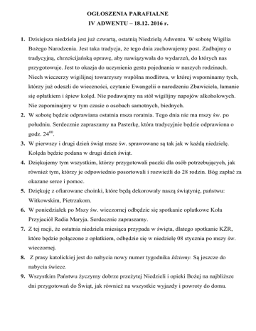 OGŁOSZENIA PARAFIALNE IV ADWENTU – 18.12. 2016 r. 1. Dzisiejsza niedziela jest już czwartą, ostatnią Niedzielą Adwentu. W sobotę Wigilia Bożego Narodzenia. Jest taka tradycja, że tego dnia zachowujemy post. Zadbajmy o tradycyjną, chrześcijańską oprawę, aby nawiązywała do wydarzeń, do których nas przygotowuje. Jest to okazja do uczynienia gestu pojednania w naszych rodzinach. Niech wieczerzy wigilijnej towarzyszy wspólna modlitwa, w której wspominamy tych, którzy już odeszli do wieczności, czytanie Ewangelii o narodzeniu Zbawiciela, łamanie się opłatkiem i śpiew kolęd. Nie podawajmy na stół wigilijny napojów alkoholowych. Nie zapominajmy w tym czasie o osobach samotnych, biednych. 2. W sobotę będzie odprawiana ostatnia msza roratnia. Tego dnia nie ma mszy św. po południu. Serdecznie zapraszamy na Pasterkę, która tradycyjnie będzie odprawiona o godz. 2400. 3. W pierwszy i drugi dzień świąt msze św. sprawowane są tak jak w każdą niedzielę. Kolęda będzie podana w drugi dzień świąt. 4. Dziękujemy tym wszystkim, którzy przygotowali paczki dla osób potrzebujących, jak również tym, którzy je odpowiednio posortowali i rozwieźli do 28 rodzin. Bóg zapłać za okazane serce i pomoc. 5. Dziękuję z ofiarowane choinki, które będą dekorowały naszą świątynię, państwu: Witkowskim, Pietrzakom. 6. W poniedziałek po Mszy św. wieczornej odbędzie się spotkanie opłatkowe Koła Przyjaciół Radia Maryja. Serdecznie zapraszamy. 7. Z tej racji, że ostatnia niedziela miesiąca przypada w święta, dlatego spotkanie KŻR, które będzie połączone z opłatkiem, odbędzie się w niedzielę 08 stycznia po mszy św. wieczornej. 8. Z prasy katolickiej jest do nabycia nowy numer tygodnika Idziemy. Są jeszcze do nabycia świece. 9. Wszystkim Państwu życzymy dobrze przeżytej Niedzieli i opieki Bożej na najbliższe dni przygotowań do Świąt, jak również na wszystkie wyjazdy i powroty do domu.