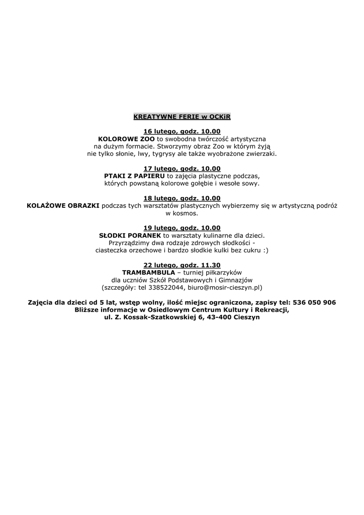 KREATYWNE FERIE w OCKiR 16 lutego, godz. 10.00 KOLOROWE ZOO to swobodna twórczość artystyczna na dużym formacie. Stworzymy obraz Zoo w którym żyją nie tylko słonie, lwy, tygrysy ale także wyobrażone zwierzaki. 17 lutego, godz. 10.00 PTAKI Z PAPIERU to zajęcia plastyczne podczas, których powstaną kolorowe gołębie i wesołe sowy. 18 lutego, godz. 10.00 KOLAŻOWE OBRAZKI podczas tych warsztatów plastycznych wybierzemy się w artystyczną podróż w kosmos. 19 lutego, godz. 10.00 SŁODKI PORANEK to warsztaty kulinarne dla dzieci. Przyrządzimy dwa rodzaje zdrowych słodkości ciasteczka orzechowe i bardzo słodkie kulki bez cukru :) 22 lutego, godz. 11.30 TRAMBAMBULA – turniej piłkarzyków dla uczniów Szkół Podstawowych i Gimnazjów (szczegóły: tel 338522044, [email protected]) Zajęcia dla dzieci od 5 lat, wstęp wolny, ilość miejsc ograniczona, zapisy tel: 536 050 906 Bliższe informacje w Osiedlowym Centrum Kultury i Rekreacji, ul. Z. Kossak-Szatkowskiej 6, 43-400 Cieszyn