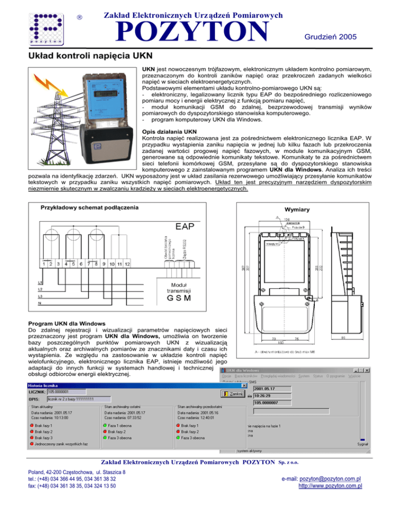 POZYTON Zakład Elektronicznych Urządzeń Pomiarowych Grudzień 2005 Układ kontroli napięcia UKN UKN jest nowoczesnym trójfazowym, elektronicznym układem kontrolno pomiarowym, przeznaczonym do kontroli zaników napięć oraz przekroczeń zadanych wielkości napięć w sieciach elektroenergetycznych. Podstawowymi elementami układu kontrolno-pomiarowego UKN są: - elektroniczny, legalizowany licznik typu EAP do bezpośredniego rozliczeniowego pomiaru mocy i energii elektrycznej z funkcją pomiaru napięć, - moduł komunikacji GSM do zdalnej, bezprzewodowej transmisji wyników pomiarowych do dyspozytorskiego stanowiska komputerowego. - program komputerowy UKN dla Windows. Opis działania UKN Kontrola napięć realizowana jest za pośrednictwem elektronicznego licznika EAP. W przypadku wystąpienia zaniku napięcia w jednej lub kilku fazach lub przekroczenia zadanej wartości progowej napięć fazowych, w module komunikacyjnym GSM, generowane są odpowiednie komunikaty tekstowe. Komunikaty te za pośrednictwem sieci telefonii komórkowej GSM, przesyłane są do dyspozytorskiego stanowiska komputerowego z zainstalowanym programem UKN dla Windows. Analiza ich treści pozwala na identyfikację zdarzeń. UKN wyposażony jest w układ zasilania rezerwowego umożliwiający przesyłanie komunikatów tekstowych w przypadku zaniku wszystkich napięć pomiarowych. Układ ten jest precyzyjnym narzędziem dyspozytorskim niezmiernie skutecznym w zwalczaniu kradzieży w sieciach elektroenergetycznych. Przykładowy schemat podłączenia Wymiary Program UKN dla Windows Do zdalnej rejestracji i wizualizacji parametrów napięciowych sieci przeznaczony jest program UKN dla Windows, umożliwia on tworzenie bazy poszczególnych punktów pomiarowych UKN z wizualizacją aktualnych oraz archiwalnych pomiarów ze znacznikami daty i czasu ich wystąpienia. Ze względu na zastosowanie w układzie kontroli napięć wielofunkcyjnego, elektronicznego licznika EAP, istnieje możliwość jego adaptacji do innych funkcji w systemach handlowej i technicznej obsługi odbiorców energii elektrycznej. Zakład Elektronicznych Urządzeń Pomiarowych POZYTON Sp. z o.o. Poland, 42-200 Częstochowa, ul. Staszica 8 tel.: (+48) 034 366 44 95, 034 361 38 32 fax: (+48) 034 361 38 35, 034 324 13 50 e-mail: [email protected] http://www.pozyton.com.pl