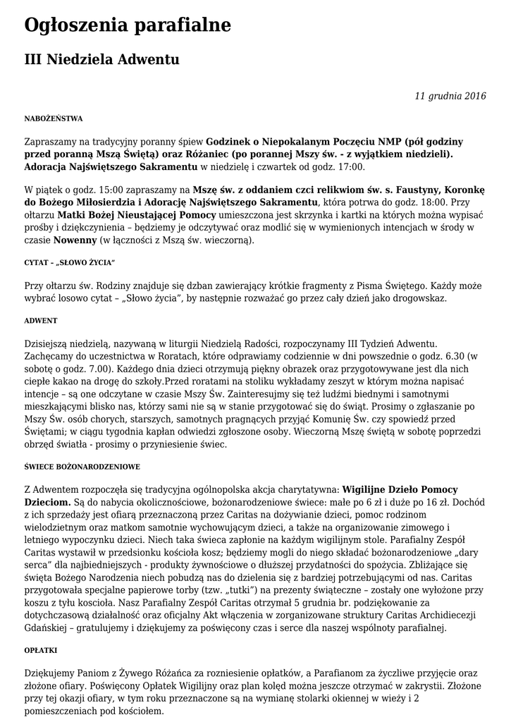 Ogłoszenia parafialne III Niedziela Adwentu 11 grudnia 2016 NABOŻEŃSTWA Zapraszamy na tradycyjny poranny śpiew Godzinek o Niepokalanym Poczęciu NMP (pół godziny przed poranną Mszą Świętą) oraz Różaniec (po porannej Mszy św. - z wyjątkiem niedzieli). Adoracja Najświętszego Sakramentu w niedzielę i czwartek od godz. 17:00. W piątek o godz. 15:00 zapraszamy na Mszę św. z oddaniem czci relikwiom św. s. Faustyny, Koronkę do Bożego Miłosierdzia i Adorację Najświętszego Sakramentu, która potrwa do godz. 18:00. Przy ołtarzu Matki Bożej Nieustającej Pomocy umieszczona jest skrzynka i kartki na których można wypisać prośby i dziękczynienia – będziemy je odczytywać oraz modlić się w wymienionych intencjach w środy w czasie Nowenny (w łączności z Mszą św. wieczorną). CYTAT – „SŁOWO ŻYCIA” Przy ołtarzu św. Rodziny znajduje się dzban zawierający krótkie fragmenty z Pisma Świętego. Każdy może wybrać losowo cytat – „Słowo życia”, by następnie rozważać go przez cały dzień jako drogowskaz. ADWENT Dzisiejszą niedzielą, nazywaną w liturgii Niedzielą Radości, rozpoczynamy III Tydzień Adwentu. Zachęcamy do uczestnictwa w Roratach, które odprawiamy codziennie w dni powszednie o godz. 6.30 (w sobotę o godz. 7.00). Każdego dnia dzieci otrzymują piękny obrazek oraz przygotowywane jest dla nich ciepłe kakao na drogę do szkoły.Przed roratami na stoliku wykładamy zeszyt w którym można napisać intencje – są one odczytane w czasie Mszy Św. Zainteresujmy się też ludźmi biednymi i samotnymi mieszkającymi blisko nas, którzy sami nie są w stanie przygotować się do świąt. Prosimy o zgłaszanie po Mszy Św. osób chorych, starszych, samotnych pragnących przyjąć Komunię Św. czy spowiedź przed Świętami; w ciągu tygodnia kapłan odwiedzi zgłoszone osoby. Wieczorną Mszę świętą w sobotę poprzedzi obrzęd światła - prosimy o przyniesienie świec. ŚWIECE BOŻONARODZENIOWE Z Adwentem rozpoczęła się tradycyjna ogólnopolska akcja charytatywna: Wigilijne Dzieło Pomocy Dzieciom. Są do nabycia okolicznościowe, bożonarodzeniowe świece: małe po 6 zł i duże po 16 zł. Dochód z ich sprzedaży jest ofiarą przeznaczoną przez Caritas na dożywianie dzieci, pomoc rodzinom wielodzietnym oraz matkom samotnie wychowującym dzieci, a także na organizowanie zimowego i letniego wypoczynku dzieci. Niech taka świeca zapłonie na każdym wigilijnym stole. Parafialny Zespół Caritas wystawił w przedsionku kościoła kosz; będziemy mogli do niego składać bożonarodzeniowe „dary serca” dla najbiedniejszych - produkty żywnościowe o dłuższej przydatności do spożycia. Zbliżające się święta Bożego Narodzenia niech pobudzą nas do dzielenia się z bardziej potrzebującymi od nas. Caritas przygotowała specjalne papierowe torby (tzw. „tutki”) na prezenty świąteczne – zostały one wyłożone przy koszu z tyłu koscioła. Nasz Parafialny Zespół Caritas otrzymał 5 grudnia br. podziękowanie za dotychczasową działalność oraz oficjalny Akt włączenia w zorganizowane struktury Caritas Archidiecezji Gdańskiej – gratulujemy i dziękujemy za poświęcony czas i serce dla naszej wspólnoty parafialnej. OPŁATKI Dziękujemy Paniom z Żywego Różańca za rozniesienie opłatków, a Parafianom za życzliwe przyjęcie oraz złożone ofiary. Poświęcony Opłatek Wigilijny oraz plan kolęd można jeszcze otrzymać w zakrystii. Złożone przy tej okazji ofiary, w tym roku przeznaczone są na wymianę stolarki okiennej w wieży i 2 pomieszczeniach pod kościołem. ZAPROSZENIE NA MSZĘ ŚW. TRANSMITOWANĄ PRZEZ TV POLONIA Zapraszamy do uczestnictwa we Mszy św. dziś o godz. 13.00 w kościele pw. Chrystusa Dobrego Pasterza w Gdyni-Cisowej. Liturgia transmitowana będzie przez TVP Polonia. Mszy Świętej przewodniczyć będzie Arcybiskup Metropolita Gdański Sławoj Leszek Głódź. MUZYKA EUROPY W KOŚCIELE GDAŃSKIEJ POLONII Serdecznie zapraszamy dziś o godz. 19:00 na koncert pt. „Wielkie oczekiwanie. Niemiecka muzyka adwentowa” z cyklu „Muzyka Europy w kościele gdańskiej Polonii”. Zostaną zaprezentowane m.in. utwory: Jana Sebastiana Bacha, Georga Friedricha Händla. WIDOWISKO SŁOWNO - MUZYCZNE „IDĄ ŚWIĘTA” Serdecznie zapraszamy na widowisko słowno - muzyczne „Idą Święta”, które odbędzie się 17 grudnia godz. 12.00 (sobota) w naszym Kościele. Jest to kolejny koncert z cyklu Akademia Muzyczna Dla Dzieci. W koncercie biorą udział dzieci ze Szkoły Podstawowej nr 58, a towarzyszą im profesjonalni muzycy i soliści z Akademii Muzycznej w Gdańsku. SPOTKANIE OPŁATKOWE SŁUŻBY ZDROWIA Duszpasterstwo Służby Zdrowia Archidiecezji Gdańskiej zaprasza lekarzy, farmaceutów, pielęgniarki i wszystkich pracowników Służby Zdrowia na dzień skupienia oraz spotkanie opłatkowe, które odbędzie się w sobotę, 17 grudnia br. w naszym kościele. Początek o godz. 15.00. SPOTKANIA Wspólnota modlitewno – ewangelizacyjna „Christo Rei” zaprasza na spotkanie w środę o godz. 19:30. Wspólnota młodzieżowa „Wieczernik” zaprasza na spotkanie w czwartek o godz. 19:30. Spotkanie Scholi Królewskiej w niedzielę o godz. 9:45. Spotkanie chóru parafialnego „Cecylia” w czwartek o godz. 18:30. Próba Zespołu młodzieżowego w środę o godz. 18:00. Kandydaci przygotowujący się do Sakramentu Bierzmowania spotykają się w niedzielę po wieczornej Mszy św. Dzieci przygotowujące się do pierwszej Komunii św. zapraszamy z Rodzicami na Mszę św. z katechezą przygotowującą do tego sakramentu w każdą niedzielę na godz. 16:00. Za tydzień 18 grudnia będzie poświęcenie medalików. PRASA KATOLICKA Zachęcamy do nabycia i czytania prasy katolickiej - w sposób szczególny nowego numeru „Gościa niedzielnego” oraz naszego parafialnego biuletynu. PODZIĘKOWANIA Składamy serdeczne podziękowania za wszelkie złożone ofiary, szczególnie za złożone dzisi