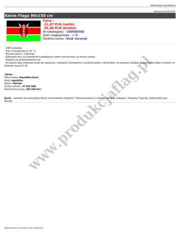 Informacje o produkcie Utworzono 04-03-2017 Kenia Flaga 90x150 cm Cena : 21,87 PLN (netto) 26,90 PLN (brutto) Nr katalogowy : 100000366 Stan magazynowy : < 0 Średnia ocena : brak recenzji .p l - 100% poliester - Prać w temperaturze 30 ° C - Wysoka jakość i stabilność - Zabezpieczony na krawedziach podwójnym szwem wzmocniony od strony masztu - Odporne na promieniowanie UV - Po bokach dwa metalowe oczka do wieszania, mozliwość zamówienia z karabinczykiem, lub tunelem na drzewiec (dopłata za wykonanie flagi z tunelem na drzewiec wynosi 2 zł) af la g -Kenia: Pełna nazwa: Republika Kenii Ustój: republika Stolica: Nairobi Liczba ludności: 37 953 840 Powierzchnia kraju: 582 650 km² w w w .p ro du kc j Kenia – państwo we wschodniej Afryce nad Oceanem Indyjskim. Państwo graniczy z Etiopią, Somalią, Sudanem, Tanzanią i Ugandą. Stolicą Kenii jest Nairobi. Wygenerowano w programie www.oscGold.com