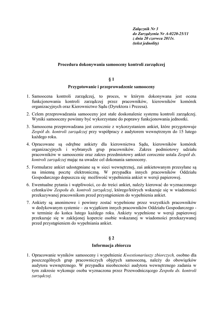 Załącznik Nr 3 do Zarządzenia Nr A-0220-25/11 z dnia 20 czerwca 2011r. (tekst jednolity) Procedura dokonywania samooceny kontroli zarządczej §1 Przygotowanie i przeprowadzenie samooceny 1. Samoocena kontroli zarządczej, to proces, w którym dokonywana jest ocena funkcjonowania kontroli zarządczej przez pracowników, kierowników komórek organizacyjnych oraz Kierownictwo Sądu (Dyrektora i Prezesa). 2. Celem przeprowadzania samooceny jest stałe doskonalenie systemu kontroli zarządczej. Wyniki samooceny powinny być wykorzystane do poprawy funkcjonowania jednostki. 3. Samoocena przeprowadzana jest corocznie z wykorzystaniem ankiet, które przygotowuje Zespół ds. kontroli zarządczej przy współpracy z audytorem wewnętrznym do 15 lutego każdego roku. 4. Opracowane są odrębne ankiety dla kierownictwa Sądu, kierowników komórek organizacyjnych i wybranych grup pracowników. Zakres podmiotowy udziału pracowników w samoocenie oraz zakres przedmiotowy ankiet corocznie ustala Zespół ds. kontroli zarządczej mając na uwadze cel dokonania samooceny. 5. Formularze ankiet udostępniane są w sieci wewnętrznej, zaś ankietowanym przesyłane są na imienną pocztę elektroniczną. W przypadku innych pracowników Oddziału Gospodarczego dopuszcza się możliwość wypełnienia ankiet w wersji papierowej. 6. Ewentualne pytania i wątpliwości, co do treści ankiet, należy kierować do wyznaczonego członka/ów Zespołu ds. kontroli zarządczej, którego/których wskazuje się w wiadomości przekazywanej pracownikom przed przystąpieniem do wypełnienia ankiet. 7. Ankiety są anonimowe i powinny zostać wypełnione przez wszystkich pracowników w dedykowanym systemie – za wyjątkiem innych pracowników Oddziału Gospodarczego w terminie do końca lutego każdego roku. Ankiety wypełnione w wersji papierowej przekazuje się w zaklejonej kopercie osobie wskazanej w wiadomości przekazywanej przed przystąpieniem do wypełniania ankiet. §2 Informacja zbiorcza 1. Opracowanie wyników samooceny i wypełnienie Kwestionariuszy zbiorczych, osobno dla poszczególnych grup pracowniczych objętych samooceną, należy do obowiązków audytora wewnętrznego. W przypadku nieobecności audytora wewnętrznego zadania w tym zakresie wykonuje osoba wyznaczona przez Przewodniczącego Zespołu ds. kontroli zarządczej. 2. Kwestionariusz zbiorczy wypełniany jest na podstawie złożonych ankiet, ze wskazaniem ilości oraz odsetka odpowiedzi pozytywnych i negatywnych. 3. Do określenia poziomu ogólnego stanu kontroli zarządczej na podstawie wyników samooceny stosuje się poniższą skalę: a) do 50% ocen pozytywnych ogółem wskazuje, że nie funkcjonowała adekwatna, skuteczna i efektywna kontrola zarządcza, b) powyżej 50% do 70% ocen pozytywnych ogółem wskazuje, że w ograniczonym stopniu funkcjonowała adekwatna, skuteczna i efektywna kontrola zarządcza, c) powyżej 70% do 85% ocen pozytywnych ogółem wskazuje, że w wystarczającym stopniu funkcjonowała adekwatna, skuteczna i efektywna kontrola zarządcza, d) powyżej 85% ocen pozytywnych ogółem wskazuje, że stan kontroli zarządczej jest optymalny, wymagający jedynie bieżącego monitorowania. 4. Jednocześnie dla pozytywnej oceny stanu kontroli zarządczej oczekiwane jest uzyskanie minimum 50% ocen pozytywnych dla każdego z objętych samooceną standardów kontroli zarządczej. 5. Do podstawy wyliczenia odsetka ocen pozytywnych w rozumieniu ust. 3 i 4 powyżej przyjmuje się także głosy „Trudno ocenić”. 6. W przypadku nie uzyskaniu pozytywnej oceny spełnienia wymogów danego standardu wg wyników samooceny wskazane jest przeanalizowanie przyczyn takiej oceny oraz pozyskanie informacji w tym zakresie z innych źródeł. 7. Audytor wewnętrzny sporządza raport dla Kierownictwa Sądu w zakresie stanu wdrożenia oraz funkcjonowania poszczególnych standardów kontroli zarządczej na podstawie wyników samooceny i załącza Kwestionariusze zbiorcze. 8. Raport zawiera przynajmniej następujące informacje: a) cel przeprowadzanej samooceny, b) zakres samooceny (zarówno przedmiotowy, jak i podmiotowy), c) wyniki samooceny: • ogólna ocena stanu kontroli zarządczej, • zidentyfikowane ryzyka i słabości kontroli zarządczej (jeżeli zostały zidentyfikowane), • proponowane działania naprawcze (w przypadku zidentyfikowania ryzyk czy słabości kontroli zarządczej). 9. Raport przekazywany jest Prezesowi i Dyrektorowi Sądu Okręgowego oraz do wiadomości Zespołowi ds. kontroli zarządczej. §3 Postanowienia końcowe 1. Każdy pracownik Sądu jest zobowiązany do aktywnego udziału w procesie samooceny, w szczególności poprzez udzielenie szczerych i otwartych odpowiedzi na temat ankietowanych zagadnień oraz terminowe złożenie wypełnionych ankiet. 2. Do aktualizacji niniejszej procedury właściwy jest Zespół ds. kontroli zarządczej, który uwzględnia wszelkie uwagi pracowników i kierowników związane ze skutecznością osiągania celów samooceny.