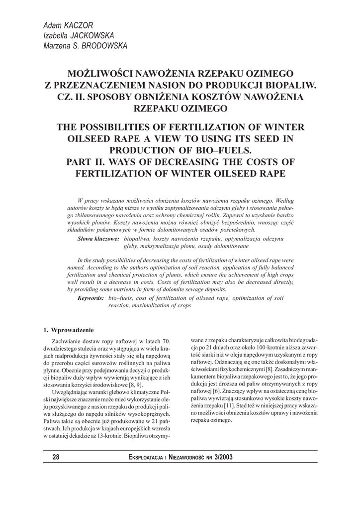 Adam KACZOR Izabella JACKOWSKA Marzena S. BRODOWSKA MOŻLIWOŚCI NAWOŻENIA RZEPAKU OZIMEGO Z PRZEZNACZENIEM NASION DO PRODUKCJI BIOPALIW. CZ. II. SPOSOBY OBNIŻENIA KOSZTÓW NAWOŻENIA RZEPAKU OZIMEGO THE POSSIBILITIES OF FERTILIZATION OF WINTER OILSEED RAPE A VIEW TO USING ITS SEED IN PRODUCTION OF BIO–FUELS. PART II. WAYS OF DECREASING THE COSTS OF FERTILIZATION OF WINTER OILSEED RAPE W pracy wskazano możliwości obniżenia kosztów nawożenia rzepaku ozimego. Według autorów koszty te będą niższe w wyniku zoptymalizowania odczynu gleby i stosowania pełnego zbilansowanego nawożenia oraz ochrony chemicznej roślin. Zapewni to uzyskanie bardzo wysokich plonów. Koszty nawożenia można również obniżyć bezpośrednio, wnosząc część składników pokarmowych w formie dolomitowanych osadów pościekowych. Słowa kluczowe: biopaliwa, koszty nawożenia rzepaku, optymalizacja odczynu gleby, maksymalizacja plonu, osady dolomitowane In the study possibilities of decreasing the costs of fertilization of winter oilseed rape were named. According to the authors optimization of soil reaction, application of fully balanced fertilization and chemical protection of plants, which ensure the achievement of high crops well result in a decrease in costs. Costs of fertilization may also be decreased directly, by providing some nutrients in form of dolomite sewage deposits. Keywords: bio–fuels, cost of fertilization of oilseed rape, optimization of soil reaction, maximalization of crops 1. Wprowadzenie Zachwianie dostaw ropy naftowej w latach 70. dwudziestego stulecia oraz występująca w wielu krajach nadprodukcja żywności stały się siłą napędową do przerobu części surowców roślinnych na paliwa płynne. Obecnie przy podejmowaniu decyzji o produkcji biopaliw duży wpływ wywierają wynikające z ich stosowania korzyści środowiskowe [8, 9]. Uwzględniając warunki glebowo klimatyczne Polski największe znaczenie może mieć wykorzystanie oleju pozyskiwanego z nasion rzepaku do produkcji paliwa służącego do napędu silników wysokoprężnych. Paliwa takie są obecnie już produkowane w 21 państwach. Ich produkcja w krajach europejskich wzrosła w ostatniej dekadzie aż 13-krotnie. Biopaliwa otrzymy- 28 wane z rzepaku charakteryzuje całkowita biodegradacja po 21 dniach oraz około 100-krotnie niższa zawartość siarki niż w oleju napędowym uzyskanym z ropy naftowej. Odznaczają się one także doskonałymi właściwościami fizykochemicznymi [8]. Zasadniczym mankamentem biopaliwa rzepakowego jest to, że jego produkcja jest droższa od paliw otrzymywanych z ropy naftowej [6]. Znaczący wpływ na ostateczną cenę biopaliwa wywierają stosunkowo wysokie koszty nawożenia rzepaku [11]. Stąd też w niniejszej pracy wskazano możliwości obniżenia kosztów uprawy i nawożenia rzepaku ozimego. EKSPLOATACJA I NIEZAWODNOŚĆ NR 3/2003 NAUKA I TECHNIKA 2. Optymalizacja odczynu Podstawą stosowania racjonalnych dawek nawozów mineralnych pod rzepak ozimy oraz gwarancją odpowiedniej efektywności ich działania jest uregulowany odczyn gleby. Jako, że rzepak należy do roślin silnie reagujących na wapnowanie, pola przeznaczane pod uprawę tej rośliny powinny być regularnie poddawane temu zabiegowi. Okresowe wapnowanie pól poprawia właściwości fizyczne, chemiczne, biologiczne i fitosanitarne gleby. Rzepak udaje się najlepiej na glebach o odczynie zbliżonym do obojętnego (pH 6– 7) [2, 11]. Nawozy wapniowe najlepiej jest wnieść pod przedplon, gdyż ich działanie odkwaszające jest największe w drugim roku po zastosowaniu. Na glebach kwaśnych o niskiej zasobności w przyswajalny magnez najkorzystniej jest stosować nawo-zy wapniowo-magnezowe. Na gleby ciężkie bardziej nadaje się wapno magnezowe tlenkowe (CaO+MgO), a na lżejsze wapno węglanowe magnezowe (CaCO3·MgCO3). Z tego względu, że rzepak jest rośliną o bardzo wysokim zapotrzebowaniu na siarkę korzystnie jest stosować odpadowe wapno poflotacyjne zawierające około 40% CaO w formie węglanowej i do 1,5% siarki [1, 11]. Nie bez znaczenia jest fakt, że wapno to na ogół jest udostępniane rolnikom bezpłatnie. Efektywność wapnowania zależy w dużym stopniu od pH wyjściowego gleby. Na glebach o odczynie bardzo kwaśnym, rzepak na ten zabieg reaguje kilkudziesięcioprocentową zwyżką plonu nasion. W przypadku odczynu lekko kwaśnego zwyżka ta nadal jest znacząca i wynosi od 10 do 20% [2]. 3. Maksymalizacja plonu W optymalnych warunkach glebowo-klimatycznych można uzyskać plony nasion rzepaku ozimego na poziomie około 9 t·ha-1. Warunki glebowo-klimatyczne panujące w naszym kraju pozwalają na otrzy- manie plonu w granicach 1,9 do 4,0 t·ha-1, jednakże rolnicy uzyskują tylko 1,6–2,5 t·ha-1 [3]. W efekcie od dłuższego czasu średni plon nasion rzepaku w Polsce kształtuje się na poziomie 2 t·ha-1, co jest granicą opłacalności uprawy tej rośliny (tab. 1). Osiągany w warunkach produkcyjnych plon stanowi około 50% plonu możliwego do osiągnięcia w warunkach naszego kraju i tylko niecałe 25% w stosunku do plonu biologicznie potencjalnego. Przyczyna uzyskiwania tak niskich plonów rzepaku tkwi w popełnianych błędach agrotechnicznych. Zakłócenie wzrostu roślin występuje już na ogół we wczesnych fazach rozwojowych rzepaku, kiedy to trzeba mu zapewnić wszystkie składniki (N, K, P, Mg, S, mikroelementy) i kompleksową ochronę chemiczną [11]. Maksymalizacja plonu wymaga lokalnych strategii nawożenia, najczęściej odmiennych w poszczególnych gospodarstwach, a nawet polach. W dłuższej perspektywie czasowej bardzo ważnym elementem jest zapewnienie odpowiedniego zmianowania. W Polsce rolnicy dobrze uświadamiają sobie działanie plonotwórcze azotu, lecz jednocześnie zapominają o tym, że przetworzenie tego składnika w białko zależy od optymalnego odżywienia rzepaku pozostałymi składnikami. Można więc wnioskować, że poprawienie stanu zasobności gleb w po