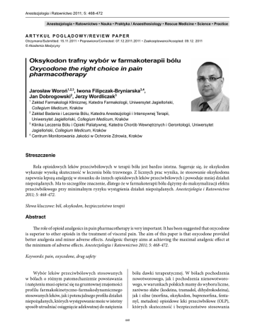 468 Anestezjologia i Ratownictwo 2011; 5: 468-472 Anestezjologia • Ratownictwo • Nauka • Praktyka / Anaesthesiology • Rescue Medicine • Science • Practice A R T Y K U Ł P O G L Ą D O W Y / R E V I E W PA P E R Otrzymano/Submitted: 15.11.2011 • Poprawiono/Corrected: 07.12.2011.2011 • Zaakceptowano/Accepted: 09.12. 2011 © Akademia Medycyny Oksykodon trafny wybór w farmakoterapii bólu Oxycodone the right choice in pain pharmacotherapy Jarosław Woroń1,2,3, Iwona Filipczak-Bryniarska3,4, Jan Dobrogowski2, Jerzy Wordliczek3 Zakład Farmakologii Klinicznej, Katedra Farmakologii, Uniwersytet Jagielloński, Collegium Medicum, Kraków 2 Zakład Badania i Leczenia Bólu, Katedra Anestezjologii i Intensywnej Terapii, Uniwersytet Jagielloński, Collegium Medicum, Kraków 3 Klinika Leczenia Bólu i Opieki Paliatywnej, Katedra Chorób Wewnętrznych i Gerontologii, Uniwersytet Jagielloński, Collegium Medicum, Kraków 4 Centrum Monitorowania Jakości w Ochronie Zdrowia, Kraków 1 Streszczenie Rola opioidowych leków przeciwbólowych w terapii bólu jest bardzo istotna. Sugeruje się, że oksykodon wykazuje wysoką skuteczność w leczeniu bólu trzewnego. Z licznych prac wynika, że stosowanie oksykodonu zapewnia lepszą analgezję w stosunku do innych opioidowych leków przeciwbólowych i powoduje mniej działań niepożądanych. Ma to szczególne znaczenie, dlatego że w farmakoterapii bólu dążymy do maksymalizacji efektu przeciwbólowego przy minimalnym ryzyku wystąpienia działań niepożądanych. Anestezjologia i Ratownictwo 2011; 5: 468-472. Słowa kluczowe: ból, oksykodon, bezpieczeństwo terapii Abstract The role of opioid analgesics in pain pharmacotherapy is very important. It has been suggested that oxycodone is superior to other opioids in the treatment of visceral pain. The aim of this paper is that oxycodone provided better analgesia and minor adverse effects. Analgesic therapy aims at achieving the maximal analgesic effect at the minimum of adverse effects. Anestezjologia i Ratownictwo 2011; 5: 468-472. Keywords: pain, oxycodone, drug safety Wybór leków przeciwbólowych stosowanych w bólach o różnym patomechanizmie powstawania i natężeniu musi opierać się na gruntownej znajomości profilu farmakokinetyczno-farmakodynamicznego stosowanych leków, jak i potencjalnego profilu działań niepożądanych, których występowanie może w istotny sposób utrudniać osiągnięcie adekwatnej do natężenia bólu dawki terapeutycznej. W bólach pochodzenia nowotworowego, jak i pochodzenia nienowotworowego, w warunkach polskich mamy do wyboru liczne, zarówno słabe (kodeina, tramadol, dihydrokodeina), jak i silne (morfina, oksykodon, buprenorfina, fentanyl, metadon) opioidowe leki przeciwbólowe (OLP), których skuteczność i bezpieczeństwo stosowania 468 Anestezjologia i Ratownictwo 2011; 5: 468-472 Anestezjologia • Ratownictwo • Nauka • Praktyka / Anaesthesiology • Rescue Medicine • Science • Practice czuciowych w obrębie jelit oraz w rogach grzbietowych rdzenia kręgowego [4]. W przypadku bólu trzewnego dochodzi do zjawiska „up regulacji” receptorów kappa w rdzeniu kręgowym oraz w mózgu, co może powodować brak zmniejszenia natężenia bólu, szczególnie o lokalizacji trzewnej, w przypadku podawania czystych agonistów receptora mi. Oksykodon wchodząc w interakcje z białkiem G powoduje otwieranie kanałów potasowych i blokuje aktywacje zależnych od potencjału kanałów wapniowych. Konsekwencją opisanych efektów jest zmniejszenie pobudliwości komórek nerwowych. Pomimo że oksykodon w porównaniu do morfiny charakteryzuje się mniejszą aktywnością wewnętrzną w stosunku do receptora typu mi, to jednak jego efekt analgetyczny jest silniejszy [5]. Wynika to z faktu, że przy porównywalnych stężeniach we krwi obydwu OLP, stężenie niezwiązanego oksykodonu w mózgu jest aż 6-krotnie wyższe w porównaniu do morfiny. Oksykodon charakteryzuje się optymalnym profilem farmakokinetycznym. Po podaniu dożylnym stężenie maksymalne leku osiągane jest po 20 minutach. Ulega szybkiej dystrybucji, głównie do fazy wodnej, objętość dystrybucji wynosi 3 L/kg, a stopień wiązania z białkami wynosi około 45%. Biologiczny okres półtrwania oksykodonu, niezależnie od drogi podania, wynosi około 4 godziny. Oksykodon ulega metabolizmowi w jelicie i w wątrobie głównie do noroksykodonu i oksymorfonu. Jednak za efekty przeciwbólowe odpowiedzialny jest przede wszystkim lek macierzysty, w mniejszym stopniu jego metabolit - oksymorfon [6]. W metabolizmie leku uczestniczy głównie izoenzym CYP3A4 oraz w mniejszym stopniu - CYP2D6. Oksykodon i jego metabolity wydalane są drogą nerkową. W trakcie stosowania oksykodonu nie obserwujemy efektu pułapowego, wraz ze wzrostem dawki obserwujemy przyrost efektu analgetycznego. Z kolei postać oksykodonu do podawania doustnego cechuje się wyższą w stosunku do morfiny biodostępnością po podaniu doustnym i wynosi ponad 60%. Biodostępność formy o przedłużonym działaniu nie różni się od formy szybkodziałającej. W przypadku postaci krótkodziałającej, oksykodon osiąga maksymalne stężenie w surowicy po około godzinie od podania. Okres półtrwania leku jest zależny od dawki i wynosi od 3,5-5,5 godziny. Z kolei w przypadku tabletek o przedłużonym uwalnianiu lek ulega dwufazowej reakcji uwalniania. może podlegać osobniczym różnicom. Często lekarz leczący pacjenta w związku z dolegliwościami bólowymi zastanawia się który lek wybrać, aby osiągnąć u chorego adekwatną analgezję nie narażając go na znaczne ryzyko działań niepożądanych. Dzisiaj mamy coraz więcej danych wskazujących bezsprzecznie, że ważnym elementem wyboru leku jest lokalizacja bólu, co pozostaje w związku z różną lokalizacją poszczególnych typów receptorów opioidowych, na które działają poszczególne leki [1]. Stosowanie leków z grupy silnych opioidów (morfina, oksykodo
