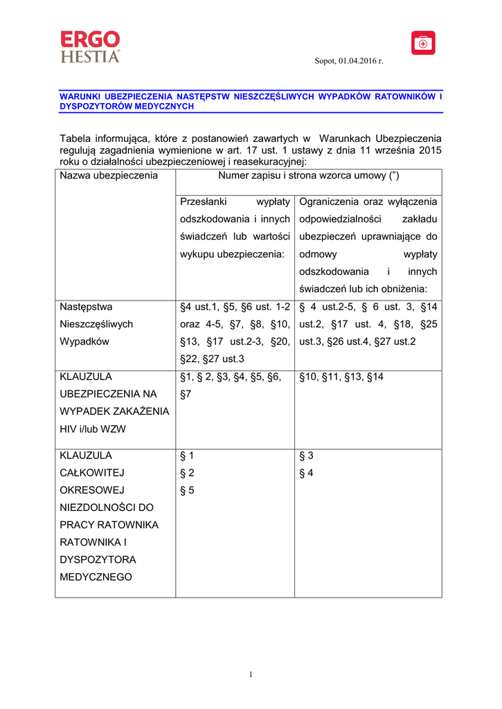 Sopot, 01.04.2016 r. WARUNKI UBEZPIECZENIA NASTĘPSTW NIESZCZĘŚLIWYCH WYPADKÓW RATOWNIKÓW I DYSPOZYTORÓW MEDYCZNYCH Tabela informująca, które z postanowień zawartych w Warunkach Ubezpieczenia regulują zagadnienia wymienione w art. 17 ust. 1 ustawy z dnia 11 września 2015 roku o działalności ubezpieczeniowej i reasekuracyjnej: Nazwa ubezpieczenia Numer zapisu i strona wzorca umowy (”) Przesłanki wypłaty Ograniczenia oraz wyłączenia odszkodowania i innych odpowiedzialności zakładu świadczeń lub wartości ubezpieczeń uprawniające do wykupu ubezpieczenia: odmowy odszkodowania wypłaty i innych świadczeń lub ich obniżenia: Następstwa §4 ust.1, §5, §6 ust. 1-2 § 4 ust.2-5, § 6 ust. 3, §14 Nieszczęśliwych oraz 4-5, §7, §8, §10, ust.2, §17 ust. 4, §18, §25 Wypadków §13, §17 ust.2-3, §20, ust.3, §26 ust.4, §27 ust.2 §22, §27 ust.3 KLAUZULA §1, § 2, §3, §4, §5, §6, UBEZPIECZENIA NA §7 §10, §11, §13, §14 WYPADEK ZAKAŻENIA HIV i/lub WZW KLAUZULA §1 §3 CAŁKOWITEJ §2 §4 OKRESOWEJ §5 NIEZDOLNOŚCI DO PRACY RATOWNIKA RATOWNIKA I DYSPOZYTORA MEDYCZNEGO 1 Sopot, 01.04.2016 r. Postanowienia ogólne §1 1. Na podstawie niniejszych Warunków Ubezpieczenia Sopockie Towarzystwo Ubezpieczeń ERGO Hestia SA, (dalej: „ERGO Hestia” lub „ Ubezpieczyciel” ), w zakresie działania swego przedsiębiorstwa, zawiera umowy ubezpieczenia z osobami fizycznymi, osobami prawnymi i jednostkami organizacyjnymi niebędącymi osobami prawnymi, którym ustawa przyznaje zdolność prawną, (dalej: „Ubezpieczający”). 2. Ubezpieczonym w umowach ubezpieczenia zawartych na podstawie niniejszych Warunków Ubezpieczenia może być wyłącznie osoba fizyczna. 3. Informujemy, że w związku z zawartą umową ubezpieczenia: 1) Sopockie Towarzystwo Ubezpieczeń ERGO Hestia SA z siedzibą w Sopocie przy ul. Hestii 1, (dalej: „ERGO Hestia”), jest administratorem Pani/Pana danych osobowych, które będą przez nią przetwarzane w celu wywiązania się z umowy ubezpieczenia oraz dla wypełnienia prawnie usprawiedliwionych celów, którymi są marketing bezpośredni własnych produktów i usług oraz dochodzenie roszczeń z tytułu zawartej umowy ubezpieczenia. Dane przetwarzane są na podstawie: art. 23 ust. 1 pkt 3) i pkt 5) ustawy z dnia 29 sierpnia 1997 r. o ochronie danych osobowych (tekst jednolity Dz. U. z 2015 r. poz. 2135) i art. 815 Kodeksu cywilnego, 2) służy Pani/Panu prawo wglądu do swoich danych osobowych oraz ich poprawiania, a przetwarzanie tych danych w celach innych niż wymienione powyżej prawnie usprawiedliwione cele ERGO Hestii albo osób trzecich, którym przekazywane są te dane, wymaga uzyskania Pani/Pana uprzedniej zgody. 4. ERGO Hestia nie ponosi odpowiedzialności za skutki niepodania do jej wiadomości okoliczności, o które pytała we wniosku o zawarcie umowy ubezpieczenia lub podanie tych okoliczności niezgodnie z prawdą. 5. Ubezpieczający przed zawarciem umowy ubezpieczenia powinien szczegółowo zapoznać się z treścią Warunków Ubezpieczenia. 6. Zwracamy uwagę, że definicje używanych pojęć mogą odbiegać od typowego, powszechnego ich znaczenia, jak też od definicji zawartych w powszechnie obowiązujących przepisach prawa. DEFINICJE §2 W rozumieniu niniejszych Warunków Ubezpieczenia za: 1) Centrum Alarmowe – uważa się podmiot wskazany przez Ubezpieczyciela, któremu Ubezpieczający lub Ubezpieczony jest obowiązany zgłosić zaistnienie zdarzenia objętego ochroną ubezpieczeniową, 2) nieszczęśliwy wypadek – uważa się nagłe zdarzenie wywołane przyczyną zewnętrzną, w wyniku którego Ubezpieczony – niezależnie od swojej woli – doznał uszkodzenia ciała, rozstroju zdrowia lub zmarł, 3) osobę bliską – uważa się małżonka, konkubinę, konkubenta, rodziców, teściów oraz dzieci, 4) osobę uprawnioną – uważa się wskazaną przez Ubezpieczonego osobę fizyczną, uprawnioną do odbioru należnej sumy ubezpieczenia na wypadek jego śmierci, 5) osoby trzecie - uważa się wszystkie podmioty/osoby pozostające poza stosunkiem ubezpieczeniowym, wynikającym z umowy ubezpieczenia zawartej z Ergo Hestią. 6) sporty wysokiego ryzyka – uważa się rafting i inne sporty wodne uprawiane w rzekach górskich, nurkowanie z wykorzystaniem aparatów oddechowych, wspinaczkę, sport spadochronowy i balonowy, paralotniarstwo, sztuki walki i wszelkiego rodzaju sporty obronne, myślistwo, jazdę konną, narciarstwo, snowboard, bobsleje, skoki narciarskie, surfing, windsurfing, jazdę na nartach wodnych oraz sporty, w których wykorzystywane są pojazdy przeznaczone do poruszania się po śniegu lub lodzie, 7) terroryzm – uważa się nielegalne akcje organizowane z pobudek ideologicznych lub politycznych, indywidualne lub grupowe, skierowane przeciwko osobom lub obiektom w celu wprowadzenia chaosu, 2 Sopot, 01.04.2016 r. zastraszenia ludności i dezorganizacji życia publicznego przy użyciu przemocy oraz skierowane przeciw społeczeństwu z zamiarem jego zastraszenia dla osiągnięcia celów politycznych lub społecznych, 8) wyczynowe uprawianie sportu – uważa się: a) uprawianie dyscyplin sportowych w ramach sekcji lub klubów sportowych, polegające na regularnym uczestniczeniu w treningach i zawodach sportowych, jak również uprawianie dyscyplin sportowych w celach zarobkowych, b) uczestniczenie w wyprawach lub ekspedycjach do miejsc charakteryzujących się ekstremalnymi warunkami klimatycznymi lub przyrodniczymi, 9) wykonywanie czynności pomocniczych – wykonywanie na terytorium RP czynności w zakładach opieki zdrowotnej polegających na: a) utrzymywaniu czystości, b) pielęgnacji pacjentów, c) rehabilitacji pacjentów, d) opiece nad pacjentami; 10) wykonywanie zawodu medycznego – udzielanie świadczeń zdrowotnych na terytorium RP przez lekarzy medycyny, lekarzy dentystów, pielęgniarki i położne oraz przedstawicieli pozostałych zawodów medycznych, w tym także udzielanie pier