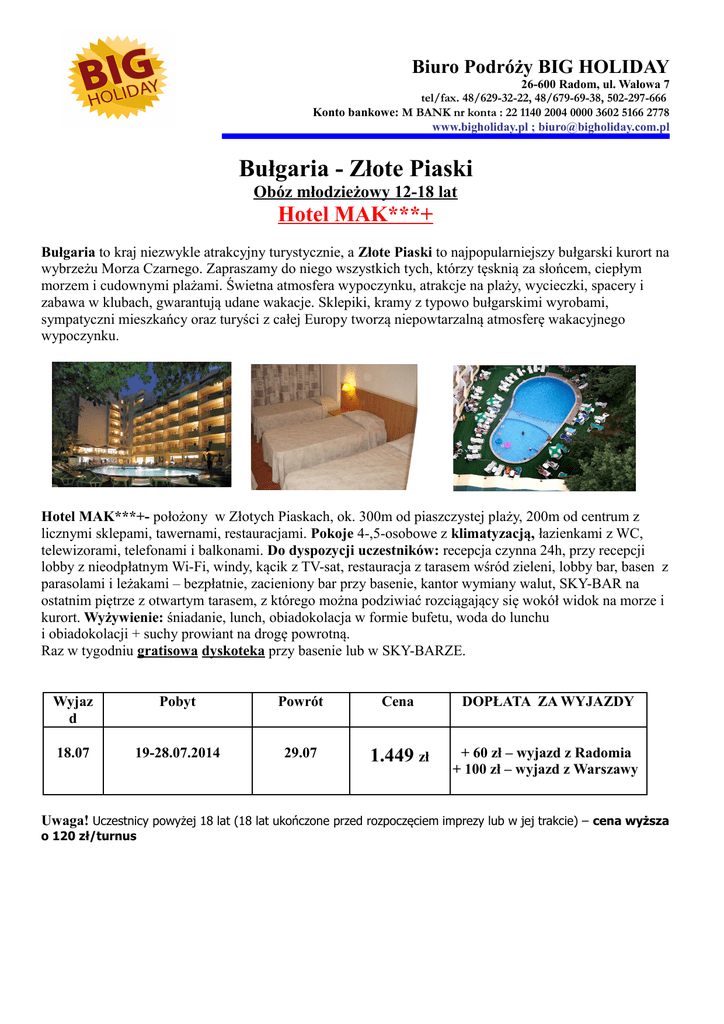 Biuro Podróży BIG HOLIDAY 26-600 Radom, ul. Wałowa 7 tel/fax. 48/629-32-22, 48/679-69-38, 502-297-666 Konto bankowe: M BANK nr konta : 22 1140 2004 0000 3602 5166 2778 www.bigholiday.pl ; [email protected] Bułgaria - Złote Piaski Obóz młodzieżowy 12-18 lat Hotel MAK***+ Bułgaria to kraj niezwykle atrakcyjny turystycznie, a Złote Piaski to najpopularniejszy bułgarski kurort na wybrzeżu Morza Czarnego. Zapraszamy do niego wszystkich tych, którzy tęsknią za słońcem, ciepłym morzem i cudownymi plażami. Świetna atmosfera wypoczynku, atrakcje na plaży, wycieczki, spacery i zabawa w klubach, gwarantują udane wakacje. Sklepiki, kramy z typowo bułgarskimi wyrobami, sympatyczni mieszkańcy oraz turyści z całej Europy tworzą niepowtarzalną atmosferę wakacyjnego wypoczynku. Hotel MAK***+- położony w Złotych Piaskach, ok. 300m od piaszczystej plaży, 200m od centrum z licznymi sklepami, tawernami, restauracjami. Pokoje 4-,5-osobowe z klimatyzacją, łazienkami z WC, telewizorami, telefonami i balkonami. Do dyspozycji uczestników: recepcja czynna 24h, przy recepcji lobby z nieodpłatnym Wi-Fi, windy, kącik z TV-sat, restauracja z tarasem wśród zieleni, lobby bar, basen z parasolami i leżakami – bezpłatnie, zacieniony bar przy basenie, kantor wymiany walut, SKY-BAR na ostatnim piętrze z otwartym tarasem, z którego można podziwiać rozciągający się wokół widok na morze i kurort. Wyżywienie: śniadanie, lunch, obiadokolacja w formie bufetu, woda do lunchu i obiadokolacji + suchy prowiant na drogę powrotną. Raz w tygodniu gratisowa dyskoteka przy basenie lub w SKY-BARZE. Wyjaz d Pobyt Powrót Cena DOPŁATA ZA WYJAZDY 18.07 19-28.07.2014 29.07 1.449 zł + 60 zł – wyjazd z Radomia + 100 zł – wyjazd z Warszawy Uwaga! Uczestnicy powyżej 18 lat (18 lat ukończone przed rozpoczęciem imprezy lub w jej trakcie) – cena wyższa o 120 zł/turnus W cenie: - 9 noclegów w pokojach 4-,5-osobowych w hotelu Mak***+, - wyżywienie FB (śniadanie, lunch i obiadokolacja w formie bufetu, woda do lunchu i obiadokolacji), suchy prowiant na drogę powrotną, - transport autokarem LUX (WC, Video, barek, klimatyzacja) - opieka pilota podczas przejazdu, - opieka wykwalifikowanej kadry pedagogicznej, kierownika i ratownika wodnego, - opieka medyczna, - taksa klimatyczna, - ubezpieczenie KL 10.000 EUR, NNW 10.000 PLN, bagaż 800 PLN - SIGNAL IDUNA, - realizacja programu wraz z animacjami - gwarancja niezmiennej ceny bez względu na koszt paliwa i kursy walut Dodatkowo płatne: - wycieczki fakultatywne, - ciepły posiłek na terenie Słowacji lub Węgier ok. 5 EUR, - połączenia antenowe z Radomia dopłata 60 zł, z Warszawy dopłata 100 zł - ubezpieczenie od kosztów rezygnacji 3 % ceny imprezy, PROGRAM RAMOWY: 1 dzień: Wyjazd z Polski wg rozkładu jazdy. Przejazd przez Słowację, Węgry i Rumunię. Po południu dłuższy postój na terenie Słowacji lub Węgier na ciepły posiłek (płatny we własnym zakresie ok. 5 EUR). Nocny przejazd przez Rumunię. 2 dzień: Przyjazd do Złotych Piasków w godzinach rannych. Złożenie bagaży w wyznaczonym miejscu. Zakwaterowanie w pokojach od godziny 14:00. Lunch, spotkanie organizacyjne z kierownikiem, powitanie i przedstawienie kadry i młodzieży, przekazanie praktycznych informacji dotyczących zakwaterowania, wyżywienia, miejscowości. Podczas spotkania uczestnicy zapoznają się z programem, ofertą wycieczek fakultatywnych i regulaminami (kąpieli, obozu). Kolacja, nocleg. 3 – 10 dzień: Program pobytu: plażowanie, kąpiele w morzu i basenie, animacje, zawody, zabawy ruchowe: zajęcia terenowe nad brzegiem morza, dyskoteki, wycieczki po okolicy, możliwość skorzystania z wycieczek fakultatywnych: Przylądek Kaliakra + zatoczka-plażowanie ok. 17 EUR, zakupy w Warnie ok. 6 EUR, Warna z Delfinarium ok. 23 EUR, Nesseber ok. 23 EUR, Istambuł ok. 55 EUR + wiza turecka 16 EUR, Bałczik + Przylądek Kaliakra + wieczorek bułgarski ok. 24 EUR, Bałczik i Przylądek Kaliakra ok. 17 EUR, Sozopol – Nesseber – wycieczka łodzią wzdłuż rzeki Ropotamo ok. 28 EUR, Constanta – Mamaia ok. 33 EUR, Park Wodny Aquapolis ok. 16 EUR, wstęp na dyskotekę ok. 3-4 EUR (ceny z roku 2013, w roku 2014 mogą ulec zmianie). 11 dzień: Wykwaterowanie po śniadaniu, złożenie bagaży w wyznaczonym miejscu. Czas wolny na ostatnie zakupy, pamiątkowe zdjęcia itp. Lunch. Późnym popołudniem zbiórka przed hotelem i pobranie suchego prowiantu. Wyjazd w drogę powrotną do kraju. Nocny przejazd przez Bułgarię i Rumunię. 12 dzień: Dalsza podróż przez Rumunię, Węgry, Słowację. Przyjazd do Polski w godzinach wieczornych. Ważne informacje: - prosimy o zabranie WAŻNEGO paszportu lub dowodu osobistego; - obowiązuje kaucja zwrotna 20 EUR/os.; - pierwszym i ostatnim posiłkiem jest lunch + suchy prowiant na drogę powrotną; - sugerowane kieszonkowe na drobne wydatki poza wycieczkami fakultatywnymi ok. 70 EUR; - adres i numer telefonu do hotelu rozdawane będą przy autokarze w dniu wyjazdu; - połączenia antenowe realizowane są samochodami osobowymi, busami lub autokarami; - ubezpiecza nas firma Signal Iduna TU S.A z siedzibą w Warszawie przy ul. Przyokopowa 31 Biuro Podróży BIG HOLIDAY 26-600 Radom, ul. Wałowa 7, tel/fax. 48/629-32-22, 48/679-69-38, 502-297-666
