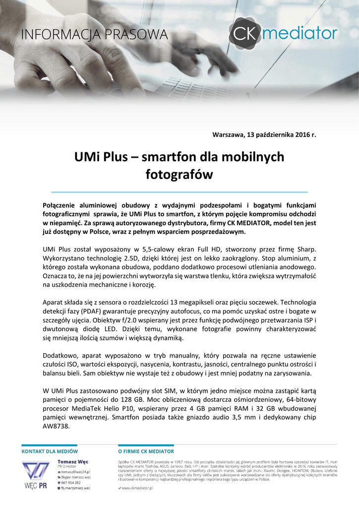 Warszawa, 13 października 2016 r. UMi Plus – smartfon dla mobilnych fotografów Połączenie aluminiowej obudowy z wydajnymi podzespołami i bogatymi funkcjami fotograficznymi sprawia, że UMi Plus to smartfon, z którym pojęcie kompromisu odchodzi w niepamięć. Za sprawą autoryzowanego dystrybutora, firmy CK MEDIATOR, model ten jest już dostępny w Polsce, wraz z pełnym wsparciem posprzedażowym. UMi Plus został wyposażony w 5,5-calowy ekran Full HD, stworzony przez firmę Sharp. Wykorzystano technologię 2.5D, dzięki której jest on lekko zaokrąglony. Stop aluminium, z którego została wykonana obudowa, poddano dodatkowo procesowi utleniania anodowego. Oznacza to, że na jej powierzchni wytworzyła się warstwa tlenku, która zwiększa wytrzymałość na uszkodzenia mechaniczne i korozję. Aparat składa się z sensora o rozdzielczości 13 megapikseli oraz pięciu soczewek. Technologia detekcji fazy (PDAF) gwarantuje precyzyjny autofocus, co ma pomóc uzyskać ostre i bogate w szczegóły ujęcia. Obiektyw f/2.0 wspierany jest przez funkcję podwójnego przetwarzania ISP i dwutonową diodę LED. Dzięki temu, wykonane fotografie powinny charakteryzować się mniejszą ilością szumów i większą dynamiką. Dodatkowo, aparat wyposażono w tryb manualny, który pozwala na ręczne ustawienie czułości ISO, wartości ekspozycji, nasycenia, kontrastu, jasności, centralnego punktu ostrości i balansu bieli. Sam obiektyw nie wystaje też z obudowy i jest mniej podatny na zarysowania. W UMi Plus zastosowano podwójny slot SIM, w którym jedno miejsce można zastąpić kartą pamięci o pojemności do 128 GB. Moc obliczeniową dostarcza ośmiordzeniowy, 64-bitowy procesor MediaTek Helio P10, wspierany przez 4 GB pamięci RAM i 32 GB wbudowanej pamięci wewnętrznej. Smartfon posiada także gniazdo audio 3,5 mm i dedykowany chip AW8738. UMi Plus działa pod kontrolą systemu Android w wersji 6.0. Producent poinformował już jednak o planach aktualizacji do wersji 7.0 Nugat, której należy spodziewać się w grudniu bieżącego roku. Bateria o pojemności 4000 mAh ma pozwolić na 15 godzin gry, 17 godzin odtwarzania wideo, 48 godzin połączeń 4G i 121 godzin słuchania muzyki. Do ładowania akumulatora zastosowano złącze USB typu C. Sugerowana cena detaliczna UMi Plus wynosi 1049 PLN brutto. Podobnie jak wszystkie inne smartfony dystrybuowane przez CK MEDIATOR, także UMi Plus jest objęty 24-miesięczną gwarancją realizowaną na terenie kraju. Aby być pewnym, że produkt pochodzi z oficjalnej dystrybucji i posiada pełne wsparcie w Polsce, należy zwrócić uwagę na hologram CK MEDIATOR. Urządzenie będzie dostępne w srebrnym i złotym wariancie kolorystycznym. Prezentację możliwości fotograficznych UMi Plus można zobaczyć pod adresem: youtu.be/avma1My77Vg O firmie CK MEDIATOR Spółka CK MEDIATOR powstała w 1997 roku. Od początku działalności jej głównym profilem była hurtowa sprzedaż towarów IT, m.in laptopów marki Toshiba, ASUS, Lenovo, Dell, HP i Acer. Szerokie kontakty wśród producentów elektroniki, w 2016 roku zaowocowały rozszerzeniem oferty o najwyższej jakości smartfony chińskich marek, takich jak m.in.: Xiaomi, Doogee, HOMTOM, Bluboo, Ulefone czy UMi. Jednym z bieżących, kluczowych dla firmy celów jest sukcesywne wprowadzanie do oferty dystrybucyjnej kolejnych brandów i budowanie kompetencji najbardziej profesjonalnego importera tego typu urządzeń w Polsce. Więcej informacji na stronie: www.ckmediator.pl
