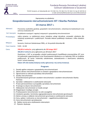 Zapraszamy na szkolenie: Gospodarowanie nieruchomościami JST i Skarbu Państwa 14 marca 2017 r. Adresaci: Pracownicy wydziałów geodezji, gospodarki nieruchomościami, urbanistyczno-budowlanych oraz ochrony środowiska JST. Cel i korzyści: Przybliżenie rozwiązań i regulacji związanych z gospodarką nieruchomościami Prowadzący: radca prawny, w codziennej pracy świadczy usługi doradcze, prowadzi szkolenia dla instytucji prywatnych i publicznych. Posiada własne publikacje naukowe z kilku dziedzin prawa Miejsce: Szczecin, Centrum Szkoleniowe FRDL, ul. Krzysztofa Kolumba 86 Czas trwania: 9.30 – 14.30 Cena: 330,00 zł netto/os. przy zgłoszeniu do 28 lutego 2017 360,00 zł netto/os przy zgłoszeniu po 28 lutym 2017 Zwolnione z VAT w przypadku szkoleń podnoszących kwalifikacje pracowników JST oraz ich jednostek organizacyjnych oraz finansowania szkolenia w co najmniej 70% ze środków publicznych. W cenie: materiały szkoleniowe, zaświadczenia o ukończeniu szkolenia, lunch i serwis kawowy. Rabat 10% dla każdej kolejnej osoby zgłoszonej z tej samej instytucji. Program: 1. 2. 3. 4. 5. Zasady ogólne związane z gospodarką nieruchomościami Zakres obrotu nieruchomościami w ustawie o gospodarce nieruchomościami Ograniczenia w zakresie sprzedaży nieruchomości Zasoby nieruchomości Gospodarowanie gminnym zasobem nieruchomości i zasobem nieruchomości Skarbu Państwa 6. Sprzedaż i oddawanie w użytkowanie wieczyste 7. Prawo pierwszeństwa w przypadku sprzedaży nieruchomości 8. Przetargi na zbycie nieruchomości 9. Oddawanie nieruchomości w trwały zarząd 10. Wygaśnięcie trwałego zarządu 11. Przekazywanie nieruchomości na cele szczególne 12. Ustalanie sposobu i terminów zagospodarowania nieruchomości gruntowych 13. Zakres umowy o oddanie nieruchomości gruntowej w użytkowanie wieczyste 14. Ceny, opłaty i rozliczenia za nieruchomości – zagadnienia problemowe 15. Cena nieruchomości sprzedawanej 16. Opłaty roczne przy użytkowaniu wieczystym 17. Pytania i dyskusja.