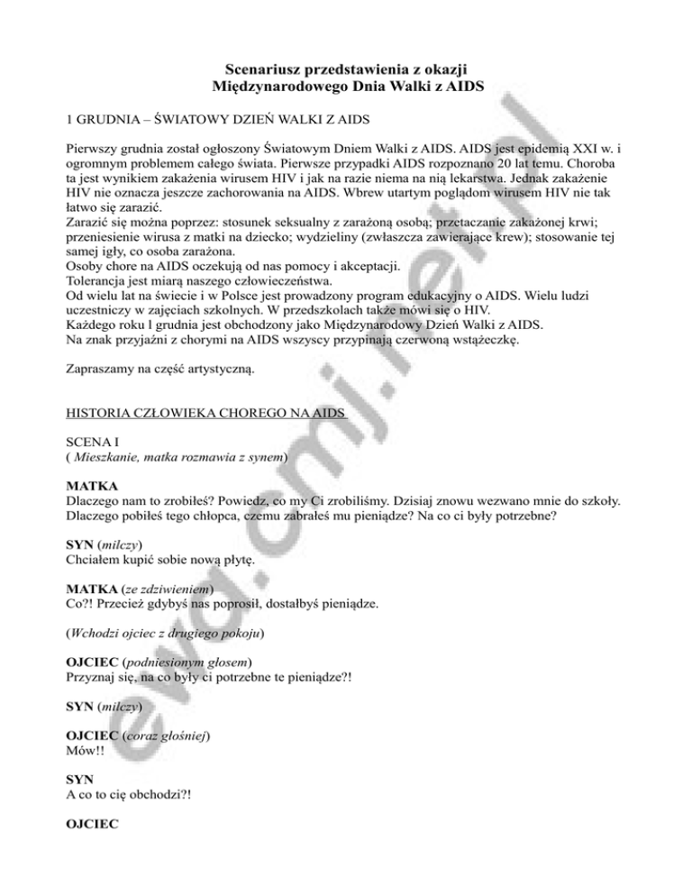Scenariusz przedstawienia z okazji Międzynarodowego Dnia Walki z AIDS 1 GRUDNIA – ŚWIATOWY DZIEŃ WALKI Z AIDS Pierwszy grudnia został ogłoszony Światowym Dniem Walki z AIDS. AIDS jest epidemią XXI w. i ogromnym problemem całego świata. Pierwsze przypadki AIDS rozpoznano 20 lat temu. Choroba ta jest wynikiem zakażenia wirusem HIV i jak na razie niema na nią lekarstwa. Jednak zakażenie HIV nie oznacza jeszcze zachorowania na AIDS. Wbrew utartym poglądom wirusem HIV nie tak łatwo się zarazić. Zarazić się można poprzez: stosunek seksualny z zarażoną osobą; przetaczanie zakażonej krwi; przeniesienie wirusa z matki na dziecko; wydzieliny (zwłaszcza zawierające krew); stosowanie tej samej igły, co osoba zarażona. Osoby chore na AIDS oczekują od nas pomocy i akceptacji. Tolerancja jest miarą naszego człowieczeństwa. Od wielu lat na świecie i w Polsce jest prowadzony program edukacyjny o AIDS. Wielu ludzi uczestniczy w zajęciach szkolnych. W przedszkolach także mówi się o HIV. Każdego roku l grudnia jest obchodzony jako Międzynarodowy Dzień Walki z AIDS. Na znak przyjaźni z chorymi na AIDS wszyscy przypinają czerwoną wstążeczkę. Zapraszamy na część artystyczną. HISTORIA CZŁOWIEKA CHOREGO NA AIDS SCENA I ( Mieszkanie, matka rozmawia z synem) MATKA Dlaczego nam to zrobiłeś? Powiedz, co my Ci zrobiliśmy. Dzisiaj znowu wezwano mnie do szkoły. Dlaczego pobiłeś tego chłopca, czemu zabrałeś mu pieniądze? Na co ci były potrzebne? SYN (milczy) Chciałem kupić sobie nową płytę. MATKA (ze zdziwieniem) Co?! Przecież gdybyś nas poprosił, dostałbyś pieniądze. (Wchodzi ojciec z drugiego pokoju) OJCIEC (podniesionym głosem) Przyznaj się, na co były ci potrzebne te pieniądze?! SYN (milczy) OJCIEC (coraz głośniej) Mów!! SYN A co to cię obchodzi?! OJCIEC Uważaj, bo jeszcze mieszkasz w tym domu! SYN Chcesz?! To mogę nie mieszkać! OJCIEC Zamknij się, zanim stracę cierpliwość! SYN A trać sobie co chcesz! Tylko nie padnij na zawał! OJCIEC Cicho bądź gówniarzu! SYN (z ironią) Bo co mi zrobisz?! OJCIEC (uderza go w twarz) Wynoś się stąd! SYN (wychodzi gwałtownie z pokoju, krzyczy) Jeszcze tego pożałujesz! Zobaczysz! (Wszyscy wychodzą, po pewnej chwili przychodzi syn z plecakiem, zaczyna się pakować, mówi sam do siebie) SYN Mam sobie iść? Dobra! Ale jeszcze kiedyś będziesz prosił, żebym wrócił! Chcesz wiedzieć na co była potrzebna mi ta forsa? Na dragi, na narkotyki i faje. Chciałem się nawalić za wszystkie czasy. SYN (milczy długo) Cześć. (Wychodzi) NARRATOR Miałem dużo problemów z rodzicami. Ciągle się kłóciliśmy. W wieku 15 lat uciekłem z domu i zacząłem życie na ulicy. Zacząłem poznawać ludzi. Widziałem jak wielu moich znajomych zarabiało. „Cioty” zainteresowały się mną, bo byłem młody. I tak się zaczęło. Tworzyliśmy małe grono ludzi żyjących na ulicy i kiedyś oni zaczęli brać. SCENA II NARRATOR Dwa lata później. (Ulica, dwóch chłopaków i jedna dziewczyna. Siedzą oparci o mur) CHŁOPAK ( WOJTEK) (nieco nieporadnie) Mirek, daj jeszcze działkę. (Mirek daje mu, on wstrzykuje sobie w żyłę) CHŁOPAK (WOJTEK) O rany! Super! (Przysuwa się do dziewczyny) DZIEWCZYNA( KAŚKA) Zostaw mnie, Wojtek! WOJTEK No co ty? Kaśka! KAŚKA Powiedziałam, zostaw mnie. MIREK Wiecie co? Jestem szczęśliwy, mam kumpli, towar, dziewczynę i towar. KAŚKA Przestań! MIREK Wiecie co, zaśpiewam wam coś. (Mirek śpiewa piosenkę „Jestem naćpany”) KAŚKA Przestań już. Nie śpiewaj! MIREK (Podnosi się gwałtownie, chwiejnie) Nie mów tak do mnie! W domu też tak mnie traktowano! WOJTEK Spoko stary masz jeszcze coś? MIREK (Siada ciężko) Dwa skręty. KAŚKA No to dawaj. (Wchodzi dwóch mężczyzn) I MĘŻCZYZNA Co robicie? WOJTEK A co to ciebie obchodzi? II MĘŻCZYZNA do I Oni są kompletnie naćpani. I MĘŻCZYZNA Widzę. Może pójdziecie z nami? KAŚKA Nigdzie nie idę! II MĘŻCZYZNA Wstań i chodź. KAŚKA Mam cię gdzieś! (Mężczyźni podnoszą ich i wyprowadzają) NARRATOR Tak właśnie wyglądało moje życie na ulicy. Zostałem aresztowany. Tam miałem wewnętrzny krwotok, na całym ciele zaczęły pojawiać się purpurowe plamy. Wzięto mnie do szpitala i zrobiono test na AIDS. Po wyjściu z więzienia nie miałem dokąd iść. Zacząłem brać dużo kokainy i heroiny. Znalazłem się w okropnym dołku. Miałem liszaje na twarzy, zakrwawione ubranie długie tłuste włosy i ślady nakłuć na obydwu przedramionach. Zadzwoniłem do domu. Dowiedziałem się, że mój brat ma złośliwy guz mózgu. Pojechałem do domu, ale mój ojciec nie pozwolił mi się zobaczyć z bratem. Zgłosiłem się na odwyk, ale nie wytrzymałem. Uciekłem. Wróciłem na ulicę i znów zabrałem się do ćpania. Po dwóch miesiącach znów zgłosiłem się do ośrodka. I tak próbowałem kilka razy. SCENA III (Stół, dwa krzesła, mężczyzna i kobieta siedzą naprzeciw siebie, rozmawiają, kobieta ma na sobie biały fartuch) LEKARZ Mirek, przez ostatni rok byłeś w ośrodku już kilka razy i za każdym razem kończysz na ulicy ćpając. MIREK Moja sprawa, co robię i gdzie. LEKARZ Tak, to prawda. Ale musisz się zacząć leczyć. MIREK Nie jestem narkomanem! LEKARZ Oczywiście, że nie jesteś. Ale może powinieneś wrócić do domu? MIREK Ulica to mój dom. LEKARZ A rodzice? MIREK Nie chcą mnie znać. Ostatnio chciałem odwiedzić chorego brata... Ojciec nie chciał ze mną rozmawiać (Wchodzi kobieta ubrana w fartuch z teczką – pielęgniarka) PIELĘGNIARKA Pani doktor, są już wyniki. LEKARZ Dziękuję. (Pielęgniarka wychodzi) MIREK Jakie wyniki? LEKARZ (otwierając teczkę) Twoje. MIREK (wstając) W takim razie idę. LEKARZ Zaczekaj. Usiądź. MIREK O co chodzi? LEKARZ Posłuchaj według wyników... jesteś HIV pozytywny. MIREK Co?! (Wyrywa kartkę i czyta) ( Załamany) O Boże! LEKARZ Powiedz jak to się stało? MIREK Nie wiem! Braliśmy z chłopakami z jednej strzykawki. O