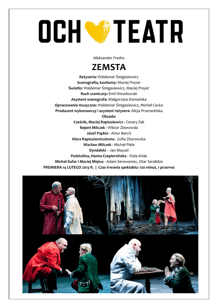 Aleksander Fredro ZEMSTA Reżyseria: Waldemar Śmigasiewicz Scenografia, kostiumy: Maciej Preyer Światło: Waldemar Śmigasiewicz, Maciej Preyer Ruch sceniczny: Emil Wesołowski Asystent scenografa: Małgorzata Domańska Opracowanie muzyczne: Waldemar Śmigasiewicz, Michał Cacko Producent wykonawczy i asystent reżysera: Alicja Przerazińska Obsada: Cześnik, Maciej Raptusiewicz - Cezary Żak Rejent Milczek - Wiktor Zborowski Józef Papkin - Artur Barciś Klara Raptusiewiczówna - Zofia Zborowska Wacław Milczek - Michał Piela Dyndalski – Jan Mayzel Podstolina, Hanna Czepiersińska - Viola Arlak Michał Kafar i Maciej Miętus - Adam Serowaniec, Otar Saralidze PREMIERA 14 LUTEGO 2013 R. | Czas trwania spektaklu: 120 minut, 1 przerwa Opis spektaklu: Hrabia Aleksander Fredro o Polaków życiu sąsiedzkim. Ile to już razy śmieliśmy się ze sporu o mur graniczny i fanfaronad Papkina? Ile wspaniałych i legendarnych kreacji aktorskich zyskaliśmy dzięki Zemście? To arcydzieło polskiej literatury to jednak nie tylko klasyka komedii – elementarz komizmu sytuacyjnego, przerysowanych postaci czy humoru słownego - ale również jeden z najbardziej krytycznych utworów o polskości, często w szyderczy i o dziwno wciąż aktualny sposób wyszydzający nasze narodowe przywary i słabostki. Utwór, którego ostrze zaczyna nam doskwierać, gdy mija już śmiech. Nasza Zemsta to próba dokonania współczesnej interpretacji tej romantycznej komedii, opowiadająca o konflikcie między Cześnikiem a Rejentem, ale jednocześnie wykpiwająca nas samych i czasy, w których żyjemy. Spektakl w absolutnie brawurowej obsadzie, w reżyserii znanego z ironii specjalisty od Gombrowicza, Waldemara Śmigasiewicza, wystawiany z okazji obchodów roku Aleksandra Fredry. Fragmenty recenzji: „Wiktor Zborowski, który znakomitą rolą Rejenta świętuje 40-lecie pracy artystycznej, gra z klasą, z przekonaniem uwypuklając cechy swego bohatera, jego obłudę i egoizm. To krętacz i szczwany lis odziany w szaty świętoszkowatości. Jego donośny głos, stonowany acz wyraźny, charakterystyczna gestykulacja dopracowanych ruchów budzą aplauz publiczności. Cezary Żak w roli Cześnika, zawadiaki i gwałtownika, to uosobienie sejmikowego rębajły, którego wielkopańskie fumy i nieporadność w wyrażaniu myśli dopełniają humorystycznego rysunku postaci. Artur Barciś, na scenie jako Papkin, gra całym sobą, każdym niemal nerwem swojego ciała. Wykorzystuje wszelkie znane mu techniki i umiejętności aktorskie w mistrzowski sposób. W skórze Papkina czuje się znakomicie. Nienaganna dykcja, świadomość języka pozwala mu nawet z drobnego przejęzyczenia uczynić dodatkowy humorystyczny element, co pełna entuzjazmu publiczność nagradza burzliwymi oklaskami. (…)Aktorzy wydobyli cały wdzięk utworu Fredry w mistrzowski sposób, ukazując bardzo sugestywnie gęsty humor sytuacyjny i językowy w całej jego krasie tak, iż publiczność nie pozwala zejść im ze sceny, bijąc brawo na stojąco i wiwatując.” Anna Czajkowska „Akcja dynamiczna. Gra ciekawa, a momentami znakomita. Przekomiczny Artur Barciś, być może celowo nawiązujący dialog z filmową kreacją Romana Polańskiego. Józef Papkin zresztą to rola wymarzona ze względu na emploi Barcisia, zgodna z naturalną vis comica aktora. Cezary Żak bardzo dobrze sprawdza się w klasycznym repertuarze. Michał Piela, jako zalotnik smalący cholewki do Klary, jest bardzo dowcipny i komiczny, także ze względu na swą posturę. Wiktor Zborowski jest doskonały. Wydobył z postaci Rejenta tyle, ile tylko można. Nie kwestionowaną królową spektaklu jest pełna wdzięku Viola Arlak wyraźnie nawiązująca swym (trochę przerysowanym) seksapilem, ale również i makijażem oraz - przede wszystkim - głosem do Kaliny Jędrusik. Aktorzy grają z werwą i zacięciem. Brawa za dystans do siebie samych!” Marek Kujawski IMPRESARIAT TEATRU POLONIA I OCH-TEATRU: Iwona Gradkowska kom. 609 062 817 / email: [email protected] www.ochteatr.com.pl