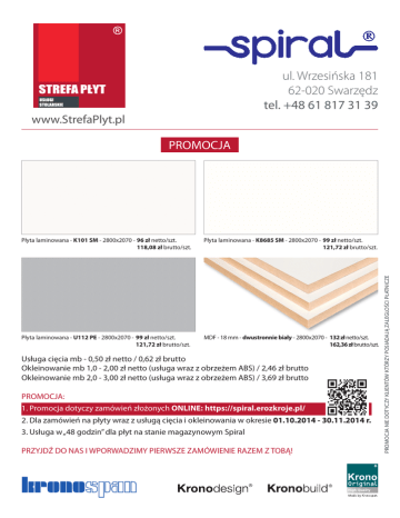 ul. Wrzesińska 181 62-020 Swarzędz tel. +48 61 817 31 39 www.StrefaPlyt.pl Płyta laminowana - K101 SM - 2800x2070 - 96 zł netto/szt. 118,08 zł brutto/szt. Płyta laminowana - K8685 SM - 2800x2070 - 99 zł netto/szt. 121,72 zł brutto/szt. Płyta laminowana - U112 PE - 2800x2070 - 99 zł netto/szt. 121,72 zł brutto/szt. MDF - 18 mm - dwustronnie biały - 2800x2070 - 132 zł netto/szt. 162,36 zł brutto/szt. Usługa cięcia mb - 0,50 zł netto / 0,62 zł brutto Okleinowanie mb 1,0 - 2,00 zł netto (usługa wraz z obrzeżem ABS) / 2,46 zł brutto Okleinowanie mb 2,0 - 3,00 zł netto (usługa wraz z obrzeżem ABS) / 3,69 zł brutto PROMOCJA: 1. Promocja dotyczy zamówień złożonych ONLINE: https://spiral.erozkroje.pl/ 2. Dla zamówień na płyty wraz z usługą cięcia i okleinowania w okresie 01.10.2014 - 30.11.2014 r. 3. Usługa w „48 godzin” dla płyt na stanie magazynowym Spiral PRZYJDŹ DO NAS I WPORWADZIMY PIERWSZE ZAMÓWIENIE RAZEM Z TOBĄ! PROMOCJA NIE DOTYCZY KLIENTÓW KTÓRZY POSIADAJĄ ZALEGLOŚCI PŁATNICZE PROMOCJA