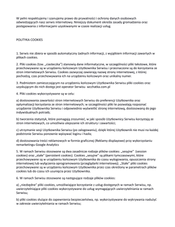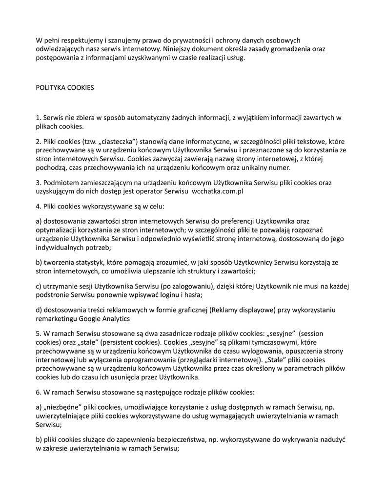W pełni respektujemy i szanujemy prawo do prywatności i ochrony danych osobowych odwiedzających nasz serwis internetowy. Niniejszy dokument określa zasady gromadzenia oraz postępowania z informacjami uzyskiwanymi w czasie realizacji usług. POLITYKA COOKIES 1. Serwis nie zbiera w sposób automatyczny żadnych informacji, z wyjątkiem informacji zawartych w plikach cookies. 2. Pliki cookies (tzw. „ciasteczka”) stanowią dane informatyczne, w szczególności pliki tekstowe, które przechowywane są w urządzeniu końcowym Użytkownika Serwisu i przeznaczone są do korzystania ze stron internetowych Serwisu. Cookies zazwyczaj zawierają nazwę strony internetowej, z której pochodzą, czas przechowywania ich na urządzeniu końcowym oraz unikalny numer. 3. Podmiotem zamieszczającym na urządzeniu końcowym Użytkownika Serwisu pliki cookies oraz uzyskującym do nich dostęp jest operator Serwisu wcchatka.com.pl 4. Pliki cookies wykorzystywane są w celu: a) dostosowania zawartości stron internetowych Serwisu do preferencji Użytkownika oraz optymalizacji korzystania ze stron internetowych; w szczególności pliki te pozwalają rozpoznać urządzenie Użytkownika Serwisu i odpowiednio wyświetlić stronę internetową, dostosowaną do jego indywidualnych potrzeb; b) tworzenia statystyk, które pomagają zrozumieć, w jaki sposób Użytkownicy Serwisu korzystają ze stron internetowych, co umożliwia ulepszanie ich struktury i zawartości; c) utrzymanie sesji Użytkownika Serwisu (po zalogowaniu), dzięki której Użytkownik nie musi na każdej podstronie Serwisu ponownie wpisywać loginu i hasła; d) dostosowania treści reklamowych w formie graficznej (Reklamy displayowe) przy wykorzystaniu remarketingu Google Analytics 5. W ramach Serwisu stosowane są dwa zasadnicze rodzaje plików cookies: „sesyjne” (session cookies) oraz „stałe” (persistent cookies). Cookies „sesyjne” są plikami tymczasowymi, które przechowywane są w urządzeniu końcowym Użytkownika do czasu wylogowania, opuszczenia strony internetowej lub wyłączenia oprogramowania (przeglądarki internetowej). „Stałe” pliki cookies przechowywane są w urządzeniu końcowym Użytkownika przez czas określony w parametrach plików cookies lub do czasu ich usunięcia przez Użytkownika. 6. W ramach Serwisu stosowane są następujące rodzaje plików cookies: a) „niezbędne” pliki cookies, umożliwiające korzystanie z usług dostępnych w ramach Serwisu, np. uwierzytelniające pliki cookies wykorzystywane do usług wymagających uwierzytelniania w ramach Serwisu; b) pliki cookies służące do zapewnienia bezpieczeństwa, np. wykorzystywane do wykrywania nadużyć w zakresie uwierzytelniania w ramach Serwisu; c) „wydajnościowe” pliki cookies, umożliwiające zbieranie informacji o sposobie korzystania ze stron internetowych Serwisu; d) „funkcjonalne” pliki cookies, umożliwiające „zapamiętanie” wybranych przez Użytkownika ustawień i personalizację interfejsu Użytkownika, np. w zakresie wybranego języka lub regionu, z którego pochodzi Użytkownik, rozmiaru czcionki, wyglądu strony internetowej itp.; e) „reklamowe” pliki cookies, umożliwiające dostarczanie Użytkownikom treści reklamowych bardziej dostosowanych do ich zainteresowań. 7. W wielu przypadkach oprogramowanie służące do przeglądania stron internetowych (przeglądarka internetowa) domyślnie dopuszcza przechowywanie plików cookies w urządzeniu końcowym Użytkownika. Użytkownicy Serwisu mogą dokonać w każdym czasie zmiany ustawień dotyczących plików cookies. Ustawienia te mogą zostać zmienione w szczególności w taki sposób, aby blokować automatyczną obsługę plików cookies w ustawieniach przeglądarki internetowej bądź informować o ich każdorazowym zamieszczeniu w urządzeniu Użytkownika Serwisu. Szczegółowe informacje o możliwości i sposobach obsługi plików cookies dostępne są w ustawieniach oprogramowania (przeglądarki internetowej). Użytkownicy mogą zablokować usługę Analytics dla reklam displayowych oraz dostosowywać reklamy w sieci reklamowej Google w Menedżerze preferencji reklam. Można również pobrać program blokujący Google Analytics ze strony https://tools.google.com/dlpage/gaoptout/ 8. Operator Serwisu informuje, że ograniczenia stosowania plików cookies mogą wpłynąć na niektóre funkcjonalności dostępne na stronach internetowych Serwisu. 9. Pliki cookies zamieszczane w urządzeniu końcowym Użytkownika Serwisu i wykorzystywane mogą być również przez współpracujących z operatorem Serwisu reklamodawców oraz partnerów. 10. Więcej informacji na temat plików cookies dostępnych jest pod adresem http://wszystkoociasteczkach.pl lub w sekcji „Pomoc” w menu przeglądarki internetowej.