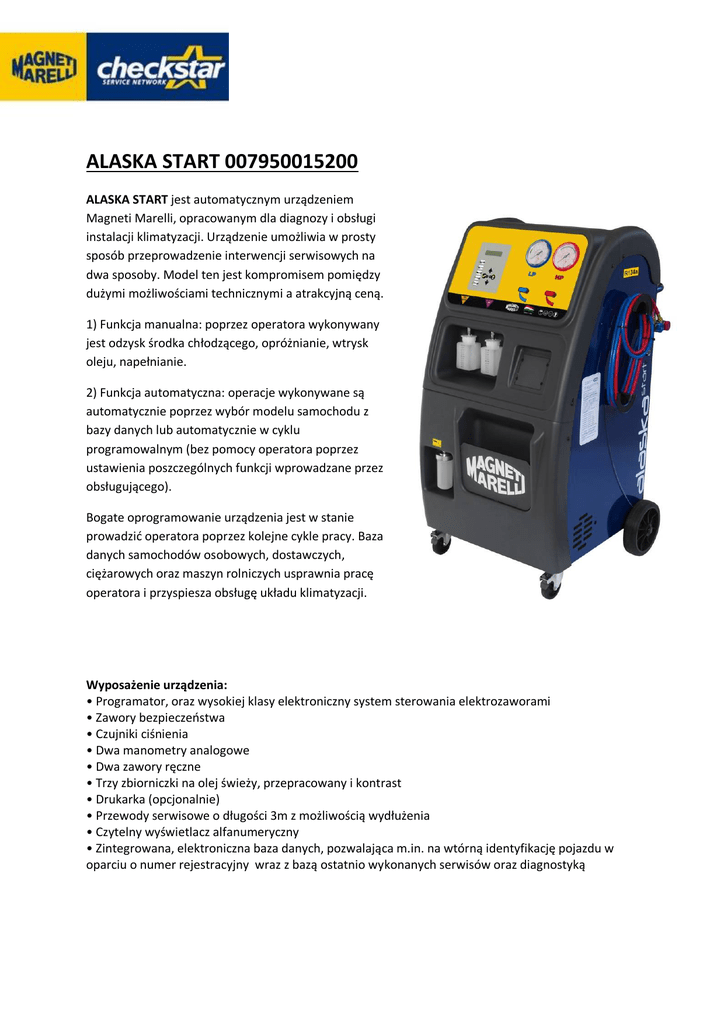 ALASKA START 007950015200 ALASKA START jest automatycznym urządzeniem Magneti Marelli, opracowanym dla diagnozy i obsługi instalacji klimatyzacji. Urządzenie umożliwia w prosty sposób przeprowadzenie interwencji serwisowych na dwa sposoby. Model ten jest kompromisem pomiędzy dużymi możliwościami technicznymi a atrakcyjną ceną. 1) Funkcja manualna: poprzez operatora wykonywany jest odzysk środka chłodzącego, opróżnianie, wtrysk oleju, napełnianie. 2) Funkcja automatyczna: operacje wykonywane są automatycznie poprzez wybór modelu samochodu z bazy danych lub automatycznie w cyklu programowalnym (bez pomocy operatora poprzez ustawienia poszczególnych funkcji wprowadzane przez obsługującego). Bogate oprogramowanie urządzenia jest w stanie prowadzić operatora poprzez kolejne cykle pracy. Baza danych samochodów osobowych, dostawczych, ciężarowych oraz maszyn rolniczych usprawnia pracę operatora i przyspiesza obsługę układu klimatyzacji. Wyposażenie urządzenia: • Programator, oraz wysokiej klasy elektroniczny system sterowania elektrozaworami • Zawory bezpieczeństwa • Czujniki ciśnienia • Dwa manometry analogowe • Dwa zawory ręczne • Trzy zbiorniczki na olej świeży, przepracowany i kontrast • Drukarka (opcjonalnie) • Przewody serwisowe o długości 3m z możliwością wydłużenia • Czytelny wyświetlacz alfanumeryczny • Zintegrowana, elektroniczna baza danych, pozwalająca m.in. na wtórną identyfikację pojazdu w oparciu o numer rejestracyjny wraz z bazą ostatnio wykonanych serwisów oraz diagnostyką Funkcje ALASKA START: • odzysk czynnika chłodzącego zawartego w A/C • oczyszczanie czynnika z zanieczyszczeń mechanicznych • odwadnianie czynnika poprzez filtrowanie • separacja czynnika od oleju zawartego w układzie • pomiar ilości odzyskanego czynnika • test obecności resztek czynnika w układzie • osuszanie układu za pomocą wydajnej pompy próżniowej • test szczelności układu (na podciśnieniu lub ciśnieniowo z użyciem azotu) • automatyczny lub półautomatyczny wtrysk oleju i kontrastu w ilości założonej przez obsługującego lub manualny z kontrolą wzrokową • odzysk pozostałego czynnika z przewodów • możliwość pracy w trybie manualnym • zapis 20 ostatnio wykonanych serwisów • nieskomplikowany i tani serwis Dane techniczne:  Czynnik chłodzący: R134a  Waga elektroniczna czynnika chłodzącego: - Dokładność +/- 10 g  Próżniomierz elektroniczny: Kl. 2.5  Pojemność operacyjna: zbiornik – 10 Kg R134a  Filtr o złożonym o sicie molekularnym oraz mechaniczny z cienkiej siatki  Pompa próżniowa 70 l/min  Maksymalne podciśnienie 0,05 mbar  Pojemność skokowa sprężarki: 300g/min  Przewody 3m  Drukarka termiczna (opcja) W zestawie ze stacją: Para rękawic ochronnych Okulary ochronne Komplet przyłączy do butli zewnętrznej Instrukcja 100 szt. rękawic nitrylowych XL Pokrowiec ochronny Baner reklamowy Plakat reklamowy