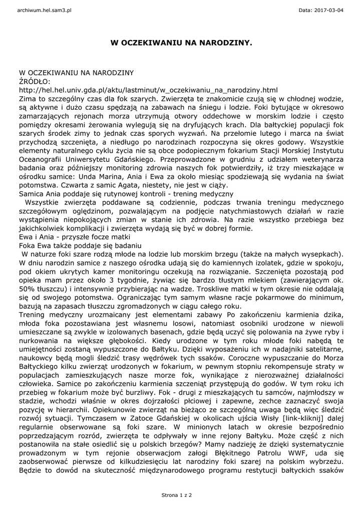 archiwum.hel.sam3.pl Data: 2017-03-04 W OCZEKIWANIU NA NARODZINY. W OCZEKIWANIU NA NARODZINY ŹRÓDŁO: http://hel.hel.univ.gda.pl/aktu/lastminut/w_oczekiwaniu_na_narodziny.html Zima to szczególny czas dla fok szarych. Zwierzęta te znakomicie czują się w chłodnej wodzie, są aktywne i dużo czasu spędzają na zabawach na śniegu i lodzie. Foki bytujące w okresowo zamarzających rejonach morza utrzymują otwory oddechowe w morskim lodzie i często pomiędzy okresami żerowania wylegują się na dryfujących krach. Dla bałtyckiej populacji fok szarych środek zimy to jednak czas sporych wyzwań. Na przełomie lutego i marca na świat przychodzą szczenięta, a niedługo po narodzinach rozpoczyna się okres godowy. Wszystkie elementy naturalnego cyklu życia nie są obce podopiecznym fokarium Stacji Morskiej Instytutu Oceanografii Uniwersytetu Gdańskiego. Przeprowadzone w grudniu z udziałem weterynarza badania oraz późniejszy monitoring zdrowia naszych fok potwierdziły, iż trzy mieszkające w ośrodku samice: Unda Marina, Ania i Ewa za około miesiąc spodziewają się wydania na świat potomstwa. Czwarta z samic Agata, niestety, nie jest w ciąży. Samica Ania poddaje się rutynowej kontroli - trening medyczny Wszystkie zwierzęta poddawane są codziennie, podczas trwania treningu medycznego szczegółowym oględzinom, pozwalającym na podjęcie natychmiastowych działań w razie wystąpienia niepokojących zmian w stanie ich zdrowia. Na razie wszystko przebiega bez jakichkolwiek komplikacji i zwierzęta wydają się być w dobrej formie. Ewa i Ania - przyszłe focze matki Foka Ewa także poddaje się badaniu W naturze foki szare rodzą młode na lodzie lub morskim brzegu (także na małych wysepkach). W dniu narodzin samice z naszego ośrodka udają się do kamiennych izolatek, gdzie w spokoju, pod okiem ukrytych kamer monitoringu oczekują na rozwiązanie. Szczenięta pozostają pod opieka mam przez około 3 tygodnie, żywiąc się bardzo tłustym mlekiem (zawierającym ok. 50% tłuszczu) i intensywnie przybierając na wadze. Troskliwe matki w tym okresie nie oddalają się od swojego potomstwa. Ograniczając tym samym własne racje pokarmowe do minimum, bazują na zapasach tłuszczu zgromadzonych w ciągu całego roku. Trening medyczny urozmaicany jest elementami zabawy Po zakończeniu karmienia dzika, młoda foka pozostawiana jest własnemu losowi, natomiast osobniki urodzone w niewoli umieszczane są zwykle w izolowanych basenach, gdzie będą uczyć się polowania na żywe ryby i nurkowania na większe głębokości. Kiedy urodzone w tym roku młode foki nabędą te umiejętności zostaną wypuszczone do Bałtyku. Dzięki wyposażeniu ich w nadajniki satelitarne, naukowcy będą mogli śledzić trasy wędrówek tych ssaków. Coroczne wypuszczanie do Morza Bałtyckiego kilku zwierząt urodzonych w fokarium, w pewnym stopniu rekompensuje straty w populacjach zamieszkujących nasze morze fok, wynikające z nierozważnej działalności człowieka. Samice po zakończeniu karmienia szczeniąt przystępują do godów. W tym roku ich przebieg w fokarium może być burzliwy. Fok - drugi z mieszkających tu samców, najmłodszy w stadzie, wchodzi właśnie w okres dojrzałości płciowej i zapewne, zechce zaznaczyć swoja pozycję w hierarchii. Opiekunowie zwierząt na bieżąco ze szczególną uwaga będą więc śledzić rozwój sytuacji. Tymczasem w Zatoce Gdańskiej w okolicach ujścia Wisły [link-kliknij] dalej regularnie obserwowane są foki szare. W minionych latach w okresie bezpośrednio poprzedzającym rozród, zwierzęta te odpływały w inne rejony Bałtyku. Może część z nich postanowiła na stałe osiedlić się u polskich brzegów? Mamy nadzieję że dzięki systematycznie prowadzonym w tym rejonie obserwacjom załogi Błękitnego Patrolu WWF, uda się zaobserwować pierwsze od kilkudziesięciu lat narodziny foki szarej na polskim wybrzeżu. Będzie to dowód na skuteczność międzynarodowego programu restytucji bałtyckich ssaków Strona 1 z 2 archiwum.hel.sam3.pl Data: 2017-03-04 W OCZEKIWANIU NA NARODZINY. morskich, a także świadectwo poprawy środowiska naturalnego i kondycji bałtyckich zasobów ryb i fok. Więcej informacji o fokach znajdziesz tutaj:http://www.fokarium.pl/bfoki.html http://www.fokarium.pl/helskie_foki.html Tekst i zdjęcia: Michał Bała 06 - 02 - 2013 El¿bieta Wiekiera Urz±d Miasta Helu Strona 2 z 2