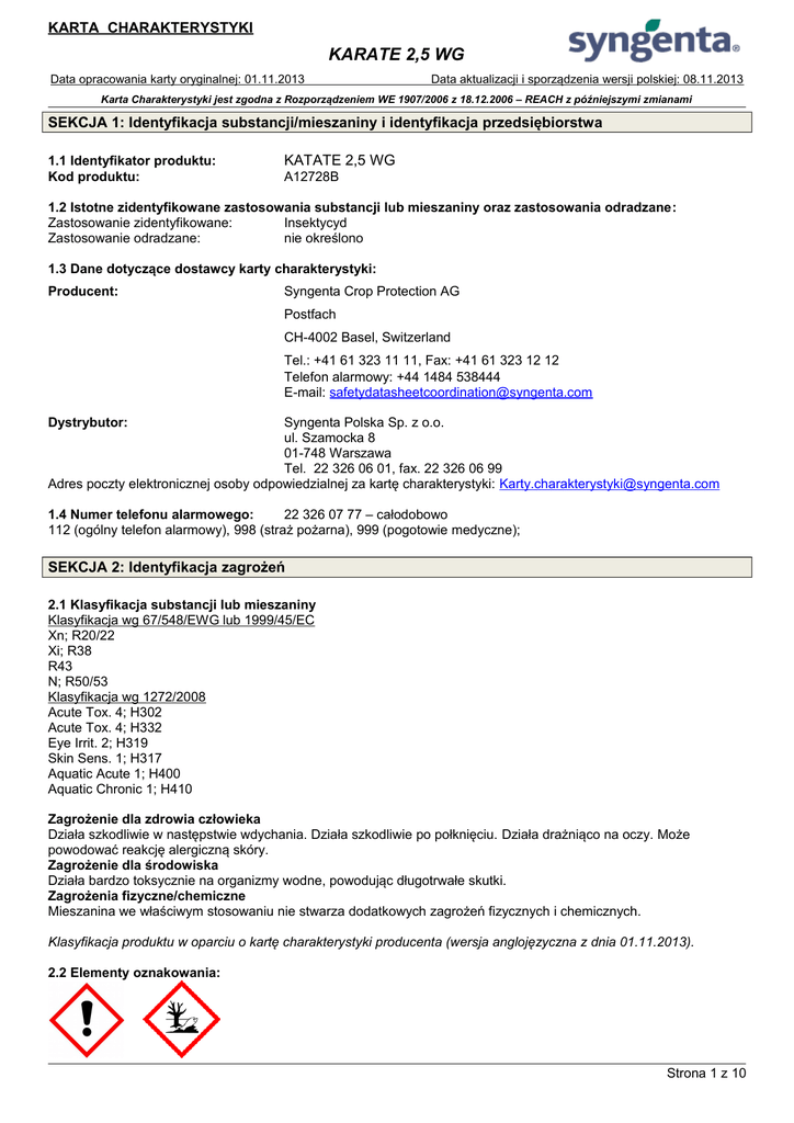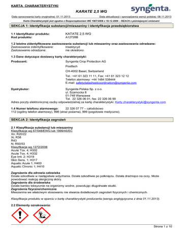 KARTA CHARAKTERYSTYKI KARATE 2,5 WG Data opracowania karty oryginalnej: 01.11.2013 Data aktualizacji i sporządzenia wersji polskiej: 08.11.2013 Karta Charakterystyki jest zgodna z Rozporządzeniem WE 1907/2006 z 18.12.2006 – REACH z późniejszymi zmianami SEKCJA 1: Identyfikacja substancji/mieszaniny i identyfikacja przedsiębiorstwa 1.1 Identyfikator produktu: Kod produktu: KATATE 2,5 WG A12728B 1.2 Istotne zidentyfikowane zastosowania substancji lub mieszaniny oraz zastosowania odradzane: Zastosowanie zidentyfikowane: Insektycyd Zastosowanie odradzane: nie określono 1.3 Dane dotyczące dostawcy karty charakterystyki: Producent: Syngenta Crop Protection AG Postfach CH-4002 Basel, Switzerland Tel.: +41 61 323 11 11, Fax: +41 61 323 12 12 Telefon alarmowy: +44 1484 538444 E-mail: [email protected] Dystrybutor: Syngenta Polska Sp. z o.o. ul. Szamocka 8 01-748 Warszawa Tel. 22 326 06 01, fax. 22 326 06 99 Adres poczty elektronicznej osoby odpowiedzialnej za kartę charakterystyki: [email protected] 1.4 Numer telefonu alarmowego: 22 326 07 77 – całodobowo 112 (ogólny telefon alarmowy), 998 (straż pożarna), 999 (pogotowie medyczne); SEKCJA 2: Identyfikacja zagrożeń 2.1 Klasyfikacja substancji lub mieszaniny Klasyfikacja wg 67/548/EWG lub 1999/45/EC Xn; R20/22 Xi; R38 R43 N; R50/53 Klasyfikacja wg 1272/2008 Acute Tox. 4; H302 Acute Tox. 4; H332 Eye Irrit. 2; H319 Skin Sens. 1; H317 Aquatic Acute 1; H400 Aquatic Chronic 1; H410 Zagrożenie dla zdrowia człowieka Działa szkodliwie w następstwie wdychania. Działa szkodliwie po połknięciu. Działa drażniąco na oczy. Może powodować reakcję alergiczną skóry. Zagrożenie dla środowiska Działa bardzo toksycznie na organizmy wodne, powodując długotrwałe skutki. Zagrożenia fizyczne/chemiczne Mieszanina we właściwym stosowaniu nie stwarza dodatkowych zagrożeń fizycznych i chemicznych. Klasyfikacja produktu w oparciu o kartę charakterystyki producenta (wersja anglojęzyczna z dnia 01.11.2013). 2.2 Elementy oznakowania: Strona 1 z 10 KARTA CHARAKTERYSTYKI KARATE 2,5 WG Data opracowania karty oryginalnej: 01.11.2013 Data aktualizacji i sporządzenia wersji polskiej: 08.11.2013 Karta Charakterystyki jest zgodna z Rozporządzeniem WE 1907/2006 z 18.12.2006 – REACH z późniejszymi zmianami Hasło ostrzegawcze: Uwaga Zwroty wskazujące rodzaj zagrożenia: H317 – Może powodować reakcję alergiczną skóry. H302 – Działa szkodliwie po połknięciu H319 – Działa drażniąco na oczy H332 – Działa szkodliwie w następstwie wdychania H410 – Działa bardzo toksycznie na organizmy wodne, powodując długotrwałe skutki. Zwroty określające warunki bezpiecznego stosowania: P102 – Chronić przed dziećmi. P261 – Unikać wdychania pyłu/dymu/gazu/mgły/par/rozpylonej cieczy. P270 – Nie jeść, nie pić ani nie palić podczas używania produktu. P280 – Stosować rękawice ochronne/odzież ochronną/ ochronę oczu/ochronę twarzy. P305+P351+P338 – W PRZYPADKU DOSTANIA SIĘ DO OCZU: Ostrożnie płukać wodą przez kilka minut. Wyjąć soczewki kontaktowe, jeżeli są i można je łatwo usunąć. P337+P313 – W przypadku utrzymywania się działania drażniącego na oczy: Zasięgnąć porady/zgłosić się pod opiekę lekarza. P391 – Zebrać wyciek. P501 – Zawartość/pojemnik usuwać do odpowiedniego zakładu utylizacji odpadów. EUH401 – W celu uniknięcia zagrożeń dla zdrowia ludzi i środowiska, należy postępować zgodnie z instrukcją użycia Składniki niebezpieczne które muszą być wymienione w etykiecie: lambda-cyhalotryna 2.3 Inne zagrożenia: Nie spełnia kryteriów PBT lub vPvB. Może powodować tymczasowe swędzenie, mrowienie, pieczenie lub drętwienie skóry, zwane parestezją. SEKCJA 3: Skład/informacja o składnikach 3.1 Substancje Nie dotyczy. 3.2 Mieszaniny: Niebezpieczne składniki: Identyfikator produktu Lambda – cyhalotryna CAS: 91465-08-6 WE: 415-130-7 Nr indeksowy: 607-252-00-6 Nr REACH: substancja podlega przepisom okresu przejściowego Zawartość % 2,5 Klasyfikacja wg 67/548/EWG T+:R26 T:R25 Xn:R21 N: R50/53 Klasyfikacja CLP Kody zwrotów Klasa zagrożenia i wskazujących kody kategorii rodzaj zagrożenia Acute Tox. 2 Acute Tox. 3 Acute Tox. 4 Aquatic Acute 1 Aquatic Chronic 1 H330 H301 H312 H400 H410 Strona 2 z 10 KARTA CHARAKTERYSTYKI KARATE 2,5 WG Data opracowania karty oryginalnej: 01.11.2013 Data aktualizacji i sporządzenia wersji polskiej: 08.11.2013 Karta Charakterystyki jest zgodna z Rozporządzeniem WE 1907/2006 z 18.12.2006 – REACH z późniejszymi zmianami Mieszanina alkilonaftalenu z sulfonianem sodu CAS:WE: Nr indeksowy: Nr REACH: substancja podlega przepisom okresu przejściowego 5 – 10 Xi; R38; R41 Skin Irrit. 2 Eye Dam. 1 H315 H318 Pełna treść zwrotów R i H w sekcji 16 Zawiera: talk; CAS 14807-96-6, WE 238-877-9 w stężeniu 40 – 50%. SEKCJA 4: Środki pierwszej pomocy 4.1 Opis środków pierwszej pomocy Uwagi ogólne W przypadku kontaktu na numer alarmowym firmy Syngenta lub centrum ostrych zatruć należy mieć przy sobie pojemnik produktu, etykietę lub niniejszą kartę charakterystyki. Narażenie inhalacyjne: W razie zawrotów głowy lub nudności wyprowadzić poszkodowanego na świeże powietrze. W przypadku zatrzymania oddechu zastosować sztuczne oddychanie. Zapewnić poszkodowanemu ciepło i warunki do odpoczynku. Skontaktować się z lekarzem lub centrum ostrych zatruć. W przypadku kontaktu ze skórą: Zdjąć zanieczyszczoną odzież, umyć zabrudzoną skórę i spłukać dokładnie wodą, w przypadku pojawienia się podrażnienia, rumieni skontaktować się z lekarzem. W przypadku kontaktu z oczami: Upewnić się, że poszkodowany nie nosi szkieł kontaktowych – jeśli tak – wyjąć je. Przepłukać oczy przez kilkanaście minut (ok. 15) dużą ilością wody, trzymając powieki szeroko rozwarte. Unikać silnego strumienia, ze względu na niebezpieczeństwo uszkodzenia rogówki, skontaktować się z lekarzem. W przypadku połkn