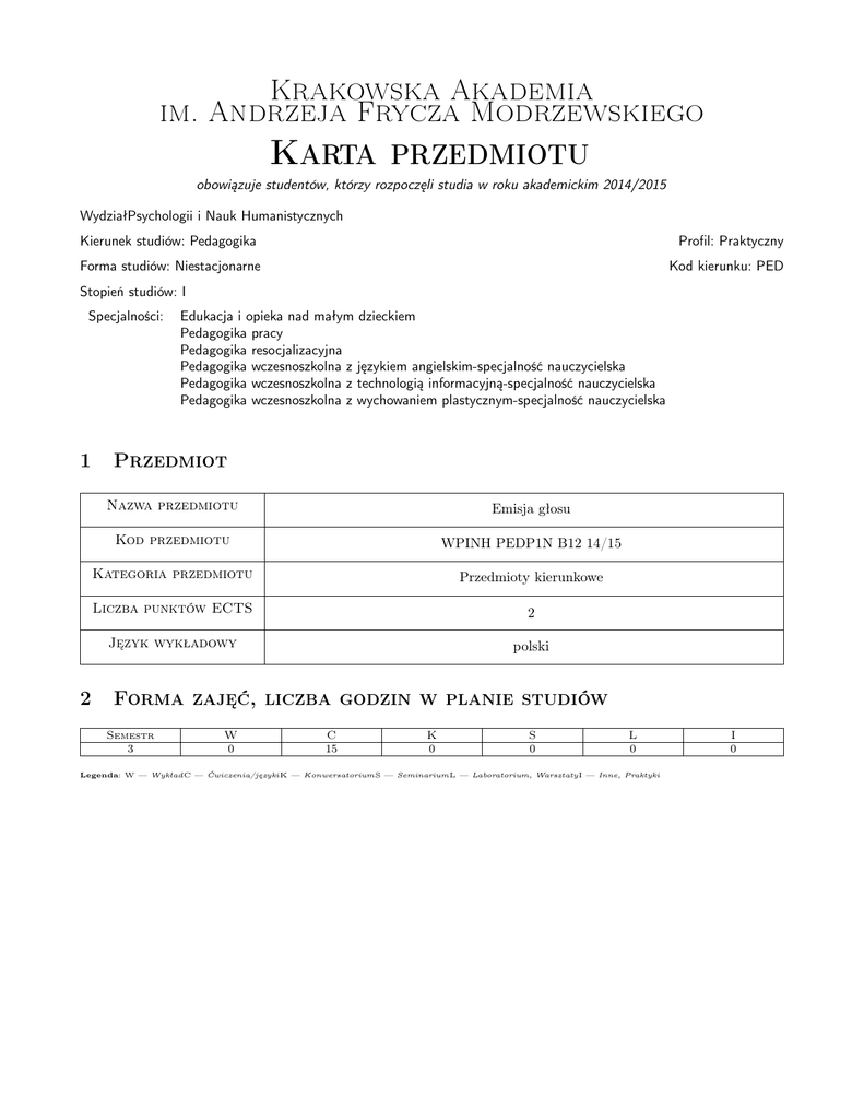 Krakowska Akademia im. Andrzeja Frycza Modrzewskiego Karta przedmiotu obowiązuje studentów, którzy rozpoczęli studia w roku akademickim 2014/2015 WydziałPsychologii i Nauk Humanistycznych Kierunek studiów: Pedagogika Profil: Praktyczny Forma studiów: Niestacjonarne Kod kierunku: PED Stopień studiów: I Specjalności: 1 2 Edukacja i opieka nad małym dzieckiem Pedagogika pracy Pedagogika resocjalizacyjna Pedagogika wczesnoszkolna z językiem angielskim-specjalność nauczycielska Pedagogika wczesnoszkolna z technologią informacyjną-specjalność nauczycielska Pedagogika wczesnoszkolna z wychowaniem plastycznym-specjalność nauczycielska Przedmiot Nazwa przedmiotu Emisja głosu Kod przedmiotu WPINH PEDP1N B12 14/15 Kategoria przedmiotu Przedmioty kierunkowe Liczba punktów ECTS 2 Język wykładowy polski Forma zajęć, liczba godzin w planie studiów Semestr 3 W 0 C 15 K 0 S 0 L 0 Legenda: W — WykładC — Ćwiczenia/językiK — KonwersatoriumS — SeminariumL — Laboratorium, WarsztatyI — Inne, Praktyki I 0 Krakowska Akademia im. Andrzeja Frycza Modrzewskiego 3 Cele przedmiotu Cel 1 W oparciu o efekty kształcenia, student zdobywa wiedzę i uczy się poprawnego wydobywania głosu, polegającego na skoordynowanej pracy aparatu głosowego i mięśni oddechowych, prawidłowej impostacji głosu, której celem jest zwiększenie siły głosu oraz poprawnej dykcji i artykulacji języka polskiego. 4 Wymagania wstępne 1 Nie ma. 5 Modułowe efekty kształcenia MW1 Wiedza: Student, który zaliczył przedmiot: potrafi wskazać nieprawidłowy oddech, zweryfikować prace ruchomego aparatu głosowego, wskazać poprawna artykulacje poszczególnych słów. MU2 Umiejętności: Student, który zaliczył przedmiot: potrafi praktycznie zastosować zasady ortofonii w mowie potocznej i tekstach literackich. MK3 Kompetencje społeczne: Student, który zaliczył przedmiot: jest świadomy konieczności stałego uaktualniania wiedzy, jest otwarty na wszelkie nowości tak z zakresu ortofonii jak i medycyny w zwiazku z leczeniem chorób zawodowych nauczycieli oraz zmian w Karcie Nauczyciela odnośnie chorób zawodowych. MK4 Kompetencje społeczne: Student jest otwarty na wszelkie nowości tak z zakresu ortofonii jak i medycyny w związku z leczeniem chorób zawodowych nauczycieli oraz zmian w Karcie Nauczyciela odnośnie chorób zawodowych. 6 Treści programowe Lp C1 7 Ćwiczenia/języki Tematyka zajęć Opis szczegółowy bloków tematycznych -Informacje dotyczące zaliczenia. Definicja emisji głosu. Dlaczego należy kształcić głos-głos ludzki instrumentem muzycznym. Nauka oddychania przeponą. Rodzaje oddychania - ćwiczenia praktyczne. Ćwiczenia emisyjne. Samogłoski, spółgłoski, poprawna dykcja - ćwiczenia. Dźwwięk jako zjawisko akustyczne, ćwiczenia na otwarcie krtani. Układ oddechowy generatorem dźwięku. Funkcja krtani, ćwiczenia. Rezonatory i ich rola. Timbre głosu ćwiczenia emisyjne na miękkie podniebienie. Barwa głosu - ćwiczenia. Ćwiczenia dykcji - ćwiczenia głosek zwartych, ćwiczenia głosek szczelinowych i zwartoszczelinowych. Systematyka głosów, rodzaje zakres (ambitus). Patologia głosu - choroby zawodowe. Razem Liczba godzin 15 15 Metody dydaktyczne M3. Ćwiczenia projektowe MI1. Omawianie zagadnien teoretycznych; cwiczenia praktyczne emisyjne, cwiczenia dykcji na bazie wypisów z poezji i literatury polskiej. MI2. Zajecia teoretyczno praktyczne. MI3. cwiczenia Strona 2/4 Krakowska Akademia im. Andrzeja Frycza Modrzewskiego 8 Obciążenie pracą studenta Średnia liczba godzin na zrealizowanie aktywności Forma aktywności Godziny kontaktowe z nauczycielem akademickim, w tym: Godziny wynikające z planu studiów 15 Konsultacje przedmiotowe 0 Egzaminy i zaliczenia w sesji 0 Godziny bez udziału nauczyciela akademickiego wynikające z nakładu pracy studenta, w tym: Przygotowanie się do zajęć, w tym studiowanie zalecanej literatury 35 Opracowanie wyników 0 Przygotowanie raportu, projektu, prezentacji, dyskusji 0 Sumaryczna liczba godzin dla przedmiotu wynikająca z 50 całego nakładu pracy studenta 2 Sumaryczna liczba punktów ECTS dla przedmiotu 9 Metody oceny Obecność na zajęciach, aktywny udział w zajęciach. Ocena podsumowująca P9. Zaliczenie ustne Warunki zaliczenia przedmiotu 1 3 nieobcności powodują konieczność zaliczenia materiału. Kryteria oceny Na ocenę 3 Na ocenę 3.5 Na ocenę 4 Na ocenę 4.5 Na ocenę 5 10 Opanowanie podstawowych wiadomości z zajęć. Poprawne opanowanie wiadomości teoretycznych i ćwiczeń. Poprawne opanowanie wiadomości z zajęć i przygotowanie zadań domowych. Aktywność na zajęciach. Poprawne opanowanie wiadomości z zajęć i przygotowanie zadań domowych, obecność na wszystkich zajęciach. Aktywność na zajęciach. Umiejętność wykorzystania zdobytych wiadomości w praktycznych ćwiczeniach, obecność na wszystkich zajęciach. Aktywność na zajęciach. Macierz realizacji przedmiotu Modułowe efekty kształcenia dla przedmiotu MW1 MU1 MK1 MK2 Odniesienie do efektów kierunkowych K_W08 SN W b) K_W18 SN W l) K_K01 SN K a) K_K12 SN K f) Treści programowe Metody dydaktyczne Sposoby oceny C1 C1 C1 C1 MI1 MI1 MI1 MI1 P9 P9 P9 P9 Strona 3/4 Krakowska Akademia im. Andrzeja Frycza Modrzewskiego 11 Wykaz literatury Literatura podstawowa: [1] Bogumiła Tarasiewicz — Mówie i spiewam swiadomie, Kraków, 2003, Universitas [2] Bogumiła Toczyska — Łamance z dedykacja, Gdansk, 2006, Podkowa Literatura uzupełniająca: [1] I. Polak — Znaczenie emisji głosu w kształceniu nauczycieli, Wrocław, 1990, Akademia Muzyczna we Wrocławiu 12 Informacje o nauczycielach akademickich Oboba odpowiedzialna za kartę dr Ewa Frydel-Jasińska (kontakt: [email protected]) Strona 4/4