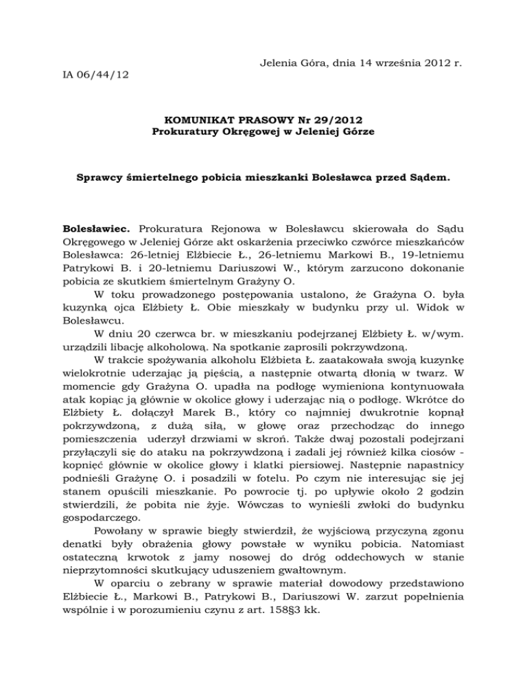 Jelenia Góra, dnia 14 września 2012 r. IA 06/44/12 KOMUNIKAT PRASOWY Nr 29/2012 Prokuratury Okręgowej w Jeleniej Górze Sprawcy śmiertelnego pobicia mieszkanki Bolesławca przed Sądem. Bolesławiec. Prokuratura Rejonowa w Bolesławcu skierowała do Sądu Okręgowego w Jeleniej Górze akt oskarżenia przeciwko czwórce mieszkańców Bolesławca: 26-letniej Elżbiecie Ł., 26-letniemu Markowi B., 19-letniemu Patrykowi B. i 20-letniemu Dariuszowi W., którym zarzucono dokonanie pobicia ze skutkiem śmiertelnym Grażyny O. W toku prowadzonego postępowania ustalono, że Grażyna O. była kuzynką ojca Elżbiety Ł. Obie mieszkały w budynku przy ul. Widok w Bolesławcu. W dniu 20 czerwca br. w mieszkaniu podejrzanej Elżbiety Ł. w/wym. urządzili libację alkoholową. Na spotkanie zaprosili pokrzywdzoną. W trakcie spożywania alkoholu Elżbieta Ł. zaatakowała swoją kuzynkę wielokrotnie uderzając ją pięścią, a następnie otwartą dłonią w twarz. W momencie gdy Grażyna O. upadła na podłogę wymieniona kontynuowała atak kopiąc ją głównie w okolice głowy i uderzając nią o podłogę. Wkrótce do Elżbiety Ł. dołączył Marek B., który co najmniej dwukrotnie kopnął pokrzywdzoną, z dużą siłą, w głowę oraz przechodząc do innego pomieszczenia uderzył drzwiami w skroń. Także dwaj pozostali podejrzani przyłączyli się do ataku na pokrzywdzoną i zadali jej również kilka ciosów kopnięć głównie w okolice głowy i klatki piersiowej. Następnie napastnicy podnieśli Grażynę O. i posadzili w fotelu. Po czym nie interesując się jej stanem opuścili mieszkanie. Po powrocie tj. po upływie około 2 godzin stwierdzili, że pobita nie żyje. Wówczas to wynieśli zwłoki do budynku gospodarczego. Powołany w sprawie biegły stwierdził, że wyjściową przyczyną zgonu denatki były obrażenia głowy powstałe w wyniku pobicia. Natomiast ostateczną krwotok z jamy nosowej do dróg oddechowych w stanie nieprzytomności skutkujący uduszeniem gwałtownym. W oparciu o zebrany w sprawie materiał dowodowy przedstawiono Elżbiecie Ł., Markowi B., Patrykowi B., Dariuszowi W. zarzut popełnienia wspólnie i w porozumieniu czynu z art. 158§3 kk.