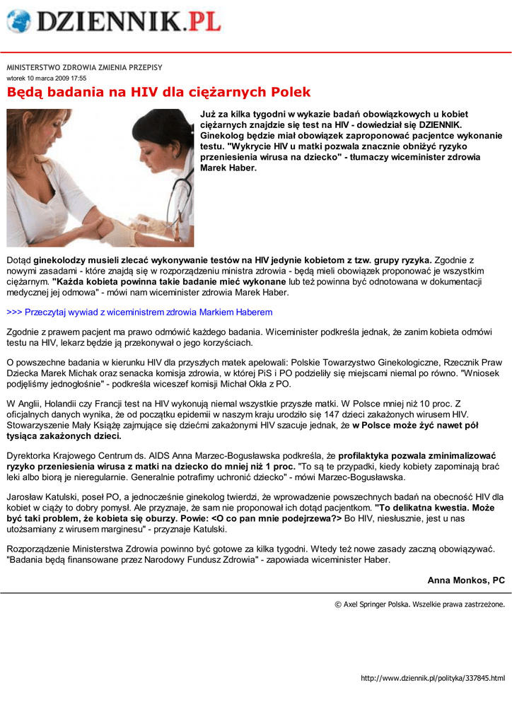 MINISTERSTWO ZDROWIA ZMIENIA PRZEPISY wtorek 10 marca 2009 17:55 Będą badania na HIV dla ciężarnych Polek Już za kilka tygodni w wykazie badań obowiązkowych u kobiet ciężarnych znajdzie się test na HIV - dowiedział się DZIENNIK. Ginekolog będzie miał obowiązek zaproponować pacjentce wykonanie testu. "Wykrycie HIV u matki pozwala znacznie obniżyć ryzyko przeniesienia wirusa na dziecko" - tłumaczy wiceminister zdrowia Marek Haber. Dotąd ginekolodzy musieli zlecać wykonywanie testów na HIV jedynie kobietom z tzw. grupy ryzyka. Zgodnie z nowymi zasadami - które znajdą się w rozporządzeniu ministra zdrowia - będą mieli obowiązek proponować je wszystkim ciężarnym. "Każda kobieta powinna takie badanie mieć wykonane lub też powinna być odnotowana w dokumentacji medycznej jej odmowa" - mówi nam wiceminister zdrowia Marek Haber. >>> Przeczytaj wywiad z wiceministrem zdrowia Markiem Haberem Zgodnie z prawem pacjent ma prawo odmówić każdego badania. Wiceminister podkreśla jednak, że zanim kobieta odmówi testu na HIV, lekarz będzie ją przekonywał o jego korzyściach. O powszechne badania w kierunku HIV dla przyszłych matek apelowali: Polskie Towarzystwo Ginekologiczne, Rzecznik Praw Dziecka Marek Michak oraz senacka komisja zdrowia, w której PiS i PO podzieliły się miejscami niemal po równo. "Wniosek podjęliśmy jednogłośnie" - podkreśla wiceszef komisji Michał Okła z PO. W Anglii, Holandii czy Francji test na HIV wykonują niemal wszystkie przyszłe matki. W Polsce mniej niż 10 proc. Z oficjalnych danych wynika, że od początku epidemii w naszym kraju urodziło się 147 dzieci zakażonych wirusem HIV. Stowarzyszenie Mały Książę zajmujące się dziećmi zakażonymi HIV szacuje jednak, że w Polsce może żyć nawet pół tysiąca zakażonych dzieci. Dyrektorka Krajowego Centrum ds. AIDS Anna Marzec-Bogusławska podkreśla, że profilaktyka pozwala zminimalizować ryzyko przeniesienia wirusa z matki na dziecko do mniej niż 1 proc. "To są te przypadki, kiedy kobiety zapominają brać leki albo biorą je nieregularnie. Generalnie potrafimy uchronić dziecko" - mówi Marzec-Bogusławska. Jarosław Katulski, poseł PO, a jednocześnie ginekolog twierdzi, że wprowadzenie powszechnych badań na obecność HIV dla kobiet w ciąży to dobry pomysł. Ale przyznaje, że sam nie proponował ich dotąd pacjentkom. "To delikatna kwestia. Może być taki problem, że kobieta się oburzy. Powie: <O co pan mnie podejrzewa?> Bo HIV, niesłusznie, jest u nas utożsamiany z wirusem marginesu" - przyznaje Katulski. Rozporządzenie Ministerstwa Zdrowia powinno być gotowe za kilka tygodni. Wtedy też nowe zasady zaczną obowiązywać. "Badania będą finansowane przez Narodowy Fundusz Zdrowia" - zapowiada wiceminister Haber. Anna Monkos, PC © Axel Springer Polska. Wszelkie prawa zastrzeżone. http://www.dziennik.pl/polityka/337845.html