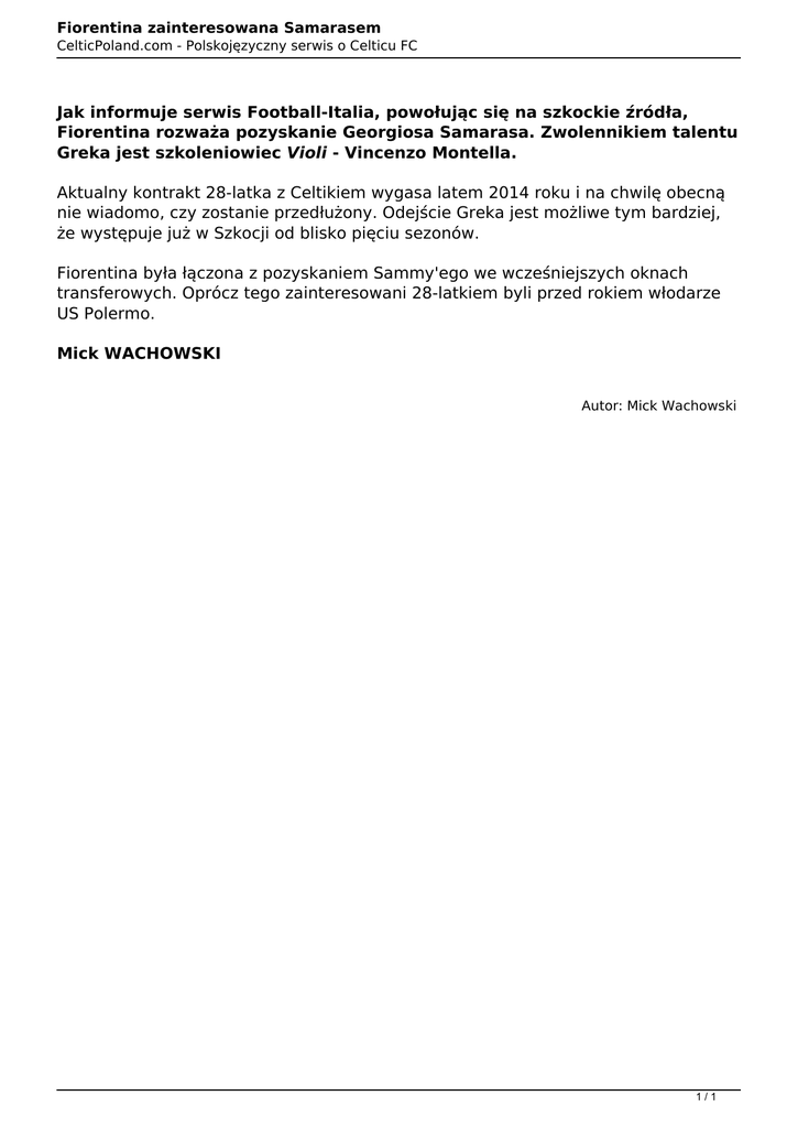 Fiorentina zainteresowana Samarasem CelticPoland.com - Polskojęzyczny serwis o Celticu FC Jak informuje serwis Football-Italia, powołując się na szkockie źródła, Fiorentina rozważa pozyskanie Georgiosa Samarasa. Zwolennikiem talentu Greka jest szkoleniowiec Violi - Vincenzo Montella. Aktualny kontrakt 28-latka z Celtikiem wygasa latem 2014 roku i na chwilę obecną nie wiadomo, czy zostanie przedłużony. Odejście Greka jest możliwe tym bardziej, że występuje już w Szkocji od blisko pięciu sezonów. Fiorentina była łączona z pozyskaniem Sammy'ego we wcześniejszych oknach transferowych. Oprócz tego zainteresowani 28-latkiem byli przed rokiem włodarze US Polermo. Mick WACHOWSKI Autor: Mick Wachowski 1/1 Powered by TCPDF (www.tcpdf.org)