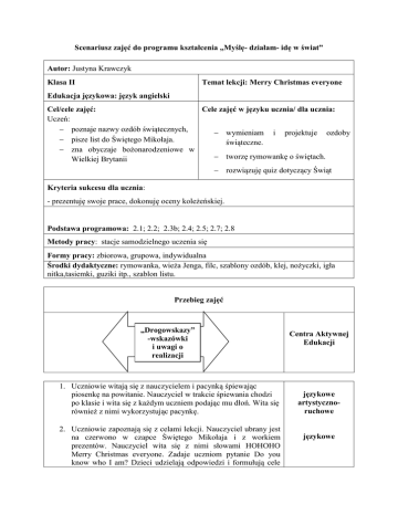 Scenariusz zajęć do programu kształcenia „Myślę- działam- idę w świat” Autor: Justyna Krawczyk Klasa II Temat lekcji: Merry Christmas everyone Edukacja językowa: język angielski Cel/cele zajęć: Cele zajęć w języku ucznia/ dla ucznia: Uczeń: poznaje nazwy ozdób świątecznych, wymieniam i projektuje ozdoby pisze list do Świętego Mikołaja. świąteczne. zna obyczaje bożonarodzeniowe w tworzę rymowankę o świętach. Wielkiej Brytanii rozwiązuję quiz dotyczący Świąt Kryteria sukcesu dla ucznia: - prezentuję swoje prace, dokonuję oceny koleżeńskiej. Podstawa programowa: 2.1; 2.2; 2.3b; 2.4; 2.5; 2.7; 2.8 Metody pracy: stacje samodzielnego uczenia się Formy pracy: zbiorowa, grupowa, indywidualna Środki dydaktyczne: rymowanka, wieża Jenga, filc, szablony ozdób, klej, nożyczki, igła nitka,tasiemki, guziki itp., szablon listu. Przebieg zajęć „Drogowskazy” -wskazówki i uwagi o realizacji Uczniowie witają się z nauczycielem i pacynką śpiewając piosenkę na powitanie. Nauczyciel w trakcie śpiewania chodzi po klasie i wita się z każdym uczniem podając mu dłoń. Wita się również z nimi wykorzystując pacynkę. Uczniowie zapoznają się z celami lekcji. Nauczyciel ubrany jest na czerwono w czapce Świętego Mikołaja i z workiem prezentów. Nauczyciel wita się z nimi słowami HOHOHO Merry Christmas everyone. Zadaje uczniom pytanie Do you know who I am? Dzieci udzielają odpowiedzi i formułują cele Centra Aktywnej Edukacji językowe artystycznoruchowe językowe lekcji z nauczycielem. Nauczyciel mówi dzieciom że ma dla nich prezenty. Rozkłada na stolikach cztery świąteczne torby. Następnie dzieli dzieci na cztery grupy (załącznik 1 obrazki należy powielić i podzielić tak aby wyszły równe grupy). Zanim uczniowie rozpoczną rozwiązywać zadania nauczyciel za pomocą burzy mózgów zbiera od uczniów informacje na temat świąt ( uczniowie jako zadanie domowe mieli poszukać informacji na temat świąt)Uczniowie każdej z grup siadaj przy jednym stoliku (stacji) i rozwiązują zadania przez 5 min, gdy czas minie na sygnał nauczyciela zmieniają się z inna grupą i kontynuują wykonywanie zadań. językowe językowe artystycznoruchowe a) Stacja I . Uczniowie układają rymowankę z rozsypanki. (załącznik 2) b) Stacja II. Uczniowie wykonują ozdoby świąteczne z filcu i nazywają je (załącznik 3). Ozdoby powinny być już wycięte i przygotowane do złożenia. c) Stacja III. Uczniowie piszą list do Świętego Mikołaja wpisujące brakujące słowa z tabelki ( załącznik 4) d) Stacja IV. Uczniowie graja w grę. W tym celu nauczyciel wykorzystuje klocki z wieży Jenga. Na klocku z jednej strony zapisuje angielska nazwę np. Santa a na odwrocie polską Mikołaj (załącznik 5). Uczniowie kolejno wyciągają klocki z wieży i opowiadają na pytania za poprawną odpowiedź przyznają sobie punkt (np. obrazek z załącznika 1). Po wykonaniu zadania uczniowie zliczają punkty. Podsumowanie: Uczniowie prezentują swoje prace. Na jednym dużym arkuszu przyczepiają ozdoby świąteczne, list do Mikołaja oraz rymowankę oraz wyłaniają elfa mistrza który najlepiej poradził sobie z wieżą Jenga. Uczniowie żegnają się z nauczycielem i pacynką ułożoną przez siebie rymowanką. językowe artystycznoruchowe językowe artystycznoruchowe Załącznik 1 – scenariusz 15 Merry Christmas everyone Załącznik 2 – scenariusz 15 Merry Christmas ( rymowankę należy pociąć na dowolne paski w zależności od poziomu klasy) Christmas is coming One two three Decorate the Christmas tree. Put some angels bells and light See as it is shining bright Look through the window Maybe you see Santa with presents For you and me. “Christmas” Christmas is coming One, two, three. Decorate the Christmas tree. Put some angels, bells, and light See as it is shining bright. Look through the window Maybe you see. Santa with presents For you and me. Załącznik 3 – scenariusz 15 – Merry Christmas. Pomysły można zaczerpnąć ze strony: http://jakchcemy.pl/ozdoby-swiateczne-z-filcu/ Załącznik 4 – scenariusz 15 Merry Christmas ( należy zmienić miejscowość oraz nazwisko nauczyciela) Uczniowie uzupełniaja list wyrażeniami z ramki. Wyrażenia należy wyciąć i podać uczniom. 9, are, Krawczyk, presents, school,Thank, class, Christmas, teacher, students, have,snow Dear Santa Claus ………………… you for your ……………… from last year. We are from Primary ………………………….We are ……………. years old. We are ...……. Skalmierzyce. We go to …………….. 2A. Our …………………..is Mrs ……………………. We are very good ……………….. This year we would like to ………….some gifts. Here is the list: 1. ……………………………………………….. 2. ……………………………………………….. 3. ……………………………………………….. 4. ………………………………………………. We wish you Merry ………………………….. and a lot of ……………. Your …………… Załącznik 5 – scenariusz 15 Merry christmas ( słowa do klocków Jenga – można zapisać pisakiem na klockach lub wydrukować i przykleić) 24 grudnia 25 grudnia 26 grudnia Mikołaj Gwiazda Anioł Choinka Prezent Skarpeta Renifer Elf Dzwonek Sanie Śnieg Kolęda Wór Światełka Kominek Łańcuch Christmas Eve Christmas Day Boxing Day Santa Claus Star Angel Christmas tree Gift Stocking Reindeer Elf Bell Sleigh Snow Carol Sack Lights Fire place Chain