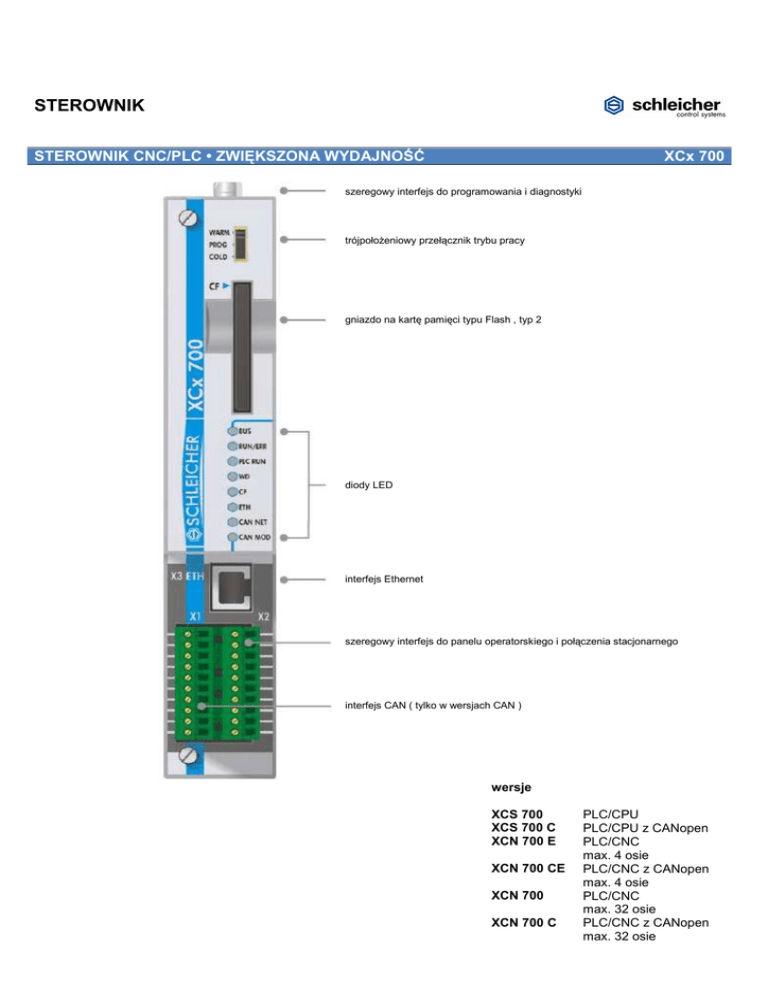 STEROWNIK STEROWNIK CNC/PLC • ZWIĘKSZONA WYDAJNOŚĆ XCx 700 szeregowy interfejs do programowania i diagnostyki trójpołoŜeniowy przełącznik trybu pracy gniazdo na kartę pamięci typu Flash , typ 2 diody LED interfejs Ethernet szeregowy interfejs do panelu operatorskiego i połączenia stacjonarnego interfejs CAN ( tylko w wersjach CAN ) wersje XCS 700 XCS 700 C XCN 700 E XCN 700 CE XCN 700 XCN 700 C PLC/CPU PLC/CPU z CANopen PLC/CNC max. 4 osie PLC/CNC z CANopen max. 4 osie PLC/CNC max. 32 osie PLC/CNC z CANopen max. 32 osie DANE TECHNICZNE XCS 700 nr artykułu sterownik R4.506.0080.0 XCS 700 C XCN 700 E XCN 700 CE XCN 700 XCN 700 C R4.506.0070.0 R4.506.0030.0 R4.506.0040.0 R4.506.0060.0 R4.506.0050.0 PLC CNC/PLC konfiguracja sprzętowa i pamięć procesor pamięć zegar buforowanie pamięć Flash (typ 2, zewnętrzna) procesor Intel PXA 255 (32-bitowy rdzeń, 400 MHz) SD-RAM: 32 MB S-RAM: 1 KB Flash (wewnętrzna): 4 KB kompaktowa Flash: 32 MB zasilanie bateryjne, kalendarz z latami przestępnymi, dokładność 1s min. 3 godziny, bateria w UNG dla systemu operacyjnego i danych uŜytkownika od 16 MB do 1 GB właściwości CNC/PLC czas wykonania 1000 instrukcji czas rozprzestrzeniania sygnału bloki funkcyjne liczba osi / podsystemów cykl interpolacji CNC cykl bloku system operacyjny liczba zadań cykl wykonywania zadań pamięć flagi PLC zarządzanie pamięcią czas i licznik bit: ok. 0,4 ms bajt / Word / DWord: ok.0,2 ms 1 ms od wejścia do wyjścia kaŜda liczba z oprogramowania układowego i bloku funkcyjnego -/-/4/2 4/2 32 / 16 1 ms 1 ms 1 ms 1 ms 1 ms 1 ms VxWorks, wielozadaniowy system operacyjny ( czas / priorytet ) 18 programowalny ≥ 1ms (kaŜda liczba) Dane: max. 16384 KB Program: 4096 KB Trwałe: 265 KB Nietrwałe: 2048 KB dynamiczne dowolna wartość z zakresu 1 ms…290 h (liczba ograniczona pojemnością pamięci) 32 / 16 1 ms 1 ms oprogramowanie / szyna danych system operacyjny PLC system operacyjny CNC konfiguracja • • • • • • • • Multiprog (zgodnie z IEC 61131-3, zawiera serwer OPC) • (opcja) ProCANopen (konfigurator sieci CANopen) • (opcja) • • interfejs CANopen (X1) dla urządzenia RS232 (X2) RS422/RS485 (X2) Ethernet (X3) RS232 (X4) 10-pin terminal zaciskowy ,dla szyny i sterownika • • 10-pin terminal zaciskowy, dla stałego połączenia szeregowych urządzeń 10-pin terminal zaciskowy, interfejs szeregowy panelu operatorskiego struktura sieciowa, RJ45, 10 Mbit/s interfejs do programowania i diagnozowania, 9-pin wtyczka subminiaturowa obudowa, montaŜ, zasilanie napięcie zasilania pobór mocy DC 24 V izolacja (od wewnętrznej elektroniki ) waga 24 V DC ± 20% tętnienie max. 5% max. 6 W X1 (CAN): tak X2 (RS232): tak X2 (RS422/RS485): tak X3 (Ethernet): tak X4 (RS232): nie 0,42 kg • tryby pracy typ przełącznika tryby pracy trójpołoŜeniowy PROG: PLC stop, tryb programowania WARM: PLC startuje z zapamiętanymi wartościami COLD: PLC startuje z wartościami początkowymi dla resetu sprzętowego wyłączenie zasilania, efektywny tylko w trybie PROG przycisk RESET wyświetlacz LED BUS zielone, zał. czerwone, migające wyłączone RUN/ERR Ŝółte, zał. zielone, zał. czerwone, migające wył. PLC RUN zielone, zał. Ŝółte, migające wył. WD czerwone, zał wył. CF zielone, zał. czerwone, zał. wył. ETH zielone, zał. czerwone, zał. CAN NET zielone, zał. zielone, migające czerwone, zał. czerwone, migające wył. CAN MOD zielone, zał. zielone, migające czerwone, zał. czerwone, migające szyna komunikacyjna dostęp do szyny OK błąd dostępu / błąd konfiguracji brak dostępu (PLC stop) stan CPU CPU bootowanie CPU pracuje, napięcie zasilania OK, Ŝadnych błędów błąd, nie moŜna zbootować CPU CPU uszkodzone tryb pracy PLC PLC pracuje PLC działa, wyjścia zresetowane (gotowe do działania) PLC stop Watchdog powaŜny błąd, system operacyjny zatrzymany watchdog nieaktywny Pamięć Flash dostęp do pamięci błąd dostępu brak dostępu do pamięci sieć Ethernet dostęp do pamięci brak połączenia stan sieci CAN (tylko wersje z CAN) CAN działa CAN gotowy do działania szyna zbiorcza wyłączona błąd sieci CAN przygotowany stan modułu CAN (tylko wersje z CAN) inicjalizacja CAN niewłaściwa konfiguracja CAN jednostka kontrolna niegotowa lub powaŜny błąd błąd w sterowniku