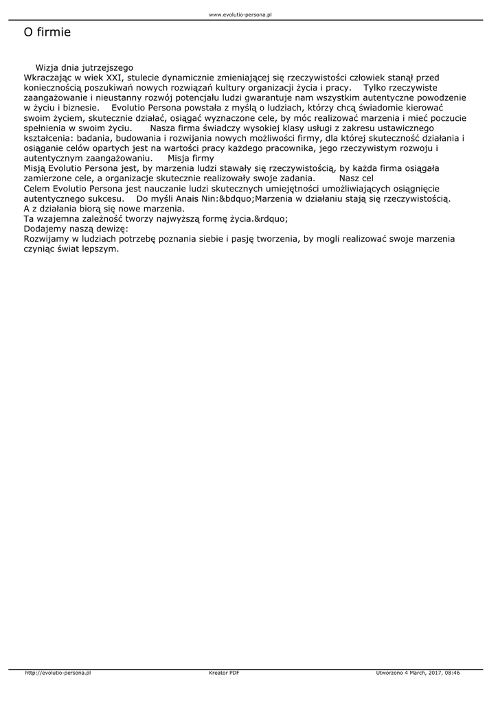 www.evolutio-persona.pl O firmie Wizja dnia jutrzejszego Wkraczając w wiek XXI, stulecie dynamicznie zmieniającej się rzeczywistości człowiek stanął przed koniecznością poszukiwań nowych rozwiązań kultury organizacji życia i pracy. Tylko rzeczywiste zaangażowanie i nieustanny rozwój potencjału ludzi gwarantuje nam wszystkim autentyczne powodzenie w życiu i biznesie. Evolutio Persona powstała z myślą o ludziach, którzy chcą świadomie kierować swoim życiem, skutecznie działać, osiągać wyznaczone cele, by móc realizować marzenia i mieć poczucie spełnienia w swoim życiu. Nasza firma świadczy wysokiej klasy usługi z zakresu ustawicznego kształcenia: badania, budowania i rozwijania nowych możliwości firmy, dla której skuteczność działania i osiąganie celów opartych jest na wartości pracy każdego pracownika, jego rzeczywistym rozwoju i autentycznym zaangażowaniu. Misja firmy Misją Evolutio Persona jest, by marzenia ludzi stawały się rzeczywistością, by każda firma osiągała zamierzone cele, a organizacje skutecznie realizowały swoje zadania. Nasz cel Celem Evolutio Persona jest nauczanie ludzi skutecznych umiejętności umożliwiających osiągnięcie autentycznego sukcesu. Do myśli Anais Nin:„Marzenia w działaniu stają się rzeczywistością. A z działania biorą się nowe marzenia. Ta wzajemna zależność tworzy najwyższą formę życia.” Dodajemy naszą dewizę: Rozwijamy w ludziach potrzebę poznania siebie i pasję tworzenia, by mogli realizować swoje marzenia czyniąc świat lepszym. http://evolutio-persona.pl Kreator PDF Utworzono 4 March, 2017, 08:46
