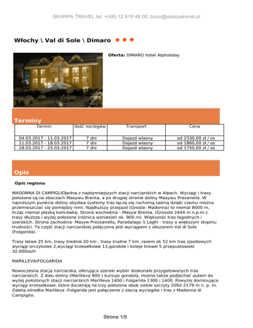 SKARPA TRAVEL tel. +(48) 12 619 48 00, [email protected] Włochy \ Val di Sole \ Dimaro Oferta: DIMARO hotel Alpholiday Terminy Termin 04.03.2017 - 11.03.2017 11.03.2017 - 18.03.2017 18.03.2017 - 25.03.2017 Ilość noclegów 7 dni 7 dni 7 dni Transport Dojazd wlasny Dojazd wlasny Dojazd wlasny Cena od 2330,00 zł / os od 1860,00 zł / os od 1750,00 zł / os Opis Opis regionu MADONNA DI CAMPIGLIOJedna z najsłynniejszych stacji narciarskich w Alpach. Wyciągi i trasy położone są na zboczach Masywu Brenta, a po drugiej stronie doliny Masywu Presanella. W najniższym punkcie doliny obydwa systemy tras łączą się ruchomą taśmą dzięki czemu można przemieszczać się pomiędzy nimi. Najdłuższy przejazd (Groste- Madonna) to niemal 8000 m, licząc niemal płaską końcówkę. Strona wschodnia - Masyw Brenta, (Grosste 2444 m n.p.m.): trasy dłuższe i wyżej położone (różnica wzniesień ok. 900 m). Większość tras łagodnych i szerokich. Strona zachodnia- Masyw Pressanella, Paradalago 5 Laghi - trasy o większym stopniu trudności. Ta część stacji narciarskiej połączona jest wyciągiem z obszarem Val di Sole (Folgarida). Trasy łatwe 25 km, trasy średnie 20 km , trasy trudne 7 km ,razem ok 52 km tras zjazdowych wyciągi orczykowe 2,wyciągi krzesełkowe 13,gondole i koleje linowe 5 przepustowość 32.000os/h MARILLEVA/FOLGARIDA Nowoczesna stacja narciarska, oferująca szeroki wybór doskonale przygotowanych tras narciarskich. Z dołu doliny (Marilleva 900 ) kursuje gondola, można także podjechać autem do wyżej położonych stacji narciarskich Marilleva 1400 i Folgarida 1300 i 1400. Powyżej dominujące wyciągi krzesełkowe, które docierają na trzy położone obok siebie szczyty 2092-2179 m n. p. m. Zaletą ośrodka Marilleva -Folgarida jest połączenie z siecią wyciagów i tras z Madonna di Campiglio. Strona 1/5 SKARPA TRAVEL tel. +(48) 12 619 48 00, [email protected] Trasy łatwe 20 km, trasy średnie 30 km,trasy trudne 13 km, razem ok 63 km tras zjazdowych wyciągi orczykowe 5,wyciągi krzesełkowe 14,gondole i koleje linowe 7 przepustowość 32.000os/h PINZOLO Stacja usytuowana pod szczytem Cima Tossa w Masywie Brenta połączona z Madonną di Campiglio nową panoramiczną gondolą Pinzolo Campiglio Express. Najwyższy szczyt stacji to Dos del Sabion na wysokości 2100 m n.p.m. Różnica wzniesień jest znacznie większa niż w przypadku Madonny di Campiglio. Zjazd z góry na sam dół to ponad 8 km (pół na pół trasa czerwona i niebieska). W górnej części terenów narciarskich znajdują się wyłącznie trasy czerwone, w większości szerokie i znakomicie przygotowane. 2 trasy czarne dla prawdziwych ekspertów. Bardzo mała liczba narciarzy sprawia, że jest to raj dla zaawansowanych miłośników zjazdów lubiących nieco poszaleć. Trasy łatwe 7 km, trasy średnie 20 km , trasy trudne 3 km , razem ok 30 km tras zjazdowych wyciągi orczykowe 1, wyciągi krzesełkowe 8,gondole i koleje linowe 4 przepustowość 13.000 os/h Dzięki połaczeniu w sezonie 2010/11 Pinzolo z Madonna di Campiglio narciarze mają do dyspozycji ok 150 km tras narciarskich . Dlatego polecamy wybór karnetu Skiarea ( nowość) pozwalajacy korzystać ze stacji Madonna di Campiglio, Marilleva – Folgarida, Pinzolo. Dla bardziej oszczędnych polecamy wybór karnetu Pinzolo który pozwala na korzystanie z ok 30 km tras narciarskich w mało zatłoczonym ośrodku narciarskim. Stacje, mapy, karnety, kamerki KARNETY CENY PODANE W EUR Niski sezon Wysoki sezon do 23.12 , 09.01–27.01 28.01 - 12.03 13.03–10.04 Skipass 6 dni dorosły senior junior Val di Sole - Folgarida Marilleva 178 160 125 Val di Sole-4 dni Folgarida 211 190 148 Marilleva + 2 dni Skirea SkiareaCampiglio Dolomiti di 230 234 Brenta Superskirama 241 217 seniorzy: osoby urodzone przed 30.11.1951 dorosły senior junior 204 184 143 237 213 166 184 270 243 189 169 275 248 193 Juniorzy : osoby urodzone po 30.11.2000 Dzieci urodzone po 30.11.2008 GRATIS obowiązuje zasada 1 osoba dorosła + 1 dziecko. Mapa regionu http://www.campiglio.it/mappa/skiarea/mappa.jpg Pogoda: http://www.campiglio.it/meteo/ Strona 2/5 SKARPA TRAVEL tel. +(48) 12 619 48 00, [email protected] Kamery: Madonna do Campiglio http://www.campiglio.it/webcam/pistespinale.html Pinzolo: http://www.pinzolo.it/webcam/interattiva.htm Opis hotelu HOTEL ALPHOLIDAY **** nowoczesny obiekt, posiadający 83 komfortowo wyposażone pokoje (TV-SAT, sejf, telefon, łazienka z wc, prysznicem i suszarką do włosów). Posiada elegancki holl z recepcją, bar, disco-pub, narciarnię oraz mini club dla najmłodszych jak równiez nowe welness centrum z basenami (kryty i zewnętrzny czynny zimą), basen ze zjeżdżalnią i atrakcjami dla dzieci (we wszystkich temperatura wody 32 stopnie) a także sauny: Rzymska, turecka, biosauna, strefę relaksu i siłownię. Obiekt położony w Dimaro, idealny dla osób chcących szusować w Madonnie, Folgaridzie, Marillevie. Do gondoli Daolsa odległej o zaledwie 3 km gdzie dojeżdża hotelowy skibuss. Skibussem spod hotelu można się dostać również do Tonale, Folgaridy i Madonny. Wyżywienie: Śniadania (bufet szwedzki), obiadokolacje: trzydaniowa z menu. Napoje do obiadokolacji płatne dodatkowo. Opis miejscowości Dimaro miasteczko położone na wysokości 772 m n.p.m., w „słonecznej dolinie” , w pobliżu znanych ośrodków sportów zimowych Val di Sole, gdzie w 1999 r. rozgrywane były snowboardowe mistrzostwa świata. Cena zawiera 7 noclegów, wyżywienie: 7 śniadań,7 obiadokolacji, korzystanie z centrum wellness, ubezpieczenie podstawowe KL+NNW+ bagaż + choroby przewlekłe + sporty zimowe, karta klubowa uprawniająca do 10% zniżki w wybranych sklepach, korzystania ze skibussu do wyciągu Daolsa, wejście w centrum odnowy biologicznej "Idro Oasys Salus", 1 wyjazd na nocny na narty (jeśli są czynne wyciągi) oraz 1 wyjazd na lodowisko (jeśli jest czynne, nie zawiera wynajmu łyżew). Dopłaty Strona 3/5 SKARPA TRAVEL tel. +(4