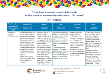 Tygodniowe propozycje sytuacji edukacyjnych według programu wychowania przedszkolnego „Dar zabawy” Luty – TYDZIEŃ 1. Temat tygodnia: przyjaciele – z nimi radości wiele Poniedziałek: Wtorek: Środa: Czwartek: Piątek: warto mieć przyjaciela przyjaciel na medal prezent dla przyjaciela przyjaciel wie dekalog przyjaźni „Wierny przyjaciel” – zabawa ruchowa. Pytania do dzieci po zabawie: Jak czuliście się, pomagając koledze? Jak czuliście się, kiedy otrzymaliście pomoc? Zabawa matematyczna: tworzenie kolorowego medalu na tekturowym kole z wykorzystaniem darów (podział na grupy wedle możliwości). Przeliczanie według: kolorów, figur; porównywanie ilości poszczególnych darów. Porównywanie między grupami. Zabawa ruchowa do piosenki pt. „Przyjaciel wie” – dobieranie się w pary i taniec na gazetach. Wykonanie medalu dla przyjaciela: wycięcie i dekoracja tekturowego koła. „Przedmuchiwanie piłeczki” – ćwiczenia oddechowe: dmuchanie piłeczki pingpongowej w taki sposób, aby przeturlała się przez stolik (współpraca w parach). Nauka pamięciowa refrenu piosenki pt. „Przyjaciel wie”. Słuchanie i naśladowanie rytmu piosenki. Tworzenie akompaniamentu muzycznego do refrenu z dostępnych instrumentów. Powtórzenie wiadomości o instrumentach wykorzystanych do zabawy (nazwa, rodzaj). „Powitanie z przyjacielem” – zabawa ruchowa. Dzieci w parach ustalają sposób przywitania (podanie ręki, uścisk, obrót, tzw. żółwik itp.). Prezentacja na forum grupy swojego przyjacielskiego przywitania. Wspólne tworzenie Dekalogu Przyjaźni. Zapis na tablicy (za pomocą puzzli ułożonych w grupie badawczej). Ćwiczenia gimnastyczne z wykorzystaniem piłeczek z daru 1, chusty Propozycje Słuchanie wiersza A. Frąspotkań czek pt. „Mój przyjaciel”. w Porannym kole Wypowiadanie się całym zdaniem na temat wysłuchanego opowiadania. Omówienie cech przyjaciela na przykładzie postaci ułożonych z darów, a które występują w wierszu: policjant, strażak, pirat, kowboj. Wyjaśnienie dzieciom znaczenia przyjaźni. Dokonywanie syntezy i analizy sylabowej wyrazów zaczerpniętych z wiersza. Froebel.pl Sp. z o.o. Al. Racławickie 7, 20-059 Lublin tel./faks +48 81 533 57 81 e-mail: [email protected], www.froebel.pl /froebelpl 1 animacyjnej i przyborów gimnastycznych (skakanka, woreczki, tunel): marsz w rytm piosenki, stanie na jednej nodze, skręt tułowia: raz w lewo, raz w prawo, skłon w przód, rzut do celu, marsz na palcach, marsz na piętach, w siadzie: chwyt chusty palcami stóp i zwijanie (bez odrywania pięt od podłoża). Ćwiczenie celności rzutu i łapania. Wyścigi drużynowe. Praca w grupach zabawowo-zadaniowych Grupa darów: Układanie prezentu dla przyjaciela z wykorzystaniem poznanych darów. Można też budować zawartość prezentów. Grupa twórcza: Uzupełnianie brakujących elementów w portrecie przyjaciela (włosy, oczy, nos, usta). Technika dowolna: plastelina/ farby/ klej/ bibuła. Grupa badawcza: Układanie puzzli (pocięte obrazki przedstawiające Dekalog Przyjaźni). Grupa gospodarcza: Przygotowanie poczęstunku dla przyjaciela (podanie całej grupie galaretki o smaku truskawkowym w kształcie serca, wyciętej foremkami do pierniczków). Froebel.pl Sp. z o.o. Al. Racławickie 7, 20-059 Lublin tel./faks +48 81 533 57 81 e-mail: [email protected], www.froebel.pl /froebelpl 2 Aktywności na dworze Spacer po okolicy (pomoc przyjacielska w ubieraniu się) – podziwianie przyrody w zimowej aurze oraz ustalenie aktualnej pogody. „Człowiek przyjacielem Zabawy ruchowe: ptaków” – szukanie „Rolnik sam w dolinie”, karmników dla ptaków „Pomidor”, „Zamki”. (i uzupełnienie pożywienia). Rysowanie kredą na asfalcie wizerunku twarzy przyjaciela. Zawody w grupach: celność rzutów, wyścigi. Inne aktywności i zabawy z darami Układanie postaci występujących w wierszu: strażak, policjant, pirat, kowboj. Zabawa w parach „Co Układanie z darów min: jest w worku” – odgady- uśmiechnięta, smutna, wanie kształtów. przestraszona, zła, neutralna, zdziwiona. Układanie z darów wybranych instrumentów muzycznych. Zabawy dowolne z darami w mniejszych grupach. Podstawa programowa 3.1–3.3, 5.3, 5.4, 9.1, 10.1, 11.1, 14.3–14.7, 15.2 2.5, 4.1, 4.2, 5.3, 12.1– 12.3 8.1–8.3, 10.1 1.1-2, 3.1, 3.4, 5.3, 10.1, 14.7, 1.2–1.4, 3.4, 5.3, 5.4, 9.1, 10.1, 14.3 oprac. mgr. Barbara Zwolak, nauczyciel Niepubliczne Przedszkole Leonardo w Poznaniu Froebel.pl Sp. z o.o. Al. Racławickie 7, 20-059 Lublin tel./faks +48 81 533 57 81 e-mail: [email protected], www.froebel.pl /froebelpl 3 Luty – TYDZIEŃ 2. Temat tygodnia: Poniedziałek: Wtorek: Środa: Czwartek: Piątek: uczucia znamy, o nich rozmawiamy uczucia znamy złość strach smutek radość Krótki tekst wprowadzający w tematykę dnia, ilustrowany za pomocą darów. Swobodne wypowiedzi dzieci. Zabawa ruchowa z balonem. „Zabawa ze złością” – ćwiczenie orientacji na kartce papieru. Zabawa kulkami złości z elementami mierzenia stopami. Krótki tekst wprowadzający w tematykę dnia, ilustrowany za pomocą darów. Swobodne wypowiedzi dzieci. Wykonanie pracy plastycznej pt. „Duszek straszek”. Budowanie zamku strachów z podziałem na grupy (według materiału budowniczego). „Raz, dwa, trzy, Baba Jaga patrzy” – zabawa ruchowa. Krótki tekst wprowadzający w tematykę dnia, ilustrowany za pomocą darów. Swobodne wypowiedzi dzieci. Zabawa słuchowo-ruchowa uwrażliwiająca na muzykę wesołą i smutną. Ilustrowanie muzyki z wykorzystaniem instrumentów perkusyjnych (marakasy, trójkąty, tarki, tamburyna, klawesy). Krótki tekst wprowadzający w tematykę dnia, ilustrowany za pomocą darów. Swobodne wypowiedzi dzieci. Zabawa ruchowa przy piosence pt. „Dwóm tańczyć się zachciało”. „Wesołe roboty” – zabawa ruchowa z elementami równowagi. „Zepsute roboty” – zabawa ruchowa z elementami podskoków. „Przekazuję radosną pił