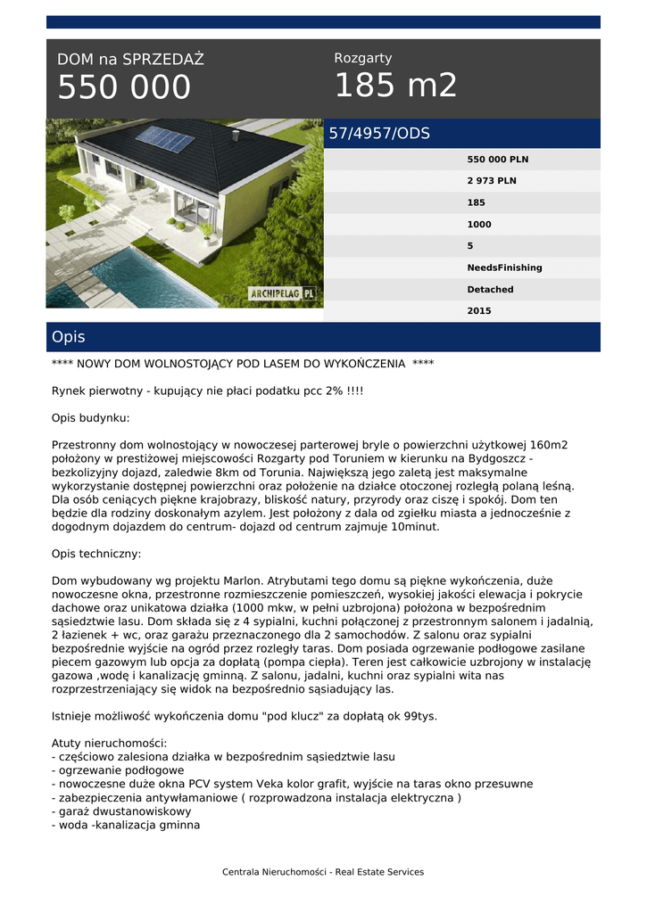 DOM na SPRZEDAŻ 550 000 Rozgarty 185 m2 57/4957/ODS 550 000 PLN 2 973 PLN 185 1000 5 NeedsFinishing Detached 2015 Opis **** NOWY DOM WOLNOSTOJĄCY POD LASEM DO WYKOŃCZENIA **** Rynek pierwotny - kupujący nie płaci podatku pcc 2% !!!! Opis budynku: Przestronny dom wolnostojący w nowoczesej parterowej bryle o powierzchni użytkowej 160m2 położony w prestiżowej miejscowości Rozgarty pod Toruniem w kierunku na Bydgoszcz bezkolizyjny dojazd, zaledwie 8km od Torunia. Największą jego zaletą jest maksymalne wykorzystanie dostępnej powierzchni oraz położenie na działce otoczonej rozległą polaną leśną. Dla osób ceniących piękne krajobrazy, bliskość natury, przyrody oraz ciszę i spokój. Dom ten będzie dla rodziny doskonałym azylem. Jest położony z dala od zgiełku miasta a jednocześnie z dogodnym dojazdem do centrum- dojazd od centrum zajmuje 10minut. Opis techniczny: Dom wybudowany wg projektu Marlon. Atrybutami tego domu są piękne wykończenia, duże nowoczesne okna, przestronne rozmieszczenie pomieszczeń, wysokiej jakości elewacja i pokrycie dachowe oraz unikatowa działka (1000 mkw, w pełni uzbrojona) położona w bezpośrednim sąsiedztwie lasu. Dom składa się z 4 sypialni, kuchni połączonej z przestronnym salonem i jadalnią, 2 łazienek + wc, oraz garażu przeznaczonego dla 2 samochodów. Z salonu oraz sypialni bezpośrednie wyjście na ogród przez rozległy taras. Dom posiada ogrzewanie podłogowe zasilane piecem gazowym lub opcja za dopłatą (pompa ciepła). Teren jest całkowicie uzbrojony w instalację gazowa ,wodę i kanalizację gminną. Z salonu, jadalni, kuchni oraz sypialni wita nas rozprzestrzeniający się widok na bezpośrednio sąsiadujący las. Istnieje możliwość wykończenia domu "pod klucz" za dopłatą ok 99tys. Atuty nieruchomości: - częściowo zalesiona działka w bezpośrednim sąsiedztwie lasu - ogrzewanie podłogowe - nowoczesne duże okna PCV system Veka kolor grafit, wyjście na taras okno przesuwne - zabezpieczenia antywłamaniowe ( rozprowadzona instalacja elektryczna ) - garaż dwustanowiskowy - woda -kanalizacja gminna Centrala Nieruchomości - Real Estate Services - instalacja gazowa Opis lokalizacji: Komunikacja: linie PKS, autobus, gimbus Odległość od centrum-starówki: około 10 km, w pobliżu szkoła, przedszkole, boisko - orlik. Tereny rekreacyjne: rzeczka w pobliżu, las, liczne ścieżki rowerowe, tereny spacerowe. Punkty usługowe w pobliżu: pasaż handlowy, apteka, sklep spożywczy, fryzjer/salon kosmetyczny, restauracja, szkoła, stomatolog, weterynarz etc. Zapraszamy do prezentacji!! ***************** KAROLINA RUTKOWSKA TEL 663 899 715 ***************************** Centrala Nieruchomości: ZAPEWNIAMY BEZPŁATNE I PROFESJONALNE DORADZTWO ZARÓWNO W ZAKRESIE NIERUCHOMOŚCI JAK I POZYSKIWANIU POD NIE KREDYTÓW HIPOTECZNYCH Powyższe informacje zostały sporządzone na podstawie oświadczeń właścicieli i nie są ofertą w rozumieniu przepisów Kodeksu Cywilnego. Mają one jedynie charakter informacyjny. Większość naszych klientów pochodzi z polecenia - ZAUFAJ NAM I TY I NIE CZEKAJ, AŻ KTOŚ CIĘ WYPRZEDZI! Zadzwoń i umów się na prezentację ! Nr licencji pośrednika odpowiedzialnego za wykonanie umowy pośrednictwa 14260. zobacz inne nasze oferty na www.centralanieruchomosci.pl facebook.com/Centrala.N Karolina Rutkowska tel. (+48) 663 899 715 email: [email protected] Centrala Nieruchomości - Real Estate Services Powered by TCPDF (www.tcpdf.org)