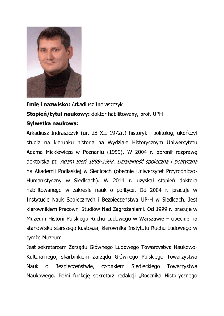 Imię i nazwisko: Arkadiusz Indraszczyk Stopień/tytuł naukowy: doktor habilitowany, prof. UPH Sylwetka naukowa: Arkadiusz Indraszczyk (ur. 28 XII 1972r.) historyk i politolog, ukończył studia na kierunku historia na Wydziale Historycznym Uniwersytetu Adama Mickiewicza w Poznaniu (1999). W 2004 r. obronił rozprawę doktorską pt. Adam Bień 1899-1998. Działalność społeczna i polityczna na Akademii Podlaskiej w Siedlcach (obecnie Uniwersytet PrzyrodniczoHumanistyczny w Siedlcach). W 2014 r. uzyskał stopień doktora habilitowanego w zakresie nauk o polityce. Od 2004 r. pracuje w Instytucie Nauk Społecznych i Bezpieczeństwa UP-H w Siedlcach. Jest kierownikiem Pracowni Studiów Nad Zagrożeniami. Od 1999 r. pracuje w Muzeum Historii Polskiego Ruchu Ludowego w Warszawie – obecnie na stanowisku starszego kustosza, kierownika Instytutu Ruchu Ludowego w tymże Muzeum. Jest sekretarzem Zarządu Głównego Ludowego Towarzystwa NaukowoKulturalnego, skarbnikiem Zarządu Głównego Polskiego Towarzystwa Nauk o Bezpieczeństwie, członkiem Siedleckiego Towarzystwa Naukowego. Pełni funkcję sekretarz redakcji „Rocznika Historycznego Muzeum Historii Polskiego Ruchu Ludowego” i redaktora naczelnego „Myśli Ludowej”. Zainteresowania naukowe:  ruchy i partie chłopskie i ludowe w Polsce i na świecie,  społeczeństwo obywatelskie i demokracja partycypacyjna,  historia i przyszłość integracji europejskiej,  bezpieczeństwo jednostki i społeczności we współczesnym świecie. Tematyka seminarium doktorskiego:  integracja europejska jako metoda tworzenia bezpieczeństwa państwa i bezpieczeństwa zbiorowego  wpływ ruchów społecznych na poczucie/uzyskiwanie bezpieczeństwa jednostkowego i społecznego  teoria i praktyka bezpieczeństwa zbiorowego  problematyka bezpieczeństwa w myśli politycznej Najważniejsze publikacje: 1. Adam Bień 1899-1998. Działalność społeczna i polityczna, Warszawa 2005, ss. 403. 2. Zielona Międzynarodówka. Współpraca partii chłopskich z państw Europy Środkowej i Wschodniej, Warszawa 2008, ss. 200. 3. Polski ruch ludowy wobec integracji europejskiej, Warszawa 2014, ss. 452. 4. Problem bezpieczeństwa państwowego i międzynarodowego w programach polskich partii politycznych, „Doctrina. Studia Społeczno-Polityczne” nr 5/2008, s. 31-48. 5. Konsolidacja polityczna Unii Europejskiej a myśl integracyjna polskiego ruchu ludowego, „Myśl Ludowa” nr 1, 2009, s. 7-28. 6. Zagrożenie bezpieczeństwa człowieka w dobie globalizacji w myśli politycznej Polskiego Stronnictwa Ludowego, [w:] Bezpieczeństwo człowieka a transdyscyplinowość, T. I, pod red. Edwarda Jarmocha, Andrzeja W. Świderskiego, Aldony Trzpil, Siedlce-Drohiczyn 2009, s. 203-219. 7. La Via Campesina – współczesna międzynarodówka chłopska, jako reakcja na zagrożenia niesione przez procesy globalizacyjne, „Myśl Ludowa” nr 2, s. 21-36. 8. Partie chłopskie w wybranych państwach Europy Środkowej i Wschodniej (Chorwacja, Czechy, Łotwa, Rumunia, Słowacja, Węgry), w: Partie chłopskie i ludowe w Polsce oraz Europie Środkowo-Wschodniej (1989-2009), pod red. Janusza Gmitruka, Arkadiusza Indraszczyka, Stanisława Stępki, Warszawa 2010, s. 265-297. 9. Polscy ludowcy w strukturach emigracji politycznej z Europy Środkowej i Wschodniej, w: Represje wobec wsi i ruchu ludowego, t. 4, Między apologią a negacją, pod red. nauk. Janusza Gmitruka, Ewy Leniart, Warszawa 2010, s. 217-238. 10. Instytucjonalne reprezentacje chłopów we współczesnej Europie, [w:] Wieś i ruch ludowy w Polsce i Europie, t. 2, Idee, organizacje, środowisko, red. nauk. Franciszek Kampka, Warszawa 2012, s. 185-202. 11. Prasa ruchu ludowego na emigracji w latach 1945-1989. Próba katalogu, „Rocznik Historii Prasy Polskiej” T. XVI (2013), z 1 (31), s. 159-190. 12. The Cooperation of Peasant Parties from Central and Eastern Europe in Exile after 1945, [w:] East Central Europe in Exile, Vol. 2: Transatlantic Identities, ed. Anna Mazurkiewicz, Cambridge Scholars Publishing 2013, s. 193-226. 13. Współczesne ruchy chłopskie. Charakterystyka na przykładzie wybranych ruchów, [w:] Oblicza ruchów chłopskich i agrarnych, pod red. Arkadiusza Indraszczyka, Adama Wielomskiego, Warszawa 2013, s. 169-186. 14. Central European Federalists – Federaliści Środkowej Europy wobec integracji europejskiej, „Doctrina. Studia społecznopolityczne” 2013, nr 10. 15. Zagrożenia jednostki i społeczeństw we współczesnym świecie w myśli ruchów i organizacji chłopskich – na przykładzie La Via Campesina, [w:] Współczesne bezpieczeństwo jednostkowe, red. naukowa: Mariusz Kubiak, Paweł Żarkowski, WarszawaSiedlce 2013, s. 121-139. 16. Gotowość Polaków do udziału w demokracji bezpośredniej. Doświadczenia wyborów i referendów, [w:] Współczesna demokracja bezpośrednia. Dialog polsko-szwajcarski, red. B. Wiśniewska-Paź, Wydawnictwo Aureus, Kraków 2013, s. 237259.