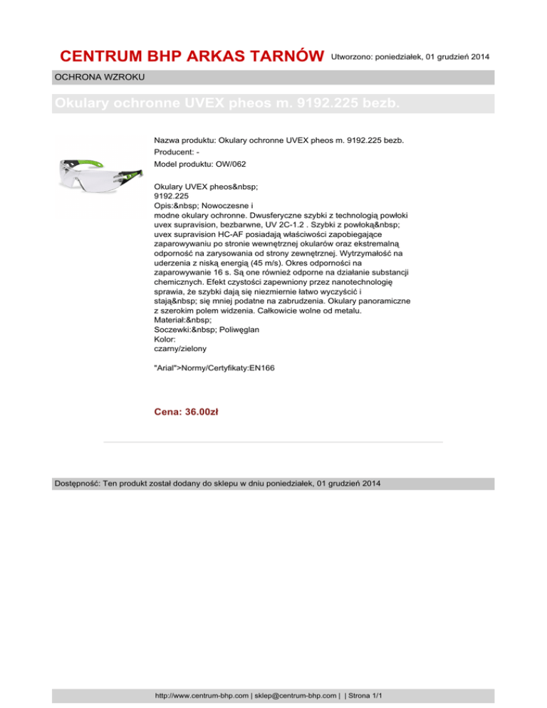 CENTRUM BHP ARKAS TARNÓW Utworzono: poniedziałek, 01 grudzień 2014 OCHRONA WZROKU Okulary ochronne UVEX pheos m. 9192.225 bezb. Nazwa produktu: Okulary ochronne UVEX pheos m. 9192.225 bezb. Producent: Model produktu: OW/062 Okulary UVEX pheos 9192.225 Opis: Nowoczesne i modne okulary ochronne. Dwusferyczne szybki z technologią powłoki uvex supravision, bezbarwne, UV 2C-1.2 . Szybki z powłoką uvex supravision HC-AF posiadają właściwości zapobiegające zaparowywaniu po stronie wewnętrznej okularów oraz ekstremalną odporność na zarysowania od strony zewnętrznej. Wytrzymałość na uderzenia z niską energią (45 m/s). Okres odporności na zaparowywanie 16 s. Są one również odporne na działanie substancji chemicznych. Efekt czystości zapewniony przez nanotechnologię sprawia, że szybki dają się niezmiernie łatwo wyczyścić i stają się mniej podatne na zabrudzenia. Okulary panoramiczne z szerokim polem widzenia. Całkowicie wolne od metalu. Materiał: Soczewki: Poliwęglan Kolor: czarny/zielony "Arial">Normy/Certyfikaty:EN166 Cena: 36.00zł Dostępność: Ten produkt został dodany do sklepu w dniu poniedziałek, 01 grudzień 2014 http://www.centrum-bhp.com | [email protected] | | Strona 1/1