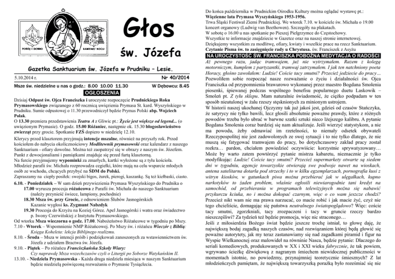 Głos św. Józefa Gazetka Sanktuarium św. Józefa w Prudniku – Lesie. 5.10.2014 r. Nr 40/2014 Msze św. niedzielne u nas o godz.: 8.00 10.00 11.30 W Dębowcu: 8.45 OGŁOSZENIA Dzisiaj Odpust św. Ojca Franciszka i uroczyste rozpoczęcie Prudnickiego Roku Prymasowskiego związanego z 60 rocznicą uwięzienia Prymasa St. kard. Wyszyńskiego w Prudniku. Sumie odpustowej o 11.30 przewodniczył będzie Prymas Polski abp. Wojciech Polak. O 13.30 premiera przedstawienia Teatru A z Gliwic pt.: Życie jest większe od legend... (o uwięzionym Prymasie). O godz. 15.00 Różaniec, następnie ok. 15.30 błogosławieństwo zwierząt przy grocie. Spotkanie FZŚ dopiero w niedzielę 12.10. Klerycy przed klasztorem przyjmują intencje mszalne, również na przyszły rok. Przed kościołem do nabycia okolicznościowy Modlitewnik prymasowski oraz kalendarz z naszego Sanktuarium - ofiary dowolne. Można też zaopatrzyć się w obrazy z naszym św. Józefem. Punkt z dewocjonaliami i pamiątkami znajduje się przed furtą klasztorną. Na furcie przyjmujemy wypominki za zmarłych, kartki wyłożone są z tyłu kościoła. Młodzież parafii św. Michała rozprowadza cegiełki, które mają na celu wsparcie młodych osób ze wschodu, chcących przybyć na ŚDM do Polski. Zapraszamy na ciepły posiłek: swojski bigos, żurek, pierogi, kaszankę. Są też kiełbaski, ciasto. 6.10. - Poniedziałek – W sam dzień przywiezienia Prymasa Wyszyńskiego do Prudnika o 17.00 wyrusza procesja różańcowa z Parafii św. Michała do naszego Sanktuarium (należy przynieść świece, lampiony, pochodnie) 18.30 Msza św. przy Grocie, z odnowieniem Ślubów Jasnogórskich Kazanie wygłosi ks. Zygmunt Nabzdyk 19.30 Procesja do Krzyżu na Koziej Górce. Apel Jasnogórski i watra oraz świadectwo p. Iwony Czerwińskiej z Instytutu Prymasowskiego. Od wtorku Msza wieczorna o godz. 17.00. Nabożeństwo Różańcowe w tygodniu po Mszy. 7.10 - Wtorek – Wspomnienie NMP Różańcowej. Po Mszy św. i różańcu Wieczór z Biblią: Księga Koheleta: lekcja Biblijnego realizmu. 8.10. - Środa – Msza w intencji próśb i podziękowań zanoszonych za wstawiennictwem św. Józefa z udziałem Bractwa św. Józefa. 9.10. - Piątek – Po różańcu Franciszkańska Szkoły Wiary: Czy naprawdę Msza wszechczasów czyli o Liturgii po Soborze Watykańskim II. 13.10. - Niedziela Prymasowska - Każda druga niedziela miesiąca w naszym Sanktuarium będzie niedzielą poświęconą rozważaniu o Prymasie Tysiąclecia. Do końca października w Prudnickim Ośrodku Kultury można oglądać wystawę pt.: Więzienne lata Prymasa Wyszyńskiego 1953-1956. Trwa Śląski Festiwal Ziemi Prudnickiej. We wtorek 7.10. w kościele św. Michała o 19.00 koncert organowy (Ludwig van Beethowen). Szczegóły na plakatach. W sobotę o 16.00 u nas spotkanie po Pieszej Pielgrzymce do Częstochowy. Wszystkie te informacje znajdziecie w Gazetce oraz na naszej stronie internetowej. Dziękujemy wszystkim za modlitwę, ofiary, kwiaty i wszelkie prace na rzecz Sanktuarium. Czytanie Pisma św. to zasięgnięcie rady u Chrystusa. św. Franciszek z Asyżu NA UROCZYSTOŚĆ ŚW. FRANCISZKA POBOŻNA MEDYTACJA O RADOŚCI Aż pewnego razu, jadąc tramwajem, już nie wytrzymałem. Razem z kolegą motorniczym, kumplem z partyzantki, tramwaj zatrzymałem. I jak ten natchniony poeta Horacy, głośno zawołałem: Ludzie! Coście tacy smutni? Przecież jedziecie do pracy… Pozwoliłem sobie rozpocząć nasze rozważanie o życiu i działalności św. Ojca Franciszka od przypomnienia brawurowo wykonanej przez maestro Bogdana Smolenia piosenki, śpiewanej podczas wspólnego benefisu popularnego duetu Laskowik – Smoleń pt. Z tyłu sklepu. Mam naturalnie świadomość, że ciężko podpadam w ten sposób nieutulonej w żalu rzeszy stęsknionych za minionym ustrojem. W historii naszej ukochanej Ojczyzny tak już jakoś jest, gdzieś od czasów Stańczyka, że satyrycy nie tylko bawili, lecz głosili absolutnie poważne prawdy, które z różnych powodów trzeba było ubrać w barwne szatki sztuki nieco lżejszego kalibru. A pytanie Bogdana Smolenia coraz bardziej się nam aktualizuje. Jeśli wierzyć statystykom, a nie ma powodu, żeby odmawiać im rzetelności, to niemały odsetek obywateli Rzeczypospolitej nie jest zadowolonych ze swej sytuacji i to nie tylko dlatego, że nie muszą się fatygować tramwajem do pracy, bo dotychczasowy zakład pracy został rozkra… pardon, chciałem powiedzieć oczywiście: korzystnie sprywatyzowany… Może by warto zatem powtórzyć pytanie mistrza kabaretu, nieznacznie je tylko modyfikując: Ludzie! Coście tacy smutni? Przecież supermarkety otwarte są siedem dni w tygodniu, agencje towarzyskie otwierają swe podwoje nawet na wioskach, antena satelitarna dotarła pod strzechy i to w kilku egzemplarzach, pornografia kusi z witryn kiosków, w gatunkach piwa można przebierać jak w ulęgałkach, kupno narkotyków to żaden problem, właśnie ogłosili niewiarogodnie tani kredyt na samochód, od przebierania w programach telewizyjnych można się nabawić przykurczu kciuka, no i można dokopać czarnym, więc o co wam jeszcze chodzi? Przecież nikt wam nie ma prawa narzucać, co macie robić i jak macie żyć, czyż nie tego chcieliście, domagając się państwa neutralnego światopoglądowo? Więc: coście tacy smutni, zgorzkniali, tacy zrozpaczeni i tacy w gruncie rzeczy bardzo nieszczęśliwi? Za tydzień też będzie promocja, więc nic straconego… Jeśli z miłosierdzia Bożego świat będzie jeszcze trochę istniał, to głowę daję, że największą bodaj zagadką naszych czasów, nad rozwiązaniem której będą głowić się poważne autorytety, jak my teraz zastanawiamy się nad zagadkami piramid i figur na Wyspie Wielkanocnej oraz malowideł na równinie Nasca, będzie pytanie: Dlaczego do seriali komediowych, produkowanych w XX i XXI wieku fabrycznie, że tak powiem, wgrywano ścieżkę dźwiękową z nagranym śmiechem niewidocz