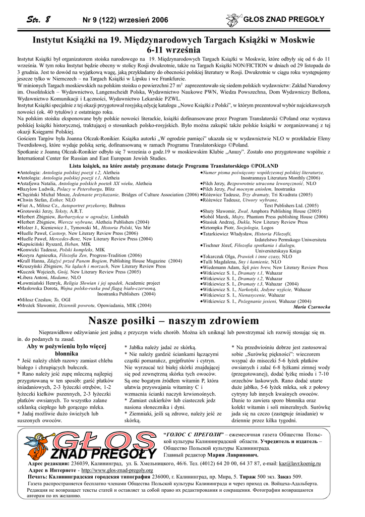 Str. 8 Nr 9 (122) wrzesień 2006 GŁOS ZNAD PREGOŁY Instytut Książki na 19. Międzynarodowych Targach Książki w Moskwie 6-11 września Instytut Książki był organizatorem stoiska narodowego na 19. Międzynarodowych Targach Książki w Moskwie, które odbyły się od 6 do 11 września. W tym roku Instytut będzie obecny w stolicy Rosji dwukrotnie, także na Targach Książki NON/FICTION w dniach od 29 listopada do 3 grudnia. Jest to dowód na wyjątkową wagę, jaką przykładamy do obecności polskiej literatury w Rosji. Dwukrotnie w ciągu roku występujemy jeszcze tylko w Niemczech – na Targach Książki w Lipsku i we Frankfurcie. W minionych Targach moskiewskich na polskim stoisku o powierzchni 27 m2 zaprezentowało się siedem polskich wydawnictw: Zakład Narodowy im. Ossolińskich – Wydawnictwo, Langenscheidt Polska, Wydawnictwo Naukowe PWN, Wiedza Powszechna, Dom Wydawniczy Bellona, Wydawnictwo Komunikacji i Łączności, Wydawnictwo Lekarskie PZWL. Instytut Książki specjalnie z tej okazji przygotował rosyjską edycję katalogu „Nowe Książki z Polski”, w którym prezentował wybór najciekawszych nowości (ok. 40 tytułów) z ostatniego roku. Na polskim stoisku eksponowane były polskie nowości literackie, książki dofinansowane przez Program Translatorski ©Poland oraz wystawa polskiej książki historycznej, traktującej o stosunkach polsko-rosyjskich. Było można zakupić także polskie książki w zorganizowanej z tej okazji Księgarni Polskiej. Gościem Targów była Joanna Olczak-Ronikier. Książka autorki „W ogrodzie pamięci” ukazała się w wydawnictwie NLO w przekładzie Eleny Twerdisłowej, które wydaje polską serię, dofinansowaną w ramach Programu Translatorskiego ©Poland. Spotkanie z Joanną Olczak-Ronikier odbyło się 7 września o godz.19 w moskiewskim Klubie „Aпшу”. Zostało ono przygotowane wspólnie z International Center for Russian and East European Jewish Studies. Lista książek, na które zostały przyznane dotacje Programu Translatorskiego ©POLAND ·Antologia: Antologia polskiej poezji t.2, Aletheia ·Numer pisma poświęcony współczesnej polskiej literaturze, ·Antologia: Antologia polskiej poezji t.1, Aletheia Inostrannaya Literatura Monthly (2006) ·Astafjewa Natalia, Antologia polskich poetek XX wieku, Aletheia ·Pilch Jerzy, Bezpowrotnie utracona leworęczność, NLO ·Bazylow Ludwik, Polacy w Petersburgu, Blitz ·Pilch Jerzy, Pod mocnym aniołem, Inostranka ·Chęciński Michał Mosze, Jedenaste przykazanie, Bridges of Culture Association (2006) ·Różewicz Tadeusz, Trzy dramaty, Tri Kvadrata (2005) ·Chwin Stefan, Esther, NLO ·Różewicz Tadeusz, Utwory wybrane, ·Fiut A., Miłosz Cz., Autoportret przekorny, Baltruss Text Publishers Ltd. (2005) ·Grotowski Jerzy, Teksty, A.R.T. ·Shuty Sławomir, Zwał, Amphora Publishing House (2005) ·Herbert Zbigniew, Barbarzyńca w ogrodzie, Limbakh ·Soból Marek, Mojry, Phantom Press publishing House (2006) ·Herbert Zbigniew, Wiersze wybrane, Aletheia Publishers (2004) ·Stasiuk Andrzej, Dukla, New Literary Review Press ·Holzer J., Kieniewicz J., Tymowski M., Historia Polski, Ves Mir ·Sztompka Piotr, Socjologia, Logos ·Huelle Paweł, Castorp, New Literary Review Press (2006) ·Tatarkiewicz Władysław, Historia Filozofii, ·Huelle Paweł, Mercedes-Benz, New Literary Review Press (2004) Izdatelstwo Permskogo Uniwersiteta ·Kapuściński Ryszard, Heban, MIK ·Tischner Józef, Filozofia spotkania i dialogu, ·Konwicki Tadeusz, Polski kompleks, MIK Universitetskaya Kniga ·Kozyra Agnieszka, Filozofia Zen, Progress-Tradition (2006) ·Tokarczuk Olga, Prawiek i inne czasy, NLO ·Krall Hanna, Zdążyć przed Panem Bogiem, Publishing House Magazine (2004) ·Tulli Magdalena, Sny i kamienie, NLO ·Kruszyński Zbigniew, Na lądach i morzach, New Literary Review Press ·Wiedemann Adam, Sęk pies brew, New Literary Review Press ·Kuczok Wojciech, Gnój, New Literary Review Press (2005) ·Witkiewicz S. I., Dramaty t.1, Wahazar ·Libera Antoni, Madame, NLO ·Witkiewicz S. I., Dramaty t.2, Wahazar ·Łowmiański Henryk, Religia Słowian i jej upadek, Academic project ·Witkiewicz S. I., Dramaty t.3, Wahazar (2004) ·Masłowska Dorota, Wojna polsko-ruska pod flagą biało-czerwoną, ·Witkiewicz S. I., Narkotyki, Jedyne wyjście, Wahazar Inostranka Publishers (2004) ·Witkiewicz S. I., Nienasycenie, Wahazar ·Miłosz Czesław, To, OGI ·Witkiewicz S. I., Pożegnanie jesieni, Wahazar (2004) ·Mrożek Sławomir, Dziennik powrotu, Opowiadania, MIK (2004) Maria Czarnocka Nasze posiłki – naszym zdrowiem Nieprawidłowe odżywianie jest jedną z przyczyn wielu chorób. Można ich uniknąć lub powstrzymać ich rozwój stosując się m. in. do podanych tu zasad. Aby w pożywieniu było więcej błonnika * Jeść należy chleb razowy zamiast chleba białego i chrupiących bułeczek. * Rano należy jeść zupę mleczną najlepiej przygotowaną w ten sposób: garść płatków śniadaniowych, 2-3 łyżeczki otrębów, 1-2 łyżeczki kiełków pszennych, 2-3 łyżeczki płatków owsianych. To wszystko zalane szklanką ciepłego lub gorącego mleka. * Jadaj możliwie dużo świeżych lub suszonych owoców. * Jabłka należy jadać ze skórką. * Nie należy gardzić ściankami łączącymi cząstki pomarańcz, grejpfrutów i cytryn. Nie wyrzucać też białej skórki znajdującej się pod zewnętrzną skórka tych owoców. Są one bogatym źródłem witamin P, która ułatwia przyswajania witaminy C i wzmacnia ścianki naczyń krwionośnych. * Zamiast cukierków lub ciasteczek jedz nasiona słonecznika i dyni. * Ziemniaki, jeśli są zdrowe, należy jeść ze skórką. * Na przedwiośniu dobrze jest zastosować sobie „Surówkę piękności”: wieczorem wsypać do miseczki 5-6 łyżek płatków owsianych i zalać 6-8 łyżkami zimnej wody (przegotowanej), dodać łyżkę miodu i 7-10 orzechów laskowych. Rano dodać utarte duże jabłko, 5-6 łyżek mleka, sok z połowy cytryny lub innych