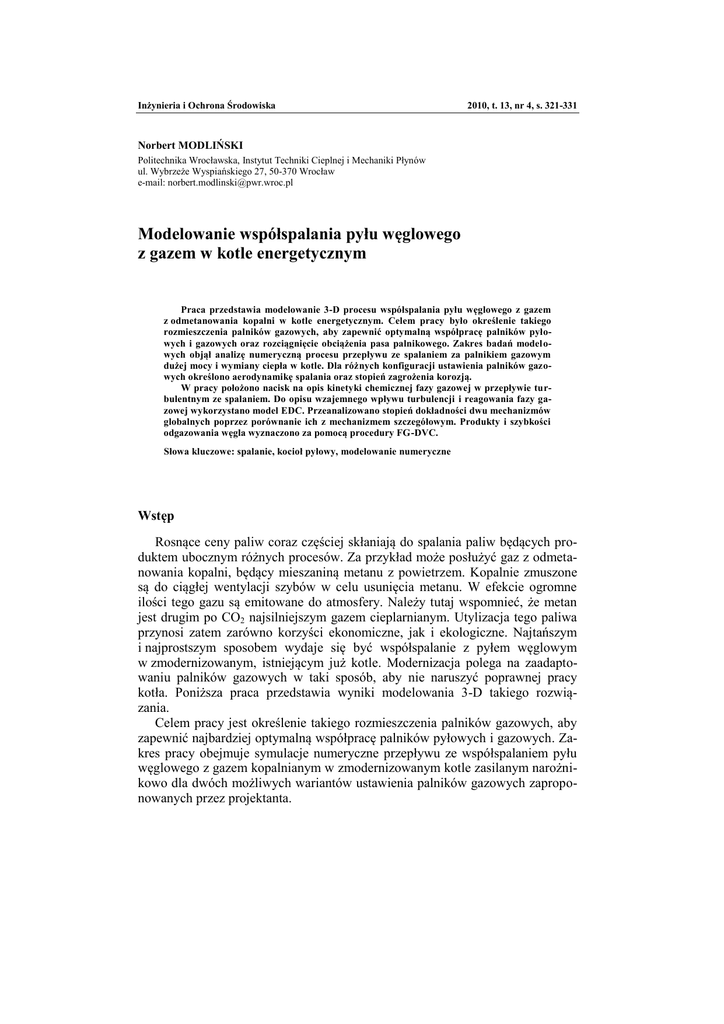 Inżynieria i Ochrona Środowiska 2010, t. 13, nr 4, s. 321-331 Norbert MODLIŃSKI Politechnika Wrocławska, Instytut Techniki Cieplnej i Mechaniki Płynów ul. Wybrzeże Wyspiańskiego 27, 50-370 Wrocław e-mail: [email protected] Modelowanie współspalania pyłu węglowego z gazem w kotle energetycznym Praca przedstawia modelowanie 3-D procesu współspalania pyłu węglowego z gazem z odmetanowania kopalni w kotle energetycznym. Celem pracy było określenie takiego rozmieszczenia palników gazowych, aby zapewnić optymalną współpracę palników pyłowych i gazowych oraz rozciągnięcie obciążenia pasa palnikowego. Zakres badań modelowych objął analizę numeryczną procesu przepływu ze spalaniem za palnikiem gazowym dużej mocy i wymiany ciepła w kotle. Dla różnych konfiguracji ustawienia palników gazowych określono aerodynamikę spalania oraz stopień zagrożenia korozją. W pracy położono nacisk na opis kinetyki chemicznej fazy gazowej w przepływie turbulentnym ze spalaniem. Do opisu wzajemnego wpływu turbulencji i reagowania fazy gazowej wykorzystano model EDC. Przeanalizowano stopień dokładności dwu mechanizmów globalnych poprzez porównanie ich z mechanizmem szczegółowym. Produkty i szybkości odgazowania węgla wyznaczono za pomocą procedury FG-DVC. Słowa kluczowe: spalanie, kocioł pyłowy, modelowanie numeryczne Wstęp Rosnące ceny paliw coraz częściej skłaniają do spalania paliw będących produktem ubocznym różnych procesów. Za przykład może posłużyć gaz z odmetanowania kopalni, będący mieszaniną metanu z powietrzem. Kopalnie zmuszone są do ciągłej wentylacji szybów w celu usunięcia metanu. W efekcie ogromne ilości tego gazu są emitowane do atmosfery. Należy tutaj wspomnieć, że metan jest drugim po CO2 najsilniejszym gazem cieplarnianym. Utylizacja tego paliwa przynosi zatem zarówno korzyści ekonomiczne, jak i ekologiczne. Najtańszym i najprostszym sposobem wydaje się być współspalanie z pyłem węglowym w zmodernizowanym, istniejącym już kotle. Modernizacja polega na zaadaptowaniu palników gazowych w taki sposób, aby nie naruszyć poprawnej pracy kotła. Poniższa praca przedstawia wyniki modelowania 3-D takiego rozwiązania. Celem pracy jest określenie takiego rozmieszczenia palników gazowych, aby zapewnić najbardziej optymalną współpracę palników pyłowych i gazowych. Zakres pracy obejmuje symulacje numeryczne przepływu ze współspalaniem pyłu węglowego z gazem kopalnianym w zmodernizowanym kotle zasilanym narożnikowo dla dwóch możliwych wariantów ustawienia palników gazowych zaproponowanych przez projektanta. N. Modliński 322 Nowe sposoby zasilania komór paleniskowych (technologia spalania ograniczająca emisję NOx) spowodowały dezaktualizację dotychczasowych metod obliczania komór paleniskowych. Tę lukę wypełniają częściowo metody trójwymiarowe, dostarczając projektantowi dodatkowych, wcześniej nieosiągalnych informacji. Nieco inaczej przedstawia się sytuacja w przypadku pozostałych powierzchni ogrzewalnych kotła. Obecnie najbardziej wiarygodnymi metodami obliczeń powierzchni grodziowych i pęczków konwekcyjnych są nadal metody zerowymiarowe oparte na doświadczalnych, rozwijanych od lat, formułach na globalne współczynniki przenikania ciepła. Rezultaty obliczeń trójwymiarowych skomplikowanych pęczków zależą silnie od znajomości lokalnych współczynników wymiany i lokalnego stopnia zabrudzenia (zaszlakowania) - wielkości nieznanych na etapie projektowania. Z tych powodów symulacje 3-D kotła ogranicza się najczęściej do obszaru komory paleniskowej. Obliczenia te dostarczają wartości ciepła przejętego w komorze (mocy cieplnej parownika), którą wykorzystuje się w zerowymiarowym, kompleksowym algorytmie obliczeń całego kotła. 1. Zakres obliczeń i parametry pracy kotła Przedmiotem badań jest kocioł tangencjalny opalany pyłem węgla kamiennego. Wysokość kotła wynosi 21 m, zaś szerokość i głębokość 6,2 m. Jest to kocioł dwuciągowy, walczakowy o naturalnej cyrkulacji i wydajności 140 t/h pary o temperaturze 500°C. Kocioł wyposażony jest w 16 palników pyłowych zainstalowanych w czterech rzędach oraz dodatkowe palniki gazowe (rys. 1). W kotle współspalano gaz z odmetanowania kopalni, którego udział w cieple doprowadzonym do paleniska wynosił do 40%. Wersje I i II (rys. 1) rozmieszczenia palników gazowych mają na celu ustalenie wariantu dla najbardziej optymalnej współpracy palników pyłowych i gazowych oraz rozciągnięcie obciążenia pasa palnikowego. Wariant I Wariant II Rurosuszarki Palnik gazowy Palnik pyłowy Rys. 1. Geometria obszaru obliczeń kotła OP140 wraz z dwoma wariantami rozmieszczenia palników gazowych Modelowanie współspalania pyłu węglowego z gazem w kotle energetycznym 323 Obszar obliczeń uwzględnia rejon leja żużlowego, pas palnikowy oraz obszar przegrzewaczy grodziowych. Geometria przegrzewaczy grodziowych została uwzględniona w celu lepszego ukształtowania wypływu. Grodzie zamodelowano jako powierzchnie o zerowej grubości. W obliczeniach przedstawiono wyniki badań dla pracy trzech dolnych rzędów palników pyłowych przy nominalnym obciążeniu kotła. Trójwymiarowa siatka numeryczna została wygenerowana w aplikacji Gambit, preprocesor kodu Fluent [1]. Całkowita liczba objętości kontrolnych wynosi około 150 000. W całej objętości obszaru obliczeniowego wygenerowano siatkę strukturalną z wyjątkiem obszaru palników gazowych ze względu na konieczność odwzorowania szczegółów konstrukcyjnych (rys. 2). Parametry pracy opisanego kotła dla obciążenia nominalnego określono w tabeli 1. Rys. 2. Szczegóły siatki różnicowej w rejonie palnika gazowego Tabela 1 Parametry pracy kotła OP-140 Zużycie paliwa, kg/h 10720 Strumień węgla do jednego palnika, kg/s Strumień gazu, Nm3/h Nadmiar powietrza w komorze paleniskowej λkp Strumień powietrza za młynem wentylator