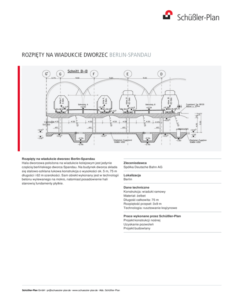 Schüßler-Plan ROZPIĘTY NA WIADUKCIE DWORZEC BERLIN-SPANDAU Rozpięty na wiadukcie dworzec Berlin-Spandau Hala dworcowa położona na wiadukcie kolejowym jest jedynie częścią berlińskiego dworca Spandau. Na budynek dworca składa się stalowo-szklana łukowa konstrukcja o wysokości ok. 5 m, 75 m długości i 62 m szerokości. Sam obiekt wykonany jest w technologii betonu wylewanego na mokro, natomiast posadowienie hali stanowią fundamenty płytkie. Zleceniodawca Spółka Deutsche Bahn AG Lokalizacja Berlin Dane techniczne Konstrukcja: wiadukt ramowy Materiał: żelbet Długość całkowita: 75 m Rozpiętość przęseł: 3x9 m Technologia: rusztowanie krążynowe Prace wykonane przez Schüßler-Plan Projekt konstrukcji nośnej Uzyskanie pozwoleń Projekt budowlany Schüßler-Plan GmbH · [email protected] · www.schuessler-plan.de · Abb.: Schüßler-Plan
