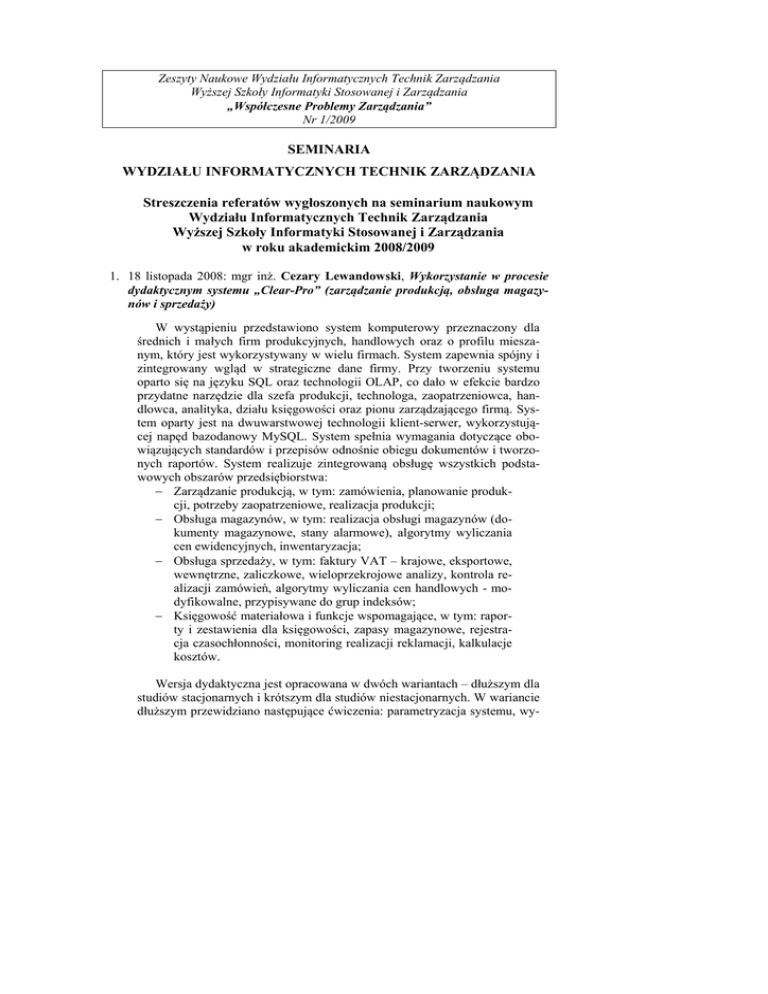 Zeszyty Naukowe Wydziału Informatycznych Technik Zarządzania Wyższej Szkoły Informatyki Stosowanej i Zarządzania „Współczesne Problemy Zarządzania” Nr 1/2009 SEMINARIA WYDZIAŁU INFORMATYCZNYCH TECHNIK ZARZĄDZANIA Streszczenia referatów wygłoszonych na seminarium naukowym Wydziału Informatycznych Technik Zarządzania Wyższej Szkoły Informatyki Stosowanej i Zarządzania w roku akademickim 2008/2009 1. 18 listopada 2008: mgr inż. Cezary Lewandowski, Wykorzystanie w procesie dydaktycznym systemu „Clear-Pro” (zarządzanie produkcją, obsługa magazynów i sprzedaży) W wystąpieniu przedstawiono system komputerowy przeznaczony dla średnich i małych firm produkcyjnych, handlowych oraz o profilu mieszanym, który jest wykorzystywany w wielu firmach. System zapewnia spójny i zintegrowany wgląd w strategiczne dane firmy. Przy tworzeniu systemu oparto się na języku SQL oraz technologii OLAP, co dało w efekcie bardzo przydatne narzędzie dla szefa produkcji, technologa, zaopatrzeniowca, handlowca, analityka, działu księgowości oraz pionu zarządzającego firmą. System oparty jest na dwuwarstwowej technologii klient-serwer, wykorzystującej napęd bazodanowy MySQL. System spełnia wymagania dotyczące obowiązujących standardów i przepisów odnośnie obiegu dokumentów i tworzonych raportów. System realizuje zintegrowaną obsługę wszystkich podstawowych obszarów przedsiębiorstwa: − Zarządzanie produkcją, w tym: zamówienia, planowanie produkcji, potrzeby zaopatrzeniowe, realizacja produkcji; − Obsługa magazynów, w tym: realizacja obsługi magazynów (dokumenty magazynowe, stany alarmowe), algorytmy wyliczania cen ewidencyjnych, inwentaryzacja; − Obsługa sprzedaży, w tym: faktury VAT – krajowe, eksportowe, wewnętrzne, zaliczkowe, wieloprzekrojowe analizy, kontrola realizacji zamówień, algorytmy wyliczania cen handlowych - modyfikowalne, przypisywane do grup indeksów; − Księgowość materiałowa i funkcje wspomagające, w tym: raporty i zestawienia dla księgowości, zapasy magazynowe, rejestracja czasochłonności, monitoring realizacji reklamacji, kalkulacje kosztów. Wersja dydaktyczna jest opracowana w dwóch wariantach – dłuższym dla studiów stacjonarnych i krótszym dla studiów niestacjonarnych. W wariancie dłuższym przewidziano następujące ćwiczenia: parametryzacja systemu, wy- Z życia środowiska naukowego i akademickiego pełnianie i obsługa kartotek, łańcuch zdarzeń produkcyjnych, narzędzia menedżerskie. Wydaje się, że takie ćwiczenia, oparte na wykorzystaniu rzeczywistych narzędzi wspomagających zarządzanie firmą, wzbogacają wiedzę praktyczną studentów i mogą być bardzo użyteczne w ich przyszłej pracy zawodowej. 2. 16 grudnia 2008: dr Jan Gadomski, Wzrost gospodarczy, emisja zanieczyszczeń, konwersja technologiczna Przedmiotem wystąpienia na seminarium były założenia trójsektorowego modelu gospodarki służącego do badania wpływu limitów emisji zanieczyszczeń na zmiany technologii i struktury produkcji w sektorach: produkcji materiałów i surowców, dóbr konsumpcyjnych oraz dóbr inwestycyjnych. (Zbiór tych założeń nie obejmuje efektów handlu pozwoleniami na emisję zanieczyszczeń, jak również pełnego wykorzystania zdolności produkcyjnych w poszczególnych sektorach.) Zaprezentowano procesy przejścia od wzrostu zrównoważonego przy użyciu kapitału o wysokiej emisyjności do wzrostu zrównoważonego wykorzystującego kapitał charakteryzujący się niższą emisyjnością. Pokazana została zależność między strukturą gospodarki a jej długookresową stopą wzrostu oraz odpowiednie, analitycznie wyprowadzone, wzory. Przedstawiając analizę średniookresową zakładającą niewystępowanie postępu technicznego oraz zachowanie równowagi międzysektorowej, tzn. równowagę między popytem i podażą w poszczególnych sektorach, pokazano, że gospodarka osiąga stan równowagi statycznej, wyznaczony przez limit emisji zanieczyszczeń (wzrost z zerową stopą). Zaprezentowane zostały zależności pozwalające na wyznaczenie struktury produkcji w warunkach wzrostu zrównoważonego i stanu ustalonego, jak również bezwzględne wielkości produkcji poszczególnych sektorów po osiągnięciu stanu ustalonego. Zależności te zostały zaprezentowane przy pomocy analitycznie wyprowadzonych wzorów. Omówione zostały również wyniki analizy długookresowej uwzględniającej działanie postępu technicznego. Pokazano, że w długim horyzoncie w warunkach ustalonych limitów emisji zanieczyszczeń zmiany struktury gospodarki i wzrost są funkcją postępu technicznego obniżającego emisyjność produkcji. 3. 13 stycznia 2009: dr Grażyna Kuś, Wykorzystanie Internetu jako narzędzia Public Relations (e-PR) w systemie komunikacji firmy z otoczeniem Wystąpienie zostało poświęcone przedstawieniu nowoczesnego narzędzia marketingowego - e-PR. Celem e-PR jest wpływanie na opinie odbiorców przekazu i wykreowanie pozytywnego wizerunku firmy. Działania public relations to nie tylko informacje prasowe, pokazy, konferencje prasowe, propozycje wywiadów i artykuły sponsorowane, lecz także utrzymywanie relacji z mediami, klientami firmy, użytkownikami jej wyrobów, odbiorcami usług, pracownikami. Naturalnym narzędziem do tworzenia i utrzymywania takich relacji jest właśnie Internet. 136 SEMINARIA WYDZIAŁU INFORMATYCZNYCH TECHNIK ZARZĄDZANIA Jest on też doskonałym narzędziem komunikacji interaktywnej, pozwalającym firmie zbierać opinie płynące z jej otoczenia. PR prowadzony w Internecie pozwala „słyszeć” rynek i tym samym spełnia marzenia o symetryczności komunikacji w biznesie – mówimy i słuchamy, informujemy i słyszymy odpowiedź – ePR na to pozwala. Oferty firmy są coraz częściej podobne do siebie. Klient w ślepych testach nie potrafi rozróżnić produktów różnych firm. Pojawiają się zatem pytania: czym konkurować? jak przekonać klien