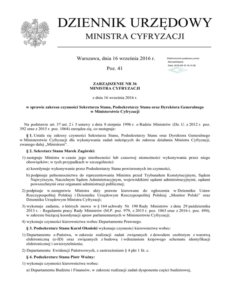 DZIENNIK URZĘDOWY MINISTRA CYFRYZACJI Warszawa, dnia 16 września 2016 r. Elektronicznie podpisany przez: Michał Widelski Poz. 41 Data: 2016-09-16 16:14:36 ZARZĄDZENIE NR 36 MINISTRA CYFRYZACJI z dnia 16 września 2016 r. w sprawie zakresu czynności Sekretarza Stanu, Podsekretarzy Stanu oraz Dyrektora Generalnego w Ministerstwie Cyfryzacji Na podstawie art. 37 ust. 2 i 5 ustawy z dnia 8 sierpnia 1996 r. o Radzie Ministrów (Dz. U. z 2012 r. poz. 392 oraz z 2015 r. poz. 1064) zarządza się, co następuje: § 1. Ustala się zakresy czynności Sekretarza Stanu, Podsekretarzy Stanu oraz Dyrektora Generalnego w Ministerstwie Cyfryzacji dla wykonywania zadań należących do zakresu działania Ministra Cyfryzacji, zwanego dalej „Ministrem”. § 2. Sekretarz Stanu Marek Zagórski: 1) zastępuje Ministra w czasie jego nieobecności lub czasowej niemożności wykonywania przez niego obowiązków; w tych przypadkach w szczególności: a) koordynuje wykonywanie przez Podsekretarzy Stanu powierzonych im czynności, b) podpisuje pełnomocnictwa do reprezentowania Ministra przed Trybunałem Konstytucyjnym, Sądem Najwyższym, Naczelnym Sądem Administracyjnym, wojewódzkimi sądami administracyjnymi, sądami powszechnymi oraz organami administracji publicznej; 2) podpisuje w zastępstwie Ministra akty prawne kierowane do ogłoszenia w Dzienniku Ustaw Rzeczypospolitej Polskiej i Dzienniku Urzędowym Rzeczypospolitej Polskiej „Monitor Polski” oraz Dzienniku Urzędowym Ministra Cyfryzacji; 3) wykonuje zadania, o których mowa w § 164 uchwały Nr 190 Rady Ministrów z dnia 29 października 2013 r. - Regulamin pracy Rady Ministrów (M.P. poz. 979, z 2015 r. poz. 1063 oraz z 2016 r. poz. 494), w zakresie bieżącej koordynacji spraw parlamentarnych w Ministerstwie Cyfryzacji; 4) wykonuje czynności kierownictwa wobec Departamentu Prawnego. § 3. Podsekretarz Stanu Karol Okoński wykonuje czynności kierownictwa wobec: 1) Departamentu e-Państwa, w zakresie realizacji zadań związanych z dowodem osobistym z warstwą elektroniczną (e-ID) oraz związanych z budową i wdrażaniem krajowego schematu identyfikacji elektronicznej i uwierzytelnienia; 2) Departamentu Ewidencji Państwowych, z zastrzeżeniem § 4 pkt 1 lit. c. § 4. Podsekretarz Stanu Piotr Woźny: 1) wykonuje czynności kierownictwa wobec: a) Departamentu Budżetu i Finansów, w zakresie realizacji zadań dysponenta części budżetowej, Dziennik Urzędowy Ministra Cyfryzacji –2– Poz. 41 b) Departamentu e-Państwa, w zakresie realizacji zadań związanych z EZD RP oraz związanych z zapewnieniem jednego punktu (bramy) dostępu do usług administracji publicznej oraz informacji publicznej, c) Departamentu Ewidencji Państwowych, w zakresie realizacji zadań związanych z: - centralną ewidencją pojazdów, centralną ewidencją kierowców, centralną ewidencją posiadaczy kart parkingowych, - nadzorem Ministra nad Centralnym Ośrodkiem Informatyki, d) Departamentu Koordynacji Funduszy Europejskich; 2) zapewnia prowadzenie spraw wynikających z nadzoru Ministra nad Centralnym Ośrodkiem Informatyki; 3) zapewnia prowadzenie spraw wynikających ze stosunku podległości wobec Ministra Centrum Projektów Polska Cyfrowa. § 5. Dyrektor Generalny Ministerstwa Cyfryzacji Michał Widelski: 1) wykonuje czynności dyrektora generalnego urzędu określone w ustawie z dnia 21 listopada 2008 r. o służbie cywilnej (Dz. U. z 2016 r. poz. 1345); 2) wykonuje czynności kierownictwa wobec: a) Biura Dyrektora Generalnego, b) Departamentu Budżetu i Finansów, z wyłączeniem spraw, o których mowa w § 4 pkt 1 lit. a. § 6. Spory kompetencyjne w sprawach wymienionych w § 2 – 5 rozstrzyga Minister. § 7. Sekretarz Stanu oraz Podsekretarze Stanu uczestniczą w posiedzeniach Sejmu Rzeczypospolitej Polskiej i Senatu Rzeczypospolitej Polskiej oraz komisji sejmowych i senackich, a także komitetów Rady Ministrów, z zastrzeżeniem § 9 ust. 1 pkt 1, jeżeli rozpatrywane sprawy należą do zakresu powierzonych im zadań. § 8. Sekretarz Stanu oraz Podsekretarze Stanu udzielają odpowiedzi na wystąpienia posłów i senatorów oraz komisji sejmowych i senackich, które dotyczą spraw należących do ich zakresu działania. § 9. 1. Zakresy czynności Sekretarza Stanu, z zastrzeżeniem § 2 pkt 1 i 2, oraz Podsekretarzy Stanu, nie obejmują: 1) udziału w posiedzeniach Rady Ministrów, Rady do Spraw Cyfryzacji oraz Komitetu Rady Ministrów do spraw Cyfryzacji; 2) podejmowania decyzji o: a) wystąpieniu z wnioskiem do Prezesa Rady Ministrów o powołanie lub odwołanie ze stanowiska, b) zwolnieniu ze stanowiska, c) powołaniu albo wyznaczeniu przedstawicieli Ministra do zespołów, rad i komisji, a także ich odwołaniu, gdy przepis prawa zastrzega takie uprawnienie dla Ministra, d) zmianie przeznaczenia środków budżetowych w resorcie cyfryzacji; 3) podpisywania: a) aktów prawnych kierowanych do ogłoszenia w Dzienniku Ustaw Rzeczypospolitej Polskiej i Dzienniku Urzędowym Rzeczypospolitej Polskiej „Monitor Polski” oraz Dzienniku Urzędowym Ministra Cyfryzacji, b) innych aktów prawnych zastrzeżonych do wyłącznej właściwości Ministra; 4) udzielania pełnomocnictw. 2. Sekretarz Stanu, z zastrzeżeniem § 2 pkt 1 i 2, oraz Podsekretarze Stanu mogą wykonywać czynności, o których mowa w ust. 1, wyłącznie na podstawie odrębnego pisemnego upoważnienia Ministra. 3. Minister sprawuje nadzór nad wykonywaniem zadań przez: Dziennik Urzędowy Ministra Cyfryzacji –3– Poz. 41 1) Gabinet Polityczny Ministra; 2) Biuro Ministra; 3) Biuro Analiz; 4) Departament Cyberbezpieczeństwa; 5) Departament e-Państwa, z zastrzeżeniem § 3 pkt 1 oraz § 4 pkt 1 lit. b; 6) Departament Infrastruktury Teleinformatycznej; 7) Departament Społeczeństwa Informacyjnego; 8) Departament Telekomunikacji. 4. Minister zapewnia prowadzenie spraw wynikających z nadzoru Ministra nad: 1) Prezesem Urzędu Komunikacji Elektronicznej; 2) Instytutem Łączności – Pań