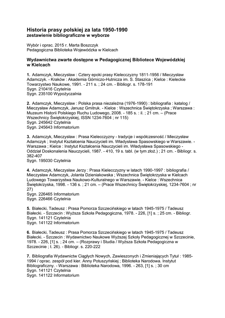 Historia prasy polskiej za lata 1950-1990 zestawienie bibliograficzne w wyborze Wybór i oprac. 2015 r. Marta Boszczyk Pedagogiczna Biblioteka Wojewódzka w Kielcach Wydawnictwa zwarte dostępne w Pedagogicznej Bibliotece Wojewódzkiej w Kielcach 1. Adamczyk, Mieczysław : Cztery epoki prasy Kielecczyzny 1811-1956 / Mieczysław Adamczyk. - Kraków : Akademia Górniczo-Hutnicza im. S. Staszica ; Kielce : Kieleckie Towarzystwo Naukowe, 1991. - 211 s. ; 24 cm. - Bibliogr. s. 178-191 Sygn. 210416 Czytelnia Sygn. 235100 Wypożyczalnia 2. Adamczyk, Mieczysław : Polska prasa niezależna (1976-1990) : bibliografia : katalog / Mieczysław Adamczyk, Janusz Gmitruk. - Kielce : Wszechnica Świętokrzyska ; Warszawa : Muzeum Historii Polskiego Ruchu Ludowego, 2008. - 185 s. : il. ; 21 cm. – (Prace Wszechnicy Świętokrzyskiej, ISSN 1234-7604 ; nr 115) Sygn. 245642 Czytelnia Sygn. 245643 Informatorium 3. Adamczyk, Mieczysław : Prasa Kielecczyzny - tradycje i współczesność / Mieczysław Adamczyk ; Instytut Kształcenia Nauczycieli im. Władysława Spasowskiego w Warszawie. Warszawa ; Kielce : Instytut Kształcenia Nauczycieli im. Władysława Spasowskiego Oddział Doskonalenia Nauczycieli, 1987. - 410, 19 s. tabl. (w tym złoż.) ; 21 cm. - Bibliogr. s. 382-407 Sygn. 195030 Czytelnia 4. Adamczyk, Mieczysław Jerzy : Prasa Kielecczyzny w latach 1990-1997 : bibliografia / Mieczysław Adamczyk, Jolanta Dzieniakowska ; Wszechnica Świętokrzyska w Kielcach Ludowego Towarzystwa Naukowo-Kulturalnego w Warszawie. - Kielce : Wszechnica Świętokrzyska, 1998. - 136 s. ; 21 cm. – (Prace Wszechnicy Świętokrzyskiej, 1234-7604 ; nr 27) Sygn. 226465 Informatorium Sygn. 226466 Czytelnia 5. Białecki, Tadeusz : Prasa Pomorza Szczecińskiego w latach 1945-1975 / Tadeusz Białecki. - Szczecin : Wyższa Szkoła Pedagogiczna, 1978. - 226, [1] s. ; 25 cm. - Bibliogr. Sygn. 141121 Czytelnia Sygn. 141122 Informatorium 6. Białecki, Tadeusz : Prasa Pomorza Szczecińskiego w latach 1945-1975 / Tadeusz Białecki. - Szczecin : Wydawnictwo Naukowe Wyższej Szkoły Pedagogicznej w Szczecinie, 1978. - 226, [1] s. ; 24 cm. – (Rozprawy i Studia / Wyższa Szkoła Pedagogiczna w Szczecinie ; t. 26). - Bibliogr. s. 220-222 7. Bibliografia Wydawnictw Ciągłych Nowych, Zawieszonych i Zmieniających Tytuł : 19851994 / oprac. zespół pod kier. Anny Potuszyńskiej ; Biblioteka Narodowa. Instytut Bibliograficzny. - Warszawa : Biblioteka Narodowa, 1996. - 263, [1] s. ; 30 cm Sygn. 141121 Czytelnia Sygn. 141122 Informatorium 8. Chwastyk-Kowalczyk, Jolanta : Londyński "Dziennik Polski i Dziennik Żołnierza" 19441989 : gazeta codzienna jako środek przekazu komunikatów kulturowych / Jolanta Chwastyk-Kowalczyk. - Kielce : Wydawnictwo Uniwersytetu Humanistyczno-Przyrodniczego Jana Kochanowskiego, 2008. - 482, [2] s. : il. ; 24 cm. - Bibliogr. s. 437-447 Sygn. 244529 Czytelnia 9. 10. Co nam zostało z tych lat : 80-lecie "Bibliotekarza" i 50-lecie "Poradnika Bibliotekarza" / [red. tomu Janusz Nowicki]. - Warszawa : Wydawnictwo SBP, 2000. - 68 s. : il. ; 21 cm. – (Propozycje i Materiały / Stowarzyszenie Bibliotekarzy Polskich ; 38) Sygn. 230871 Czytelnia 11. Czasopisma społeczno-kulturalne w okresie PRL / pod red. Urszuli Jakubowskiej ; Fundacja Akademia Humanistyczna, Instytut Badań Literackich PAN. - Warszawa : Fundacja Akademia Humanistyczna : Instytut Badań Literackich PAN. Wydawnictwo, cop. 2012. - 593, [2] s. ; 24 cm. - Bibliogr. s. 530-571 Sygn. 252596 Czytelnia 12. Czasopisma studenckie w Polsce (1945-1970) / pod red. Andrzeja K. Waśkiewicza. Warszawa : Zarząd Główny Socjalistycznego Związku Studentów Polskich, 1975. - 398 s. : il. ; 24 cm. - Bibliogr. s. 303-354 Sygn. 126781 Czytelnia Sygn. 126782 Wypożyczalnia Sygn. 126783 Informatorium 13. Czasopiśmiennictwo hutnicze w Polsce / pod red. Jerzego Jarosa. - Katowice : Uniwersytet Śląski, 1979. - 110 s. ; 24 cm. – (Historia i Współczesność ; 4) (Prace Naukowe Uniwersytetu Śląskiego w Katowicach ; nr 316) Sygn. 169394 Wypożyczalnia 14. Czasopiśmiennictwo pedagogiczne w Polsce Ludowej : praca zbiorowa / pod red. Franciszka Filipowicza. - Warszawa : Wydawnictwa Szkolne i Pedagogiczne, 1982. - 230, [2] s. ; 21 cm Sygn. 159557 Czytelnia Sygn. 159558 Informatorium Sygn. 159559 Wypożyczalnia 15. Dybowiczowa, Leokadia : Skróty tytułów czasopism i wydawnictw zbiorowych wychodzących w Polsce w latach 1945-1965 / Leokadia Gorzelska-Dybowicz, Irena Olszewska ; Biblioteka Narodowa. - Warszawa : BN, 1968. - 131, [1] s. ; 21 cm. – (Prace Instytutu Bibliograficznego / Biblioteka Narodowa ; nr 10) Sygn. 58172 Informatorium 16. Gzella, Alojzy Leszek : Prasa lubelska 1944-1974 / Alojzy Leszek Gzella. - Lublin : Wydawnictwo Lubelskie, 1974. - 312 s. : il., err. ; 20 cm Sygn. 109758 Informatorium Sygn. 109759 Wypożyczalnia 17. Habielski, Rafał : Polityczna historia mediów w Polsce w XX wieku / Rafał Habielski. Warszawa : Wydawnictwa Akademickie i Profesjonalne, 2009. - 410, [2] s. ; 24 cm. – (Edukacja Medialna). - Bibliogr. s. 380-392 Sygn. 246221 Czytelnia 18. Hofman, Iwona : Zjednoczona Europa w publicystyce paryskiej "Kultury" / Iwona Hofman. - Lublin : "Morpol", 2001. - 126 s. ; 24 cm. - Bibliogr. s. 109-120 Sygn. 231361 Wypożyczalnia 19. Jaworska, Justyna : Cywilizacja "Przekroju" : misja obyczajowa w magazynie ilustrowanym / Justyna Jaworska. - Warszawa : Wydawnictwa Uniwersytetu Warszawskiego, cop. 2008. - 291, [5] s., [8] s. tabl. : il. ; 21 cm. – (Communicare : historia i kultura). Bibliogr. s. 277-283 Sygn. 247753 Czytelnia 20. Katalog Prasy Polskiej / Biuro Wydawnicze "Ruch" i Zakład Badań Prasoznawczych ; [red. Józef Burczak]. - Warszawa : Biuro Wydawnicze Ruch : Zakład Badań Prasoznawczych, 1957-[1963]. - 23 cm Sygn. 1816 B/P Informatorium 21. Katalog Prasy Polskiej 1993 / Uniwersytet Jagielloński. Ośrodek Badań Prasoznawczych ; oprac. Sylwester Dziki [et al.]. - Kraków : Ośrodek Badań Prasoznawczych UJ, 1993. - [6], 172 s. ; 30 