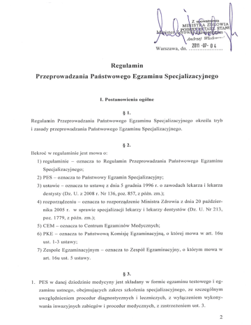 2. Każda część PES oceniana jest oddzielnie. 3. W przypadkach, o których mowa w art. 16r ust. 9 ustawy PES może być ograniczony tylko do egzaminu ustnego. § 4. 1. PES dla każdej dziedziny organizuje CEM. 2. PES przeprowadza PKE, której przewodniczy Przewodniczący. 3. W celu przeprowadzenia PES w ustalonych miejscach i terminach dyrektor CEM wyznacza Zespoły Egzaminacyjne, wskazując ich Przewodniczących. § 5. Osoby zdające obowiązane są podporządkować się poleceniom członków Zespołu Egzaminacyjnego. § 6. Nadzór nad prawidłowym przebiegiem PES sprawuje Zespół Egzaminacyjny, który go przeprowadza. II. Egzamin testowy § 7. 1. Egzamin testowy jest sprawdzianem wiadomości teoretycznych z zakresu objętego programem danej specjalizacji. 2. Egzamin testowy składa się z zestawu 120 zadań, opracowanego w formie książeczki testowej. Każde zadanie zawiera 5 możliwych odpowiedzi, przy czym tylko jedna jest prawidłowa. Za wskazanie jednej, poprawnej odpowiedzi osoba zdająca otrzymuje jeden punkt. Za wskazanie dwu albo więcej odpowiedzi albo brak odpowiedzi osoba zdająca otrzymuje zero punktów. 3. Egzamin testowy dla danej dziedziny jest przeprowadzany dla wszystkich lekarzy w skali kraju jednocześnie, w terminie i miejscu ustalonym przez dyrektora CEM. § 8. 1. W dniu egzaminu testowego CEM dostarcza na miejsce egzaminu karty testowe oraz książeczki testowe, w paczkach, w których liczba książeczek testowych odpowiada liczbie osób zdających w poszczególnych salach egzaminacyjnych zwiększonej maksymalnie o 10%. 3 2. Książeczki testowe są zabezpieczone w sposób uniemożliwiający zapoznanie się z ich treścią przez osoby nieuprawnione. 3. Usunięcie zabezpieczeń i ujawnienie treści zadań egzaminu testowego następuje w sali egzaminacyjnej bezpośrednio przed rozpoczęciem egzaminu testowego w obecności osób zdających. 4. W trakcie egzaminu testowego zabronione jest wynoszenie lub usuwanie w inny sposób książeczek testowych z sali egzaminacyjnej. § 9. 1. Karta testowa oznaczona jest numerem kodowym osoby zdającej, nadanym przez CEM, po ustaleniu przez CEM listy osób przystępujących do egzaminu testowego. 2. W celu zapewnienia anonimowości osób zdających, zabrania się wpisywania na karcie testowej danych umożliwiających identyfikację osoby zdającej. 3. Dla potwierdzenia identyfikacji osoby zdającej, jest ona zobowiązana nanieść własnoręcznie na czystej stronie karty testowej napis o treści: „Centrum Egzaminów Medycznych - egzamin testowy w dziedzinie ..................................................... ” (określenie dziedziny). 4. Karta testowa jest jedynym dokumentem przeznaczonym do udzielania odpowiedzi w trakcie egzaminu testowego. 5. Karta testowa powinna być wypełniana za pomocą ołówka. Dopuszcza się jednak wypełnienie jej za pomocą długopisu. W takim jednak przypadku osoba zdająca traci możliwość dokonywania korekty uprzednio zaznaczonych odpowiedzi. § 10. 1. Wchodzenie osób przystępujących do egzaminu testowego do sali egzaminacyjnej następuje w ciągu 30 min. przed rozpoczęciem egzaminu. 2. W momencie wejścia osoby przystępującej do egzaminu testowego do sali egzaminacyjnej, przedstawiciele CEM albo członkowie Zespołu Egzaminacyjnego na podstawie dokumentu potwierdzającego tożsamość, sprawdzają jej tożsamość oraz wręczają kartę testową. 3. Osoby nieposiadające dokumentu potwierdzającego ich tożsamość, nie mogą przystąpić do egzaminu testowego. § 11. 1. W przypadku gdy do przeprowadzenia egzaminu testowego zgłosi się mniej niż 3 członków Zespołu Egzaminacyjnego, egzamin nie może być przeprowadzony. O fakcie tym Przewodniczący Zespołu Egzaminacyjnego informuje niezwłocznie dy- 4 rektora CEM. 2. W przypadku, o którym mowa w ust. 1, nie jest dopuszczalne usunięcie zabezpieczeń książeczek testowych i ujawnienie treści zadań egzaminu testowego. 3. Przewodniczący Zespołu Egzaminacyjnego informuje zdających o zaniechaniu przeprowadzania egzaminu testowego oraz odnotowuje okoliczności, o których mowa w ust. 1-3, w protokole, o którym mowa w § 31 ust. 1. 4. Przewodniczący Zespołu Egzaminacyjnego przekazuje do CEM materiały egzaminacyjne oraz pozostałą dokumentację egzaminacyjną przeznaczoną na egzamin testowy, który nie odbył się. 5. W przypadku nieobecności Przewodniczącego Zespołu Egzaminacyjnego, czynności o których mowa w ust. 1, 3 i 4 dokonuje jeden z członków Zespołu Egzaminacyjnego. 6. W przypadku, o którym mowa w ust. 1, egzamin testowy jest przeprowadzany w terminie wyznaczonym przez dyrektora CEM, który powinien przypaść nie później niż w okresie 3 miesięcy od dnia egzaminu testowego, który nie odbył się. O nowym terminie egzaminu testowego osoby do niego przystępujące informowane są przez CEM przesyłką poleconą. § 12. 1. Po zajęciu miejsc w sali egzaminacyjnej przez wszystkie osoby przystępujące do egzaminu testowego, przedstawiciel CEM albo Przewodniczący Zespołu Egzaminacyjnego: 1) informuje o organizacji i przebiegu egzaminu testowego; 2) poleca zdeponować wszelkie notatki, zeszyty, torby, teczki itp. w miejscu przez siebie wskazanym; 3) przypomina o obowiązku wyłączenia zdeponowanych telefonów komórkowych i innych urządzeń służących do kopiowania, przekazywania i odbioru informacji; 4) informuje o zakazie posiadania urządzeń służących do kopiowania, przekazywania i odbioru informacji, w szczególności telefonów komórkowych oraz o konsekwencjach naruszenia tego zakazu oraz o możliwości ich zdeponowania. 2. Osoby przystępujące do egzaminu testowego mogą zdeponować posiadane urządzenia służące do kopiowania, przekazywania i odbioru informacji, w szczególności telefony komórkowe, w miejscu wskazanym przez Przewodniczącego Zespołu Egzaminacyjnego. Urządzenia te umieszczane są w kopertach oznaczonych imieniem i nazwiskiem osoby deponującej, zaklejanych w jej