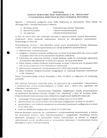 PROTOKÓŁ KOMI S J I R E WI Z Y J N E J R ADY N A D Z O R C Z E J S. M. " M E T A L U R G " Z P O S I E D Z E N I A O D B Y T E G O W DNI U 18 MA R C A 2015 ROKU Zgodnie z ustaleniami podjętymi przez Radę Nadzorczą na posiedzeniu, które odbyto się 18 lutego 2015 r. Komisja Rewizyjna w składzie: 1. Mirosław Janicki 2. Ryszard Murzyński 3. Jan Gaertner - Przewodniczący Komisji Rewizyjnej Członek Komisji Rewizyjnej Członek Komisji Rewizyjnej w dniu 18 marca 2015 roku wykonała czynności w zakresie kontroli i analizy dokumentów źródłowych, które stanowiły podstawowy materiał do sporządzenia sprawozdania finansowego za 2014 rok. Przewodniczący Komisji - Pan Mirosław Janicki przed posiedzeniem Komisji Rewizyjnej, w dniu 4 marca br. zalecił przygotowanie przez Zarząd Spółdzielni dokumentów jn: 1. dokumentacji inwentaryzacyjnej, 2. zaległości w opłatach za lokale według stanu na dzień 31 grudnia 2014 roku oraz na dzień 31 grudnia 2013 roku w celu porównania wysokości zadłużenia, 3. materiałów do rozliczenia kosztów z tytułu dostawy ciepła do centralnego ogrzewania do budynków SM „Metalurg" za okres od 1 stycznia do 31 grudnia 2014r. 4. wykaz stanów środków funduszu remontowego na dzień 1 stycznia oraz 31 grudnia 2014 roku na poszczególnych nieruchomościach i budynkach, 5. dokumentów związanych z przeprowadzonymi w 2014 roku pracami remontowymi, 6. spłaty kredytów długoterminowych zaciągniętych na realizację budynków mieszkalnych w SM „Metalurg". Pismo Przewodniczącego Komisji Rewizyjnej z dnia 4.3.2015r. w załączeniu do niniejszego protokołu. Ad.l Komisja Rewizyjna rozpoczęła pracę od zapoznania się z protokołem i dokumentami z inwentaryzacji rocznej przeprowadzonej w drodze spisu z natury oraz uzgodnień sald z bankami i kontrahentami. Komisja stwierdziła, że inwentaryzacja składników majątkowych została przeprowadzona na podstawie Zarządzenia Prezesa Zarządu S.M. „Metalurg" z dnia 30 września 2014r. Przeprowadzona inwentaryzacja stanu składników majątkowych Spółdzielni dotyczyła: • • • rzeczowego i finansowego majątku trwałego według stanu na 31.12.2014r. potwierdzenia sald rozrachunków z kontrahentami według stanu na dzień 31.10.2014 r, potwierdzenia sald środków pieniężnych na rachunkach bankowych według stanu na dzień 31.12.2014 roku, • funduszy Spółdzielni według stanu na dzień 31.12.2014 roku. Komisja Rewizyjna zapoznała się z protokołem z przeprowadzonej inwentaryzacji, w którym nie stwierdzono żadnych różnic inwentaryzacyjnych i niezgodności. Weryfikacja arkuszy spisowych, polegająca na porównaniu stanów rzeczywistych ze stanem w księgach rachunkowych została przedstawiona w sprawozdaniu końcowym z inwentaryzacji rocznej sporządzonym przez Główną Księgową. Ad 2. Następnie Komisja Rewizyjna zapoznała się ze stanem zaległości w opłatach za lokale mieszkalne i lokale o innym przeznaczeniu oraz z informacją o podejmowanych przez Zarząd Spółdzielni działaniach windykacyjnych. Po analizie dokumentów Komisja Rewizyjna stwierdziła, że kwota zadłużenia ogółem z tytułu opłat za zajmowane lokale według stanu na dzień 31.12.2014r. jest niższa o 35 943,40 zł od kwoty zadłużenia z analogicznego okresu 2013 roku. Na zmniejszenie zaległości miały wpływ prowadzone przez Zarząd działania windykacyjne oraz bieżące przekazywanie spraw do sądu dla uzyskania nakazów zapłaty. Po dokonaniu sprawdzeń i analizie dokumentów księgowych Komisji Rewizyjna stwierdziła, że wskaźnik zadłużenia za używanie lokali mieszkalnych liczony do rocznego wymiaru opłat wynosił na koniec 2014 roku 3,95 %. W 2014 roku w wyniku skierowanych do Sądu pozwów w trybie postępowania upominawczego, Spółdzielnia uzyskała 13 nakazów na kwotę 39 393,76 zł. W wyniku podjętych działań egzekucyjnych zostało zrealizowanych 9 nakazów sądowych na kwotę 20 981,86 zł. Aktualnie działaniami windykacyjnymi objętych jest 7 osób. Ad 3. W dalszej kolejności Komisja Rewizyjna przeanalizowała dokumenty dotyczące rozliczania kosztów ciepła do centralnego ogrzewania za okres od 1 stycznia do 31 grudnia 2014 roku. Zgodnie z procedurą obowiązującą w Spółdzielni Komisja Rewizyjna Rady Nadzorczej dokonała przeglądu losowo wybranych dokumentów księgowych stanowiących podstawę rozliczenia kosztów ciepła. Sprawdzeniu podlegały dokumenty źródłowe dotyczące materiałów przygotowanych przez Spółdzielnię i przekazane w styczniu 2015 roku do firmy rozliczającej koszty centralnego ogrzewania tj. do „MINOL ZENNER" Sp. z o.o. w tym m.in. • zestawienie kosztów za 2014 rok dla poszczególnych budynków, ■ zestawienie przychodów tj. wniesionych w 2014 roku zaliczek na poczet kosztów centralnego ogrzewania przez użytkowników o poszczególnych lokali, ■ udziały opłaty stałej w kosztach dostawy ciepła w 2014 roku w poszczególnych budynkach, ■ wykaz ilości zużytego ciepła w poszczególnych budynkach w 2014 roku ■ wykaz współczynników energochłonności (GJ/m2) dla poszczególnych budynków. W zakresie ponoszonych przez Spółdzielnię kosztów, sprawdzeniu podlegały również faktury za dostawę ciepła do centralnego ogrzewania i podgrzania wody wystawione przez TAURON CIEPŁO w Dąbrowie Górniczej za okres od stycznia do marca 2014r. Zgodnie z zaleceniem Komisji Rewizyjnej dodatkowo przedłożono faktury za dostawę ciepła z analogicznego okresu roku poprzedniego dla porównania kosztów ogrzewania lokali mieszkalnych i użytkowych. Dodatkowo Komisja zaleciła wykonanie rozszerzonej analizy wskaźników energochłonności uwzględniających zakres prac modernizacyjnych na poszczególnych budynkach wraz z wnioskami dotyczącymi wpływu wykonania prac termoizolacyjnych na uzyskane wskaźniki. Ad. 4 Kolejnymi czynnościami Komisji Rewizyjnej była analiza stanu środków funduszu remontowego na dzień 1 stycznia oraz 31 grudn